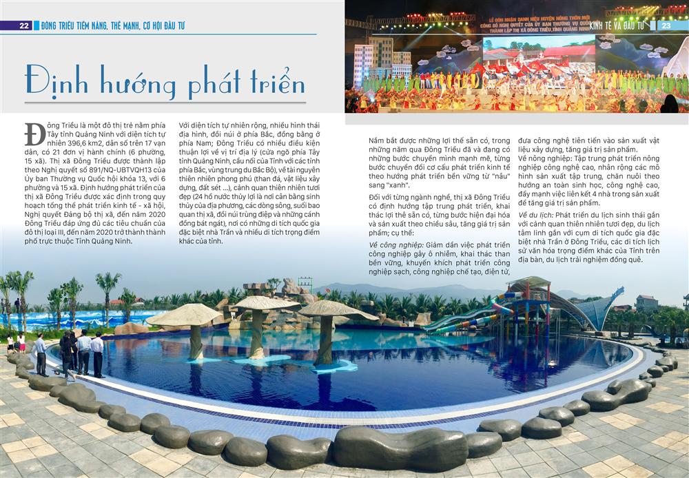 Đông Triều là một đô thị trẻ nằm phía Tây tỉnh Quảng Ninh với diện tích tự nhiên 396,6 km2, dân số trên 17 vạn dân, có 21 đơn vị hành chính (6 phường, 15 xã). Thị xã Đông Triều được thành lập theo Nghị quyết số 891/NQ-UBTVQH13 của Ủy ban Thường vụ Quốc hội khóa 13, với 6 phường và 15 xã. Định hướng phát triển của thị xã Đông Triều được xác định trong quy hoạch tổng thể phát triển kinh tế - xã hội, Nghị quyết Đảng bộ thị xã, đến năm 2020 Đông Triều đáp ứng đủ các tiêu chuẩn của đô thị loại III, đến năm 2020 trở thành thành phố trực thuộc Tỉnh Quảng Ninh.