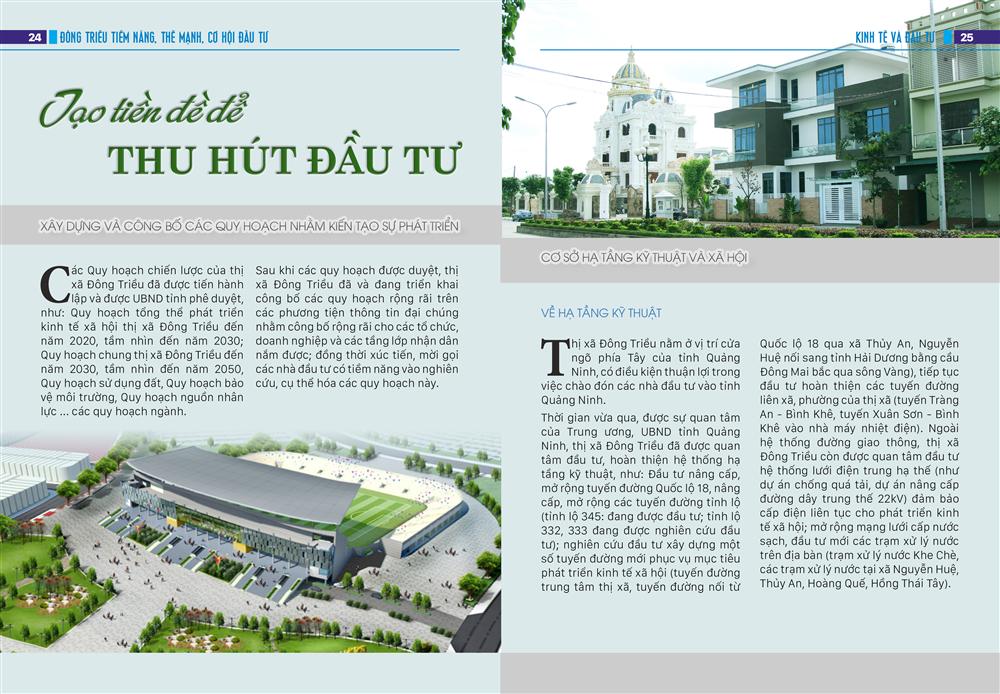 Thành phố Đông Triều nằm ở vị trí cửa ngõ phía Tây của tỉnh Quảng Ninh, có điều kiện thuận lợi trong việc chào đón các nhà đầu tư vào tỉnh Quảng Ninh. Thời gian vừa qua, được sự quan tâm của Trung ương, UBND tỉnh Quảng Ninh, thành phố Đông Triều đã được quan tâm đầu tư, hoàn thiện hệ thống hạ tầng kỹ thuật, như: Đầu tư nâng cấp, mở rộng tuyến đường Quốc lộ 18, nâng cấp, mở rộng các tuyến đường tỉnh lộ (tỉnh lộ 345: đang được đầu tư; tỉnh lộ 332, 333 đang được nghiên cứu đầu tư); nghiên cứu đầu tư xây dựng một số tuyến đường mới phục vụ mục tiêu phát triển kinh tế xã hội (tuyến đường trung tâm thị xã, tuyến đường nối từ