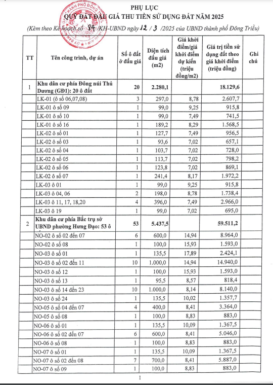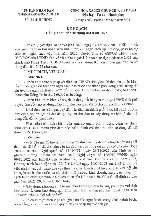 Kế hoạch đấu giá thu tiền sử dụng đất năm 2025 của UBND thành phố Đông Triều