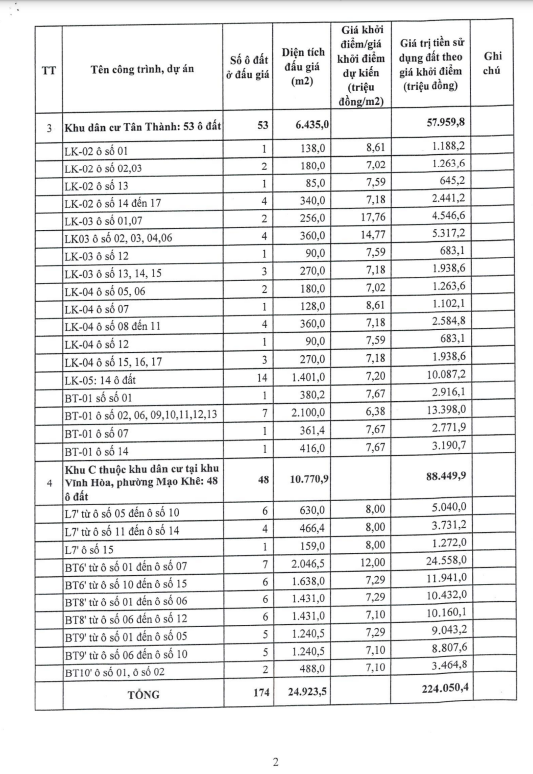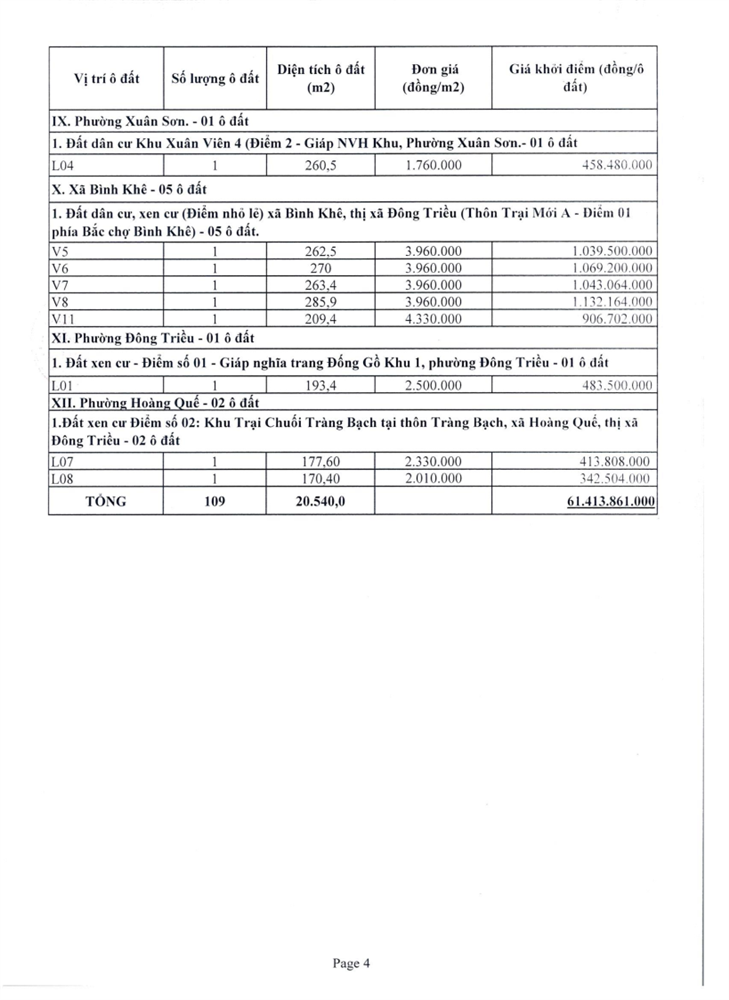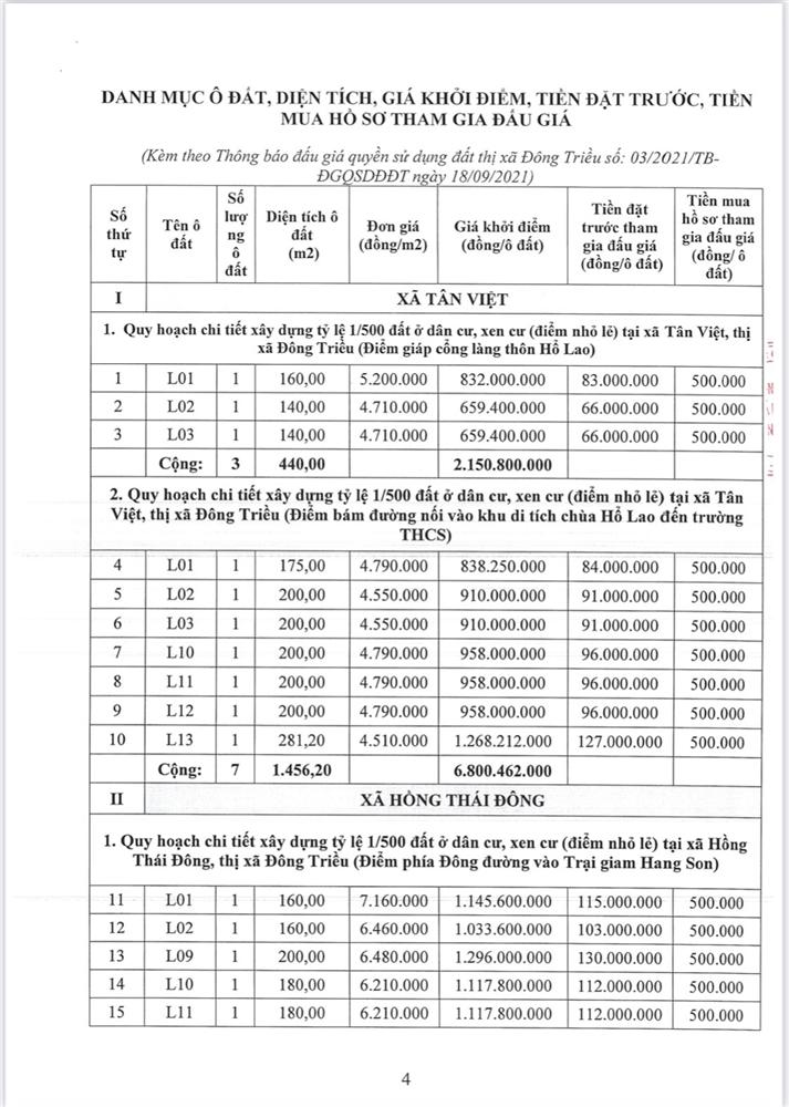 UBND thành phố Đông Triều thông báo Kế hoạch đấu giá thu tiền sử dụng đất Quỹ đất tổ chức đấu giá cho hộ gia đình, cá nhân là 174 ô đất tại 04 vị trí, khu đất cụ thể như sau: