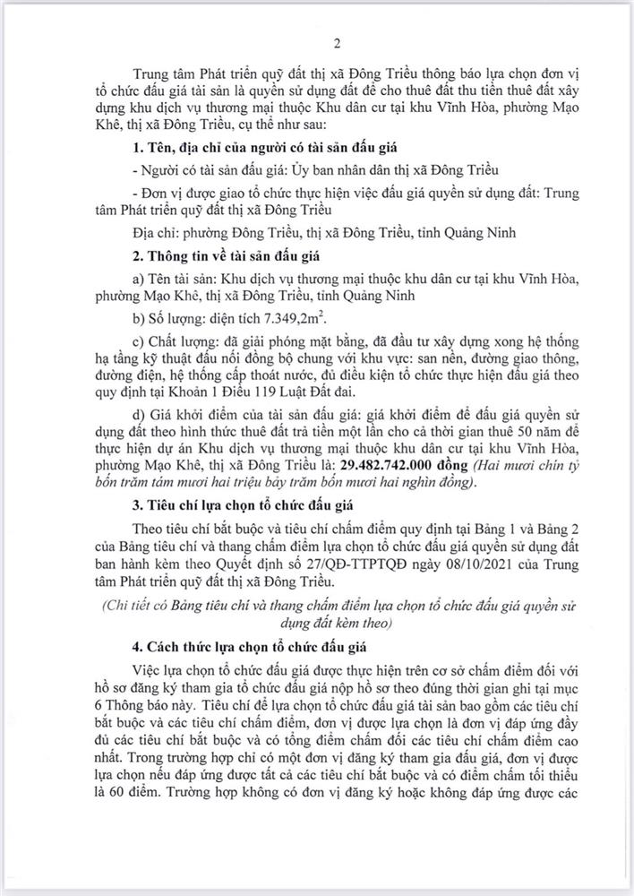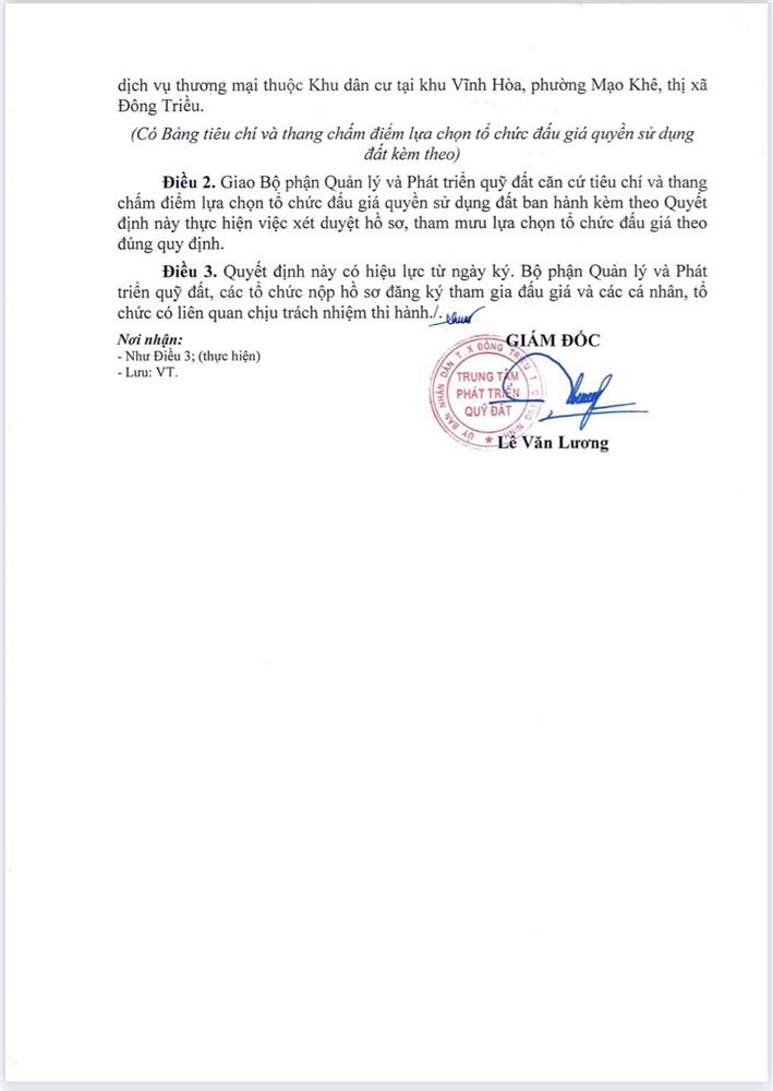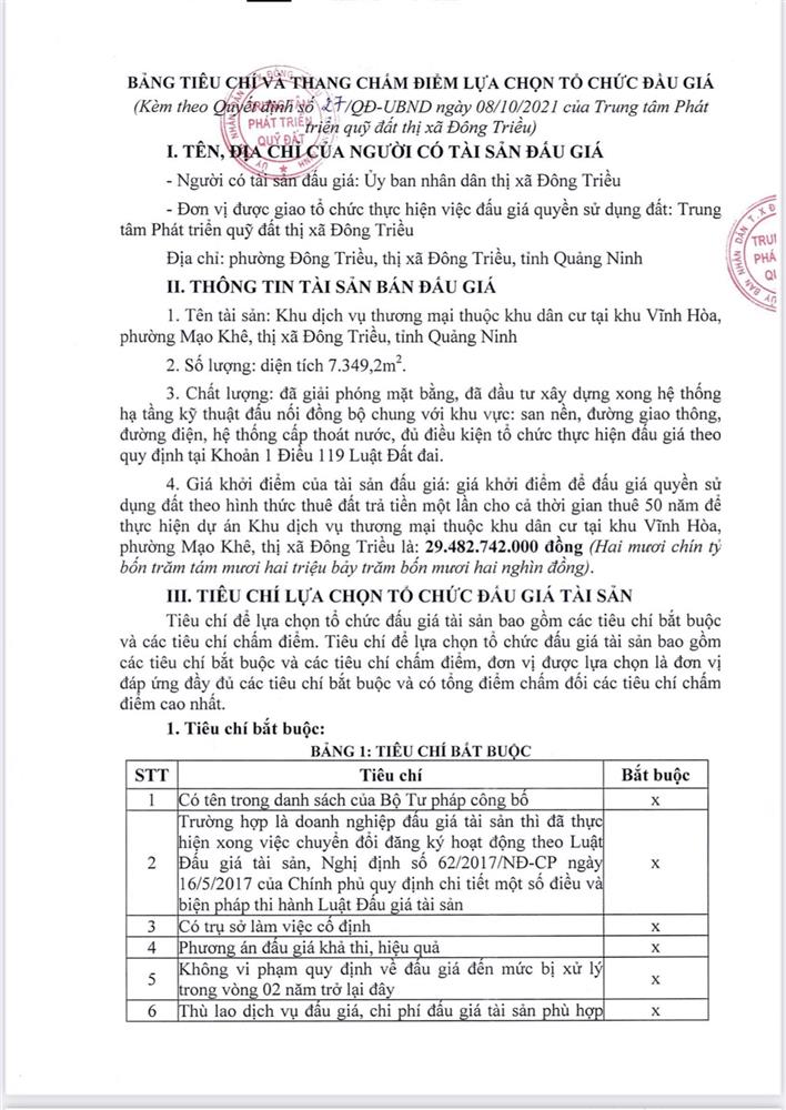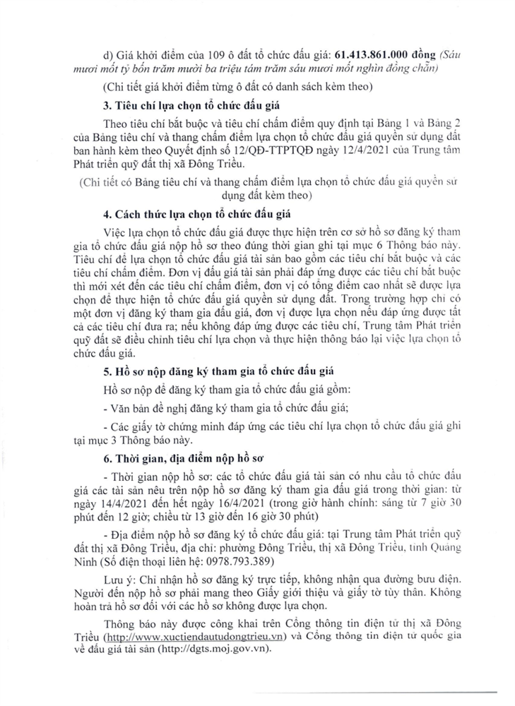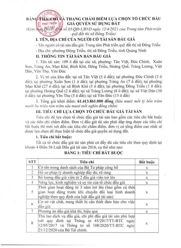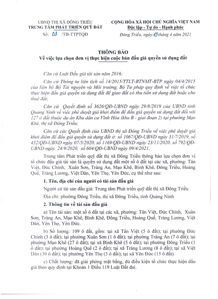Lựa chọn tổ chức đấu giá khu đất thực hiện dự án Khu dân cư (phía Bắc khu dân cư Vĩnh Thông) tại phường Mạo Khê, thị xã Đông Triều và khu đất thực hiện dự án Khu dân cư (phía Đông khu dân cư Vĩnh Thông) tại phường Mạo Khê, thị xã Đông Triều