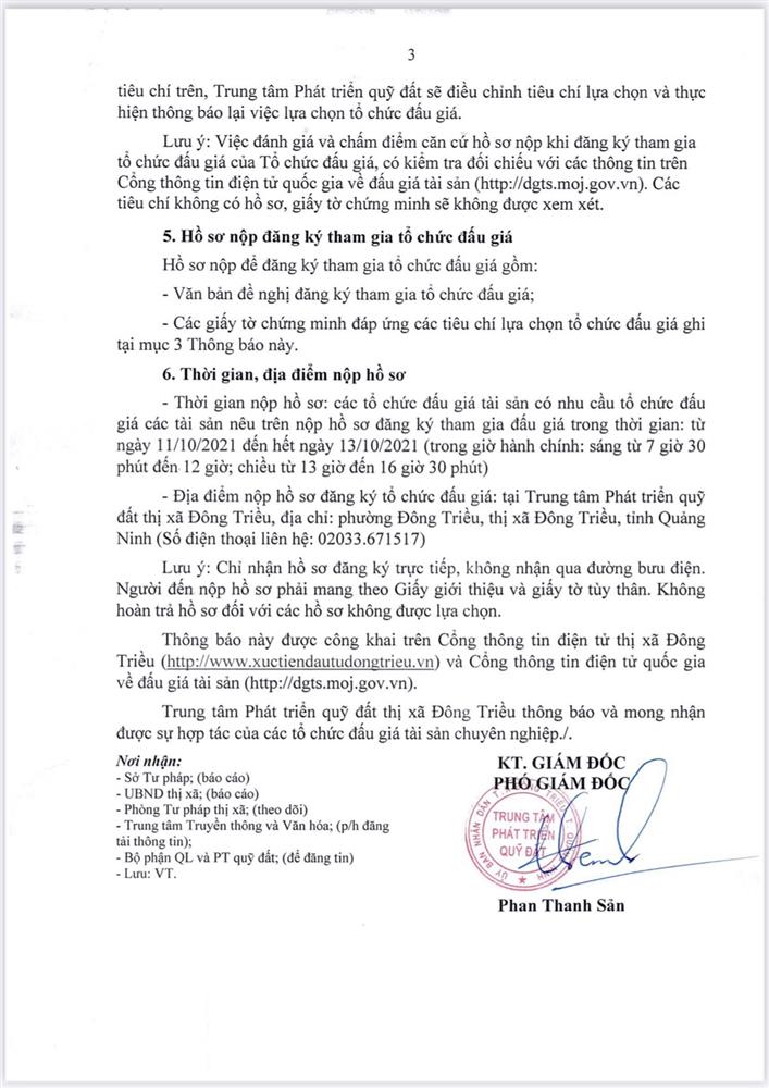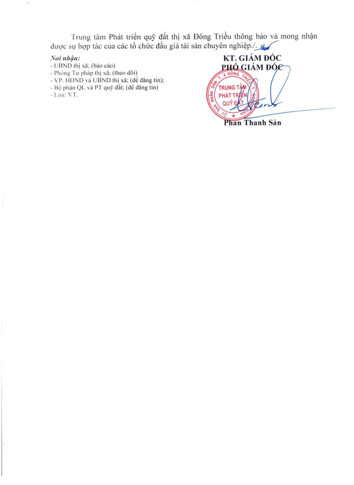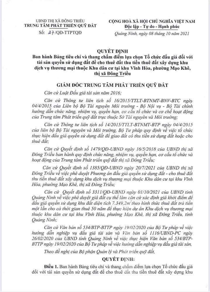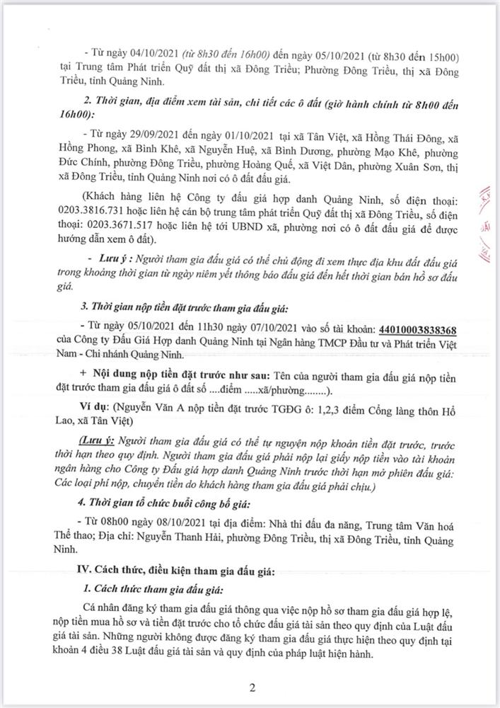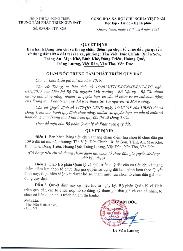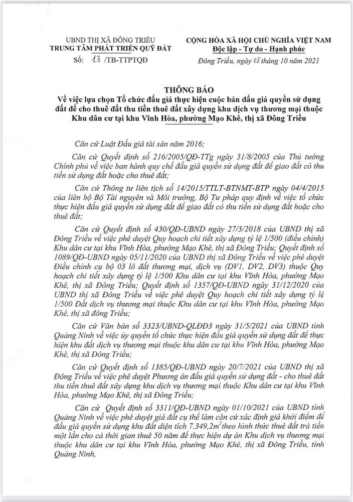 Lựa chọn tổ chức đấu giá khu đất thực hiện dự án Khu dân cư (phía Bắc khu dân cư Vĩnh Thông) tại phường Mạo Khê, thị xã Đông Triều và khu đất thực hiện dự án Khu dân cư (phía Đông khu dân cư Vĩnh Thông) tại phường Mạo Khê, thị xã Đông Triều