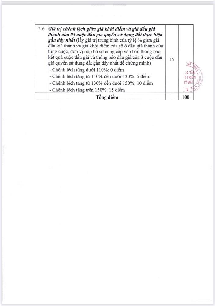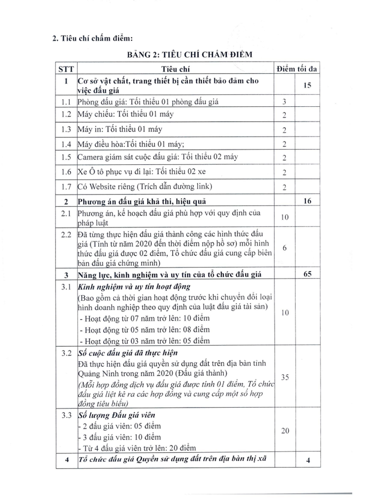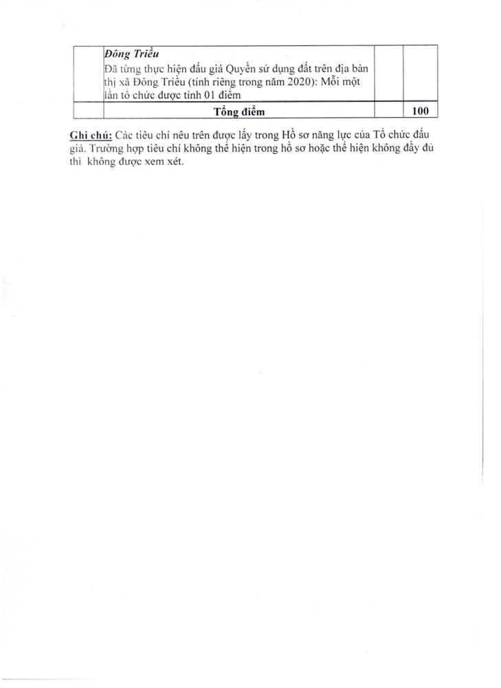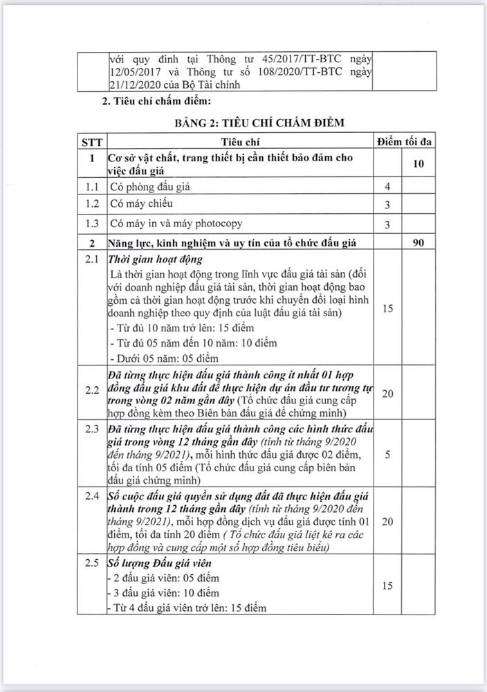 Tiêu chí và thang chấm điểm lựa chọn tổ chức đấu giá quyền sử dụng đất 109 ô đất.