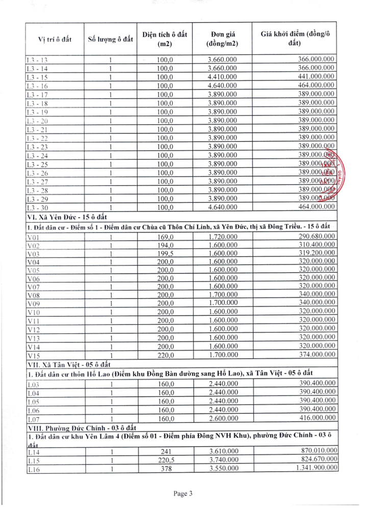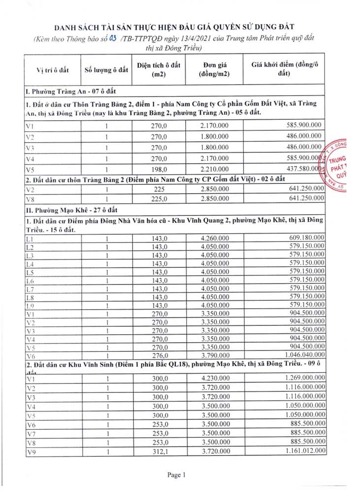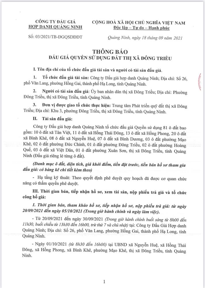 Tên tài sản: một số ô đất tại các xã phường: Tân Việt, Đức Chính, Xuân Sơn, Tràng An, Mạo Khê, Đông Triều, Hoàng Quế, Tràng Lương, Việt Dân, Yên Thọ, Yên Đức.