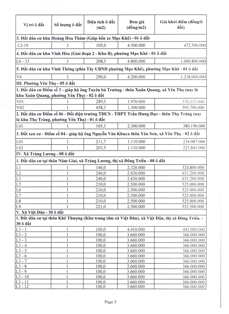 Một số ô đất ở thuộc các xã, phường: Yên Thọ, Hoàng Quế, Bình Dương, Đông Triều, Tràng An, Việt Dân, Bình Khê, thị xã Đông Triều.
