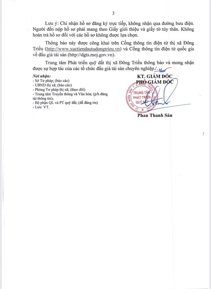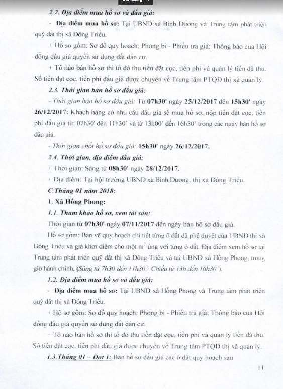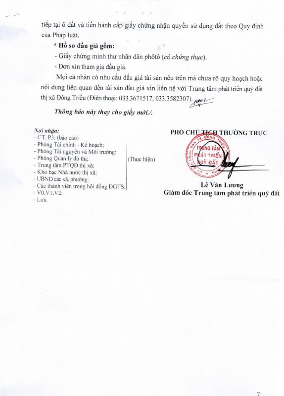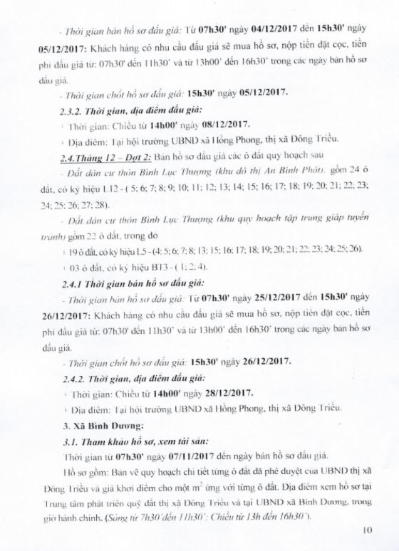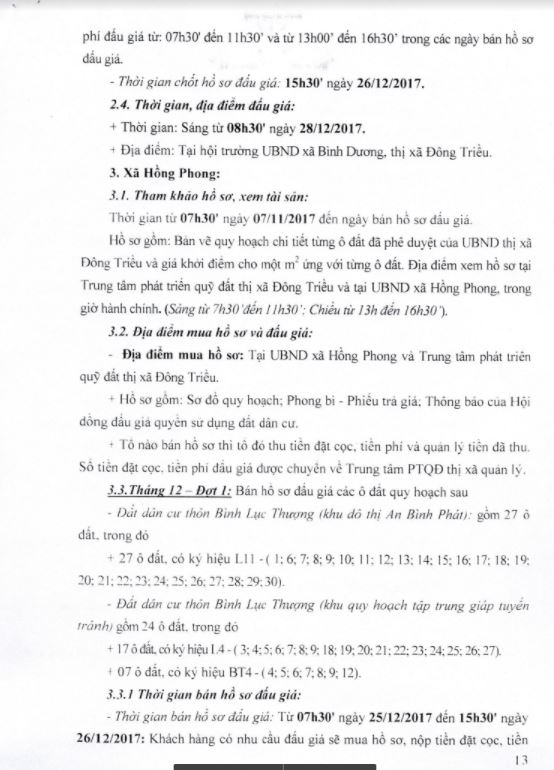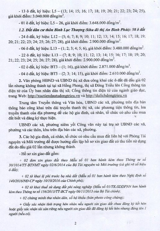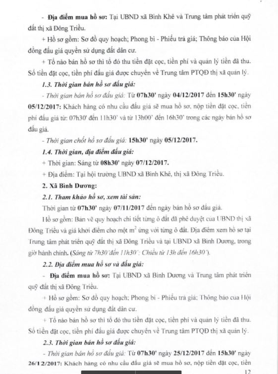 + Địa điểm mua hồ sơ: Tại UBND xã Bình Dương và Trung tâm phát triển quỹ đất thị xã Đông Triều.