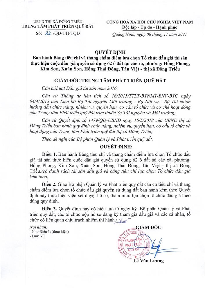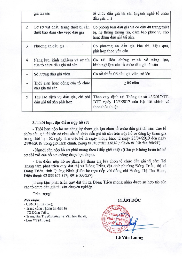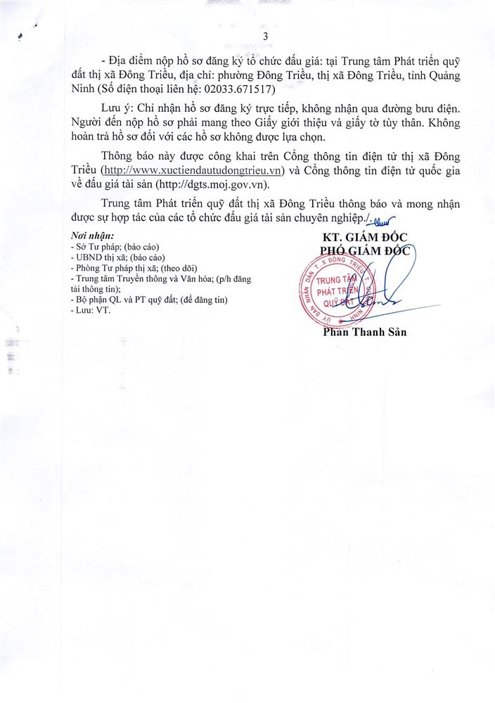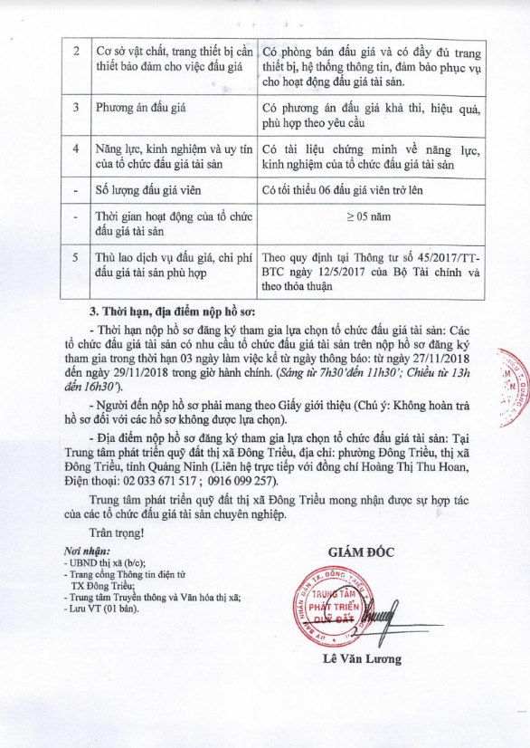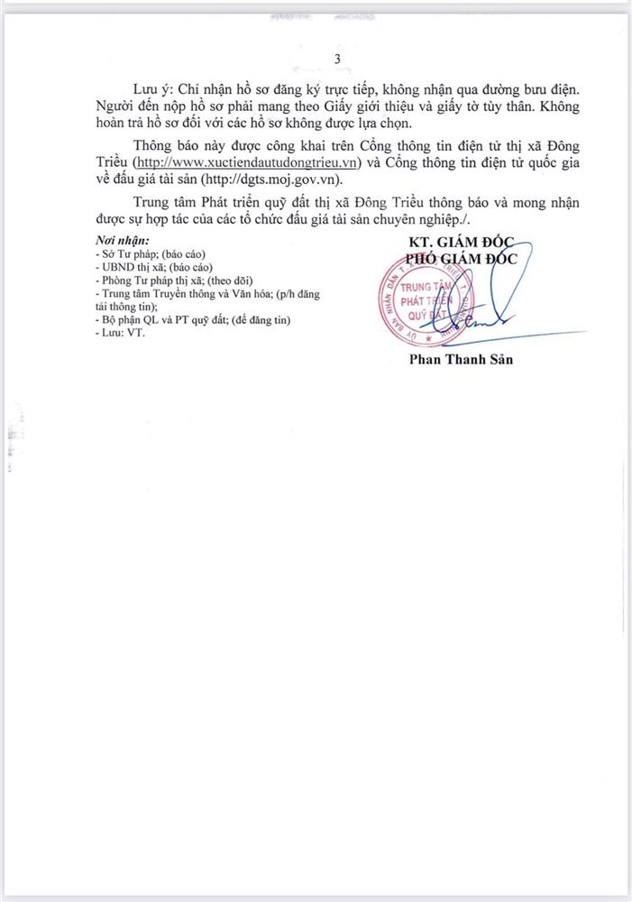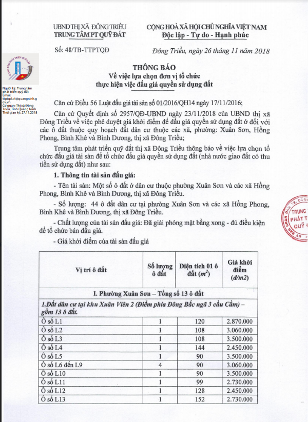 + Địa điểm mua hồ sơ: Tại UBND xã Bình Dương và Trung tâm phát triển quỹ đất thị xã Đông Triều.