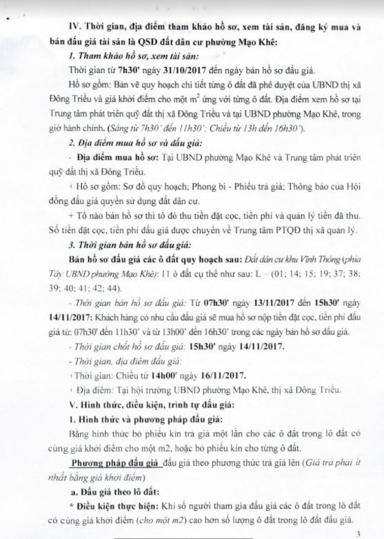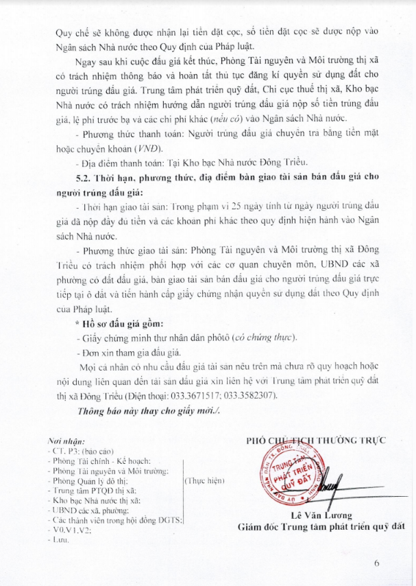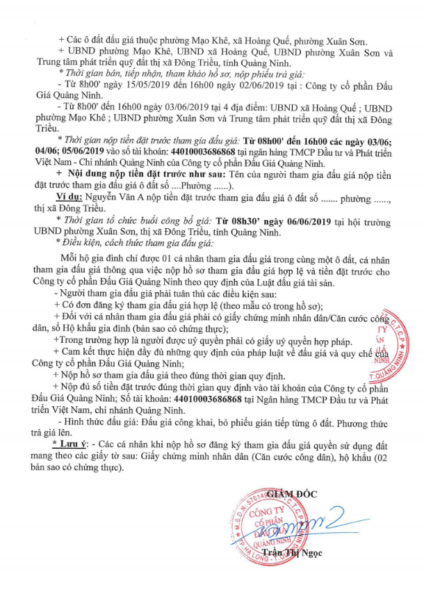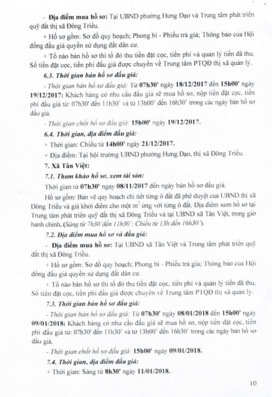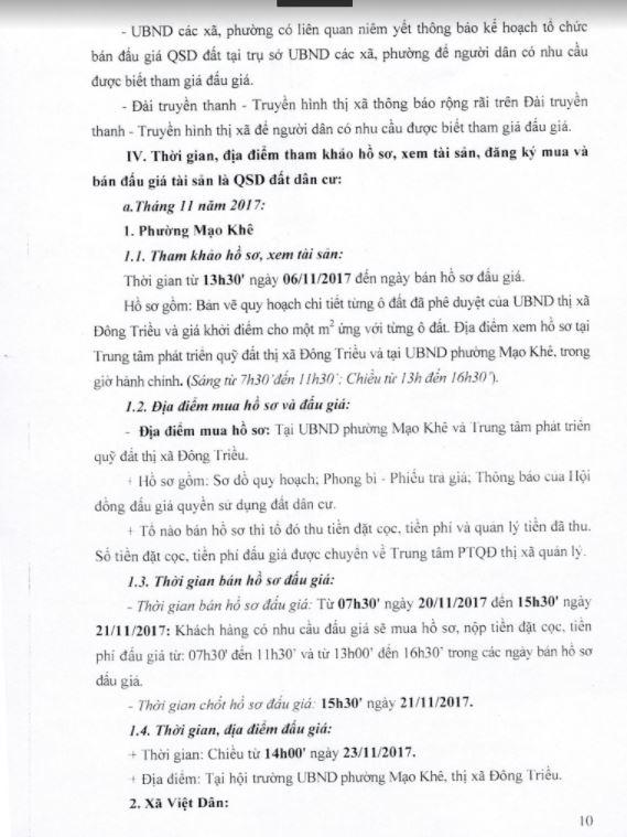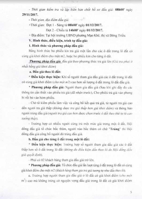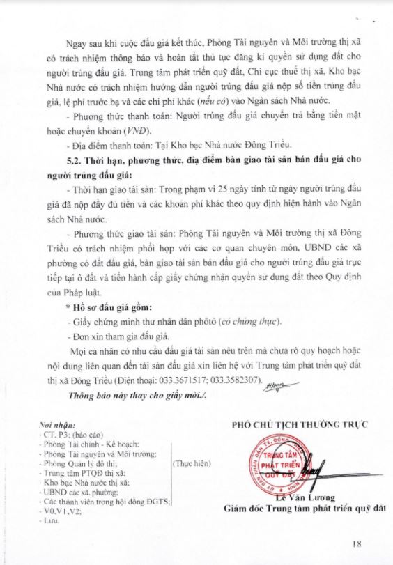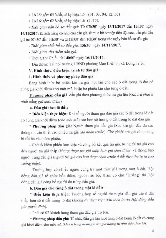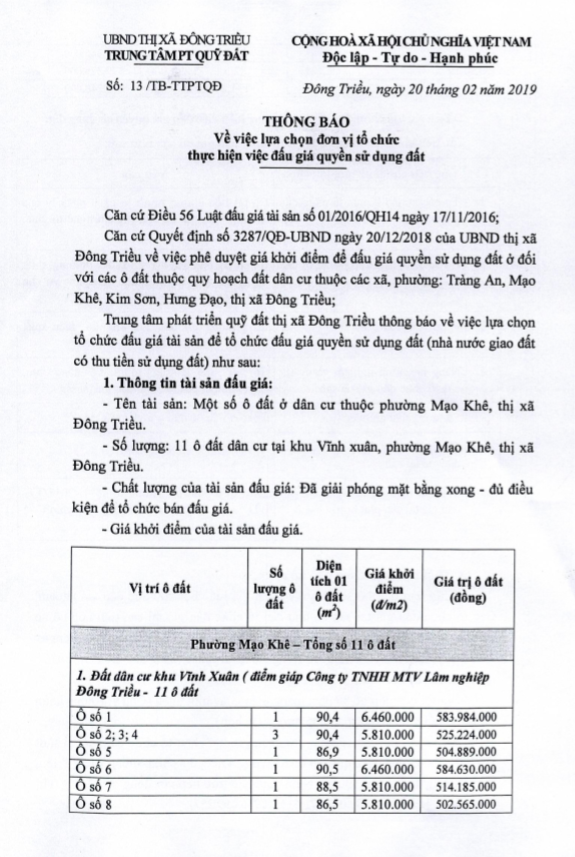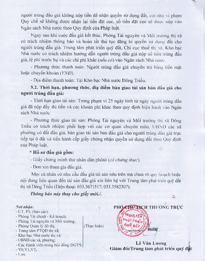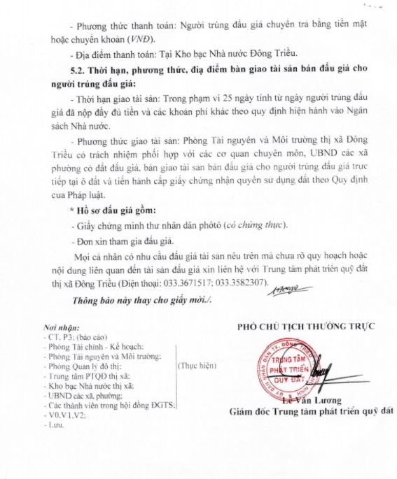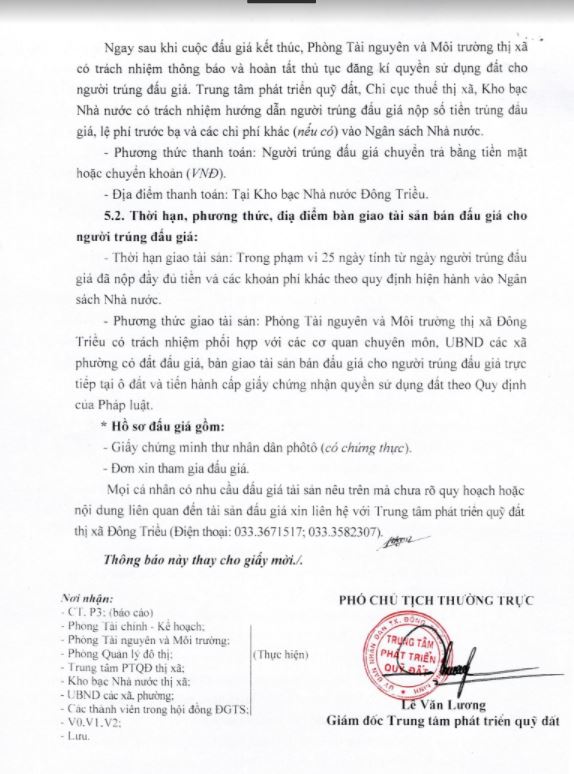 - Địa điểm mua hồ sơ: Tại UBND phường Mạo Khê và Trung tâm phát triển quỹ đất thị xã Đông Triều.