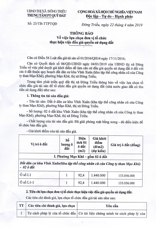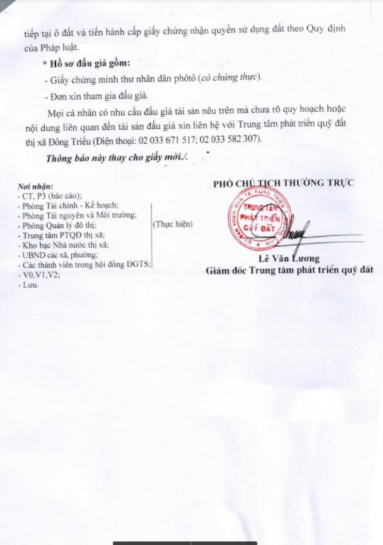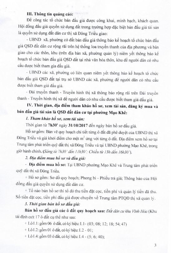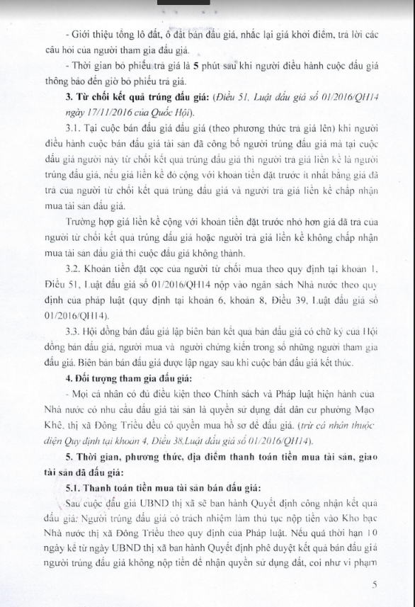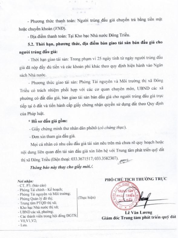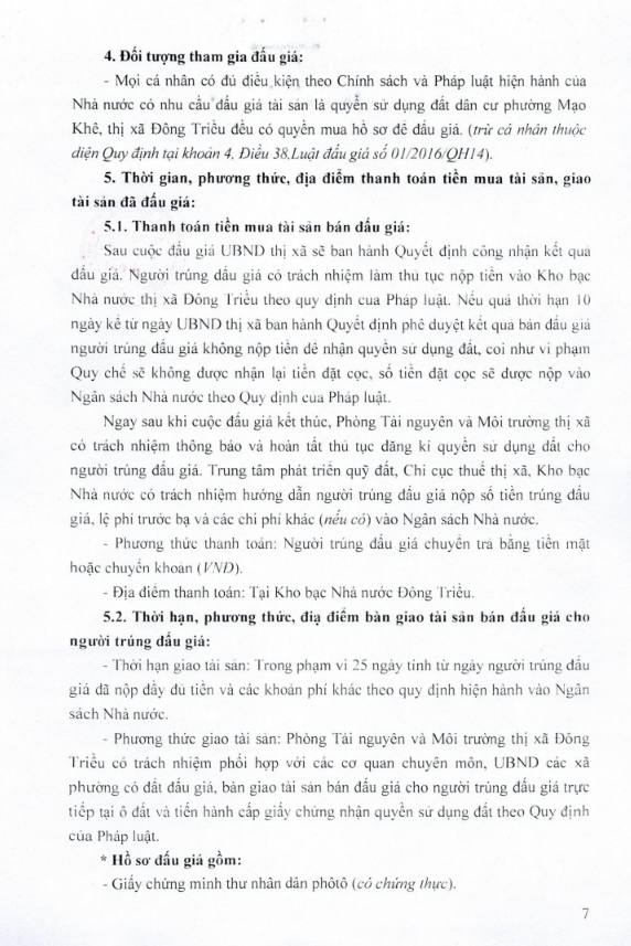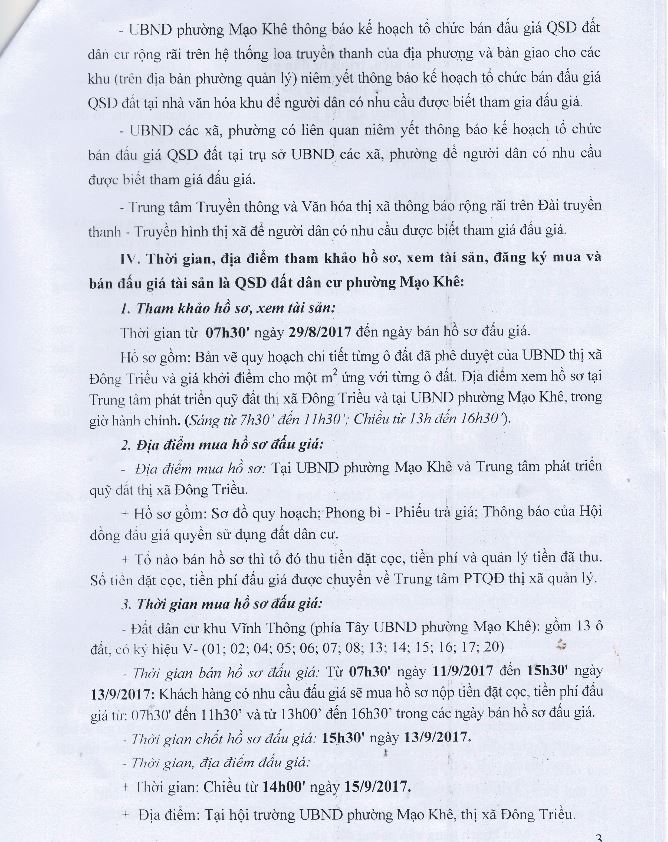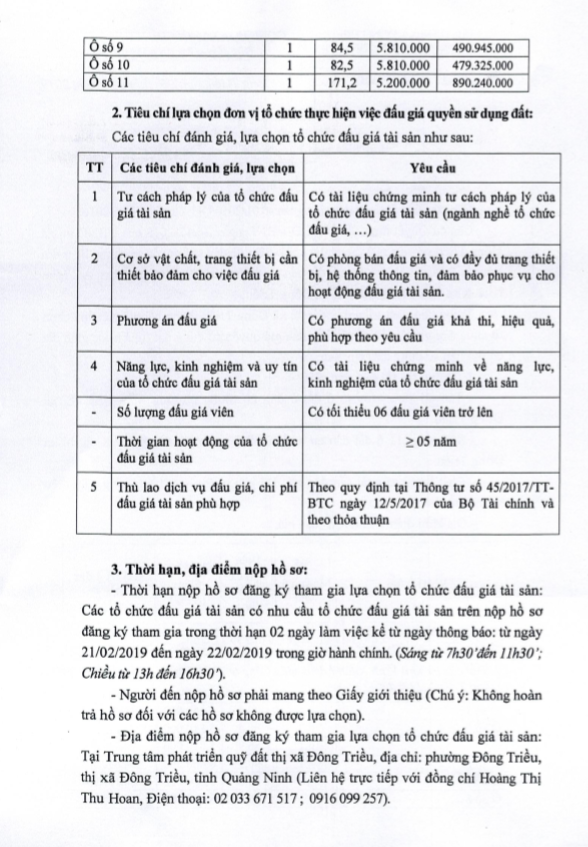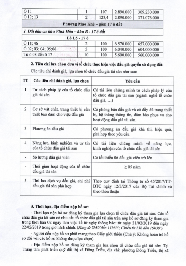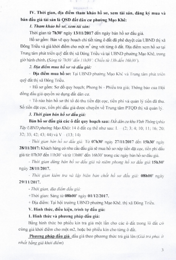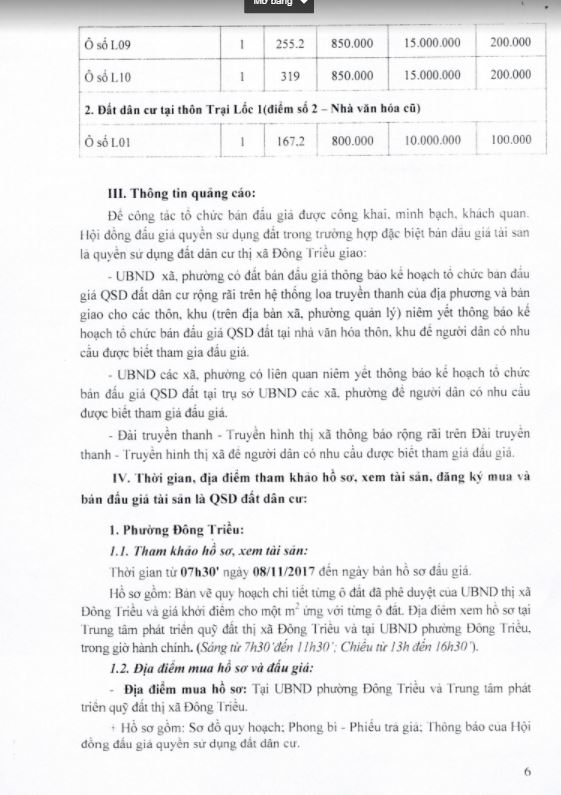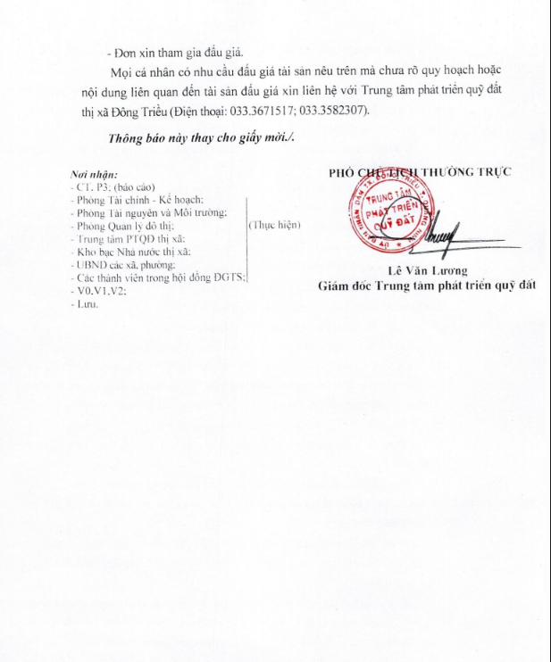 - Địa điểm mua hồ sơ: Tại UBND phường Mạo Khê và Trung tâm phát triển quỹ đất thị xã Đông Triều.