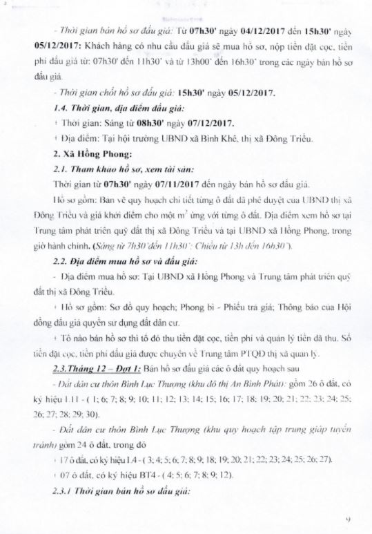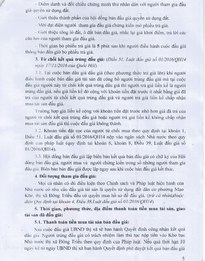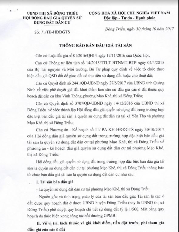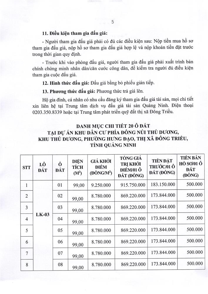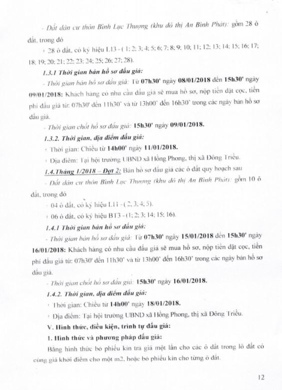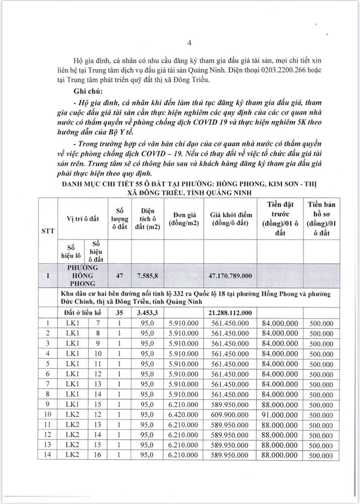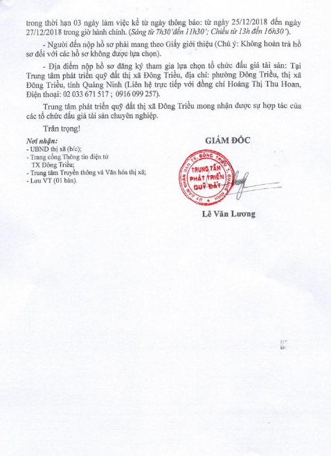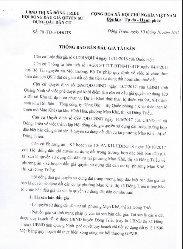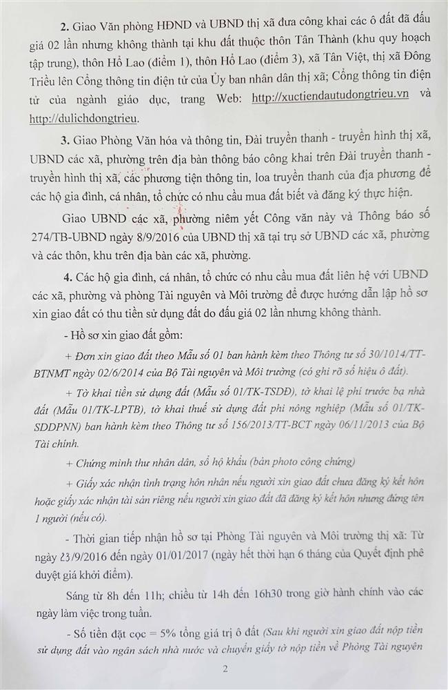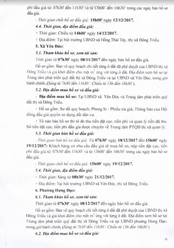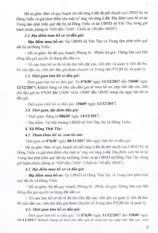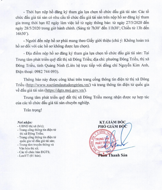 - Địa điểm mua hồ sơ: Tại UBND phường Mạo Khê và Trung tâm phát triển quỹ đất thị xã Đông Triều.
