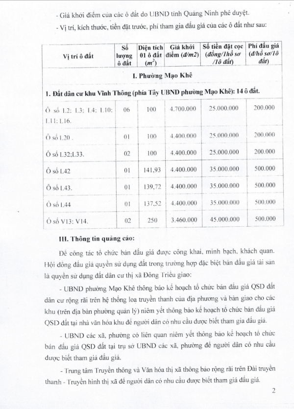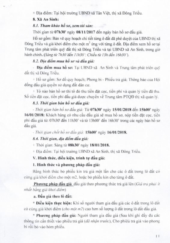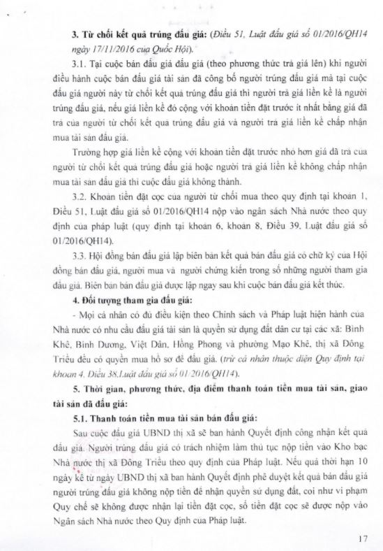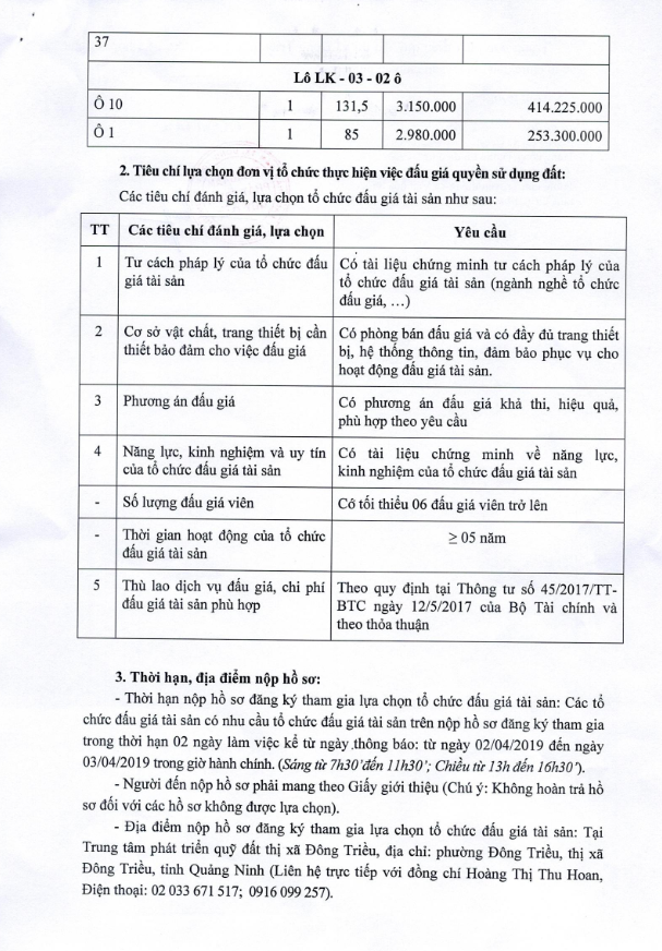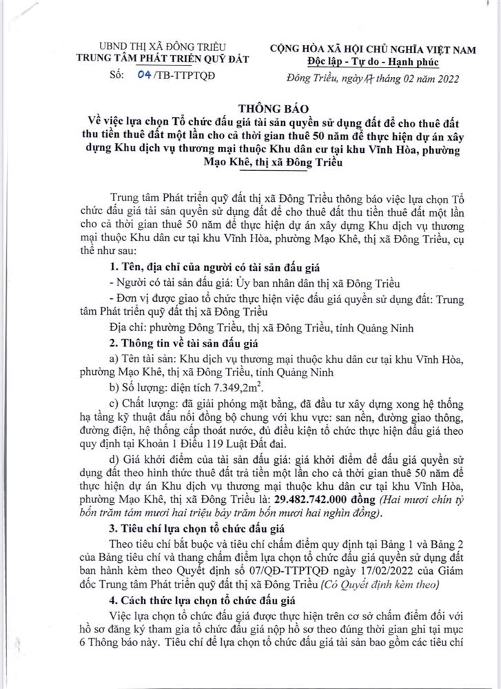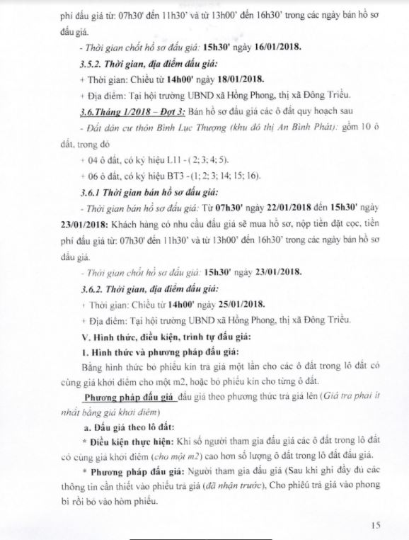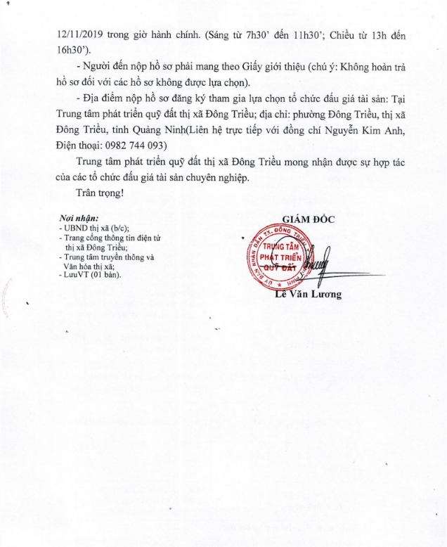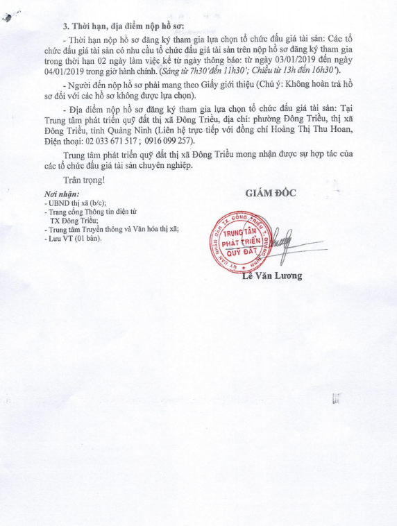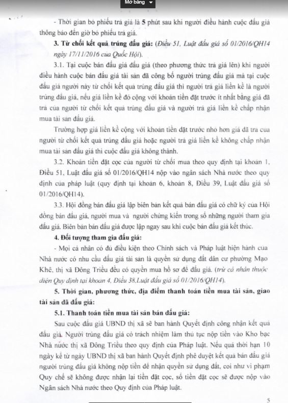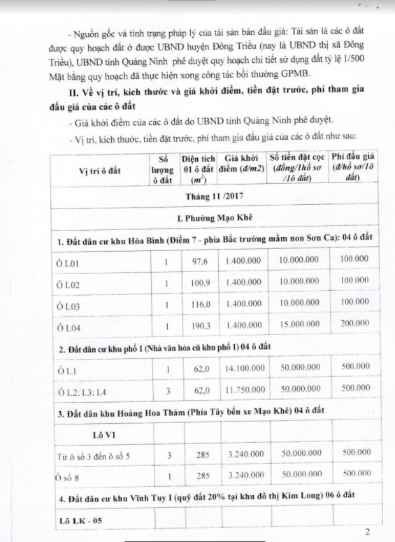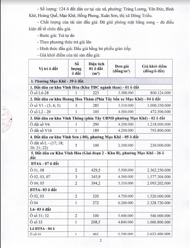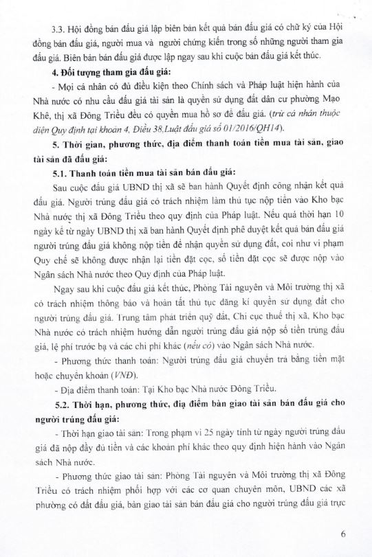 - Địa điểm mua hồ sơ: Tại UBND phường Mạo Khê và Trung tâm phát triển quỹ đất thị xã Đông Triều.