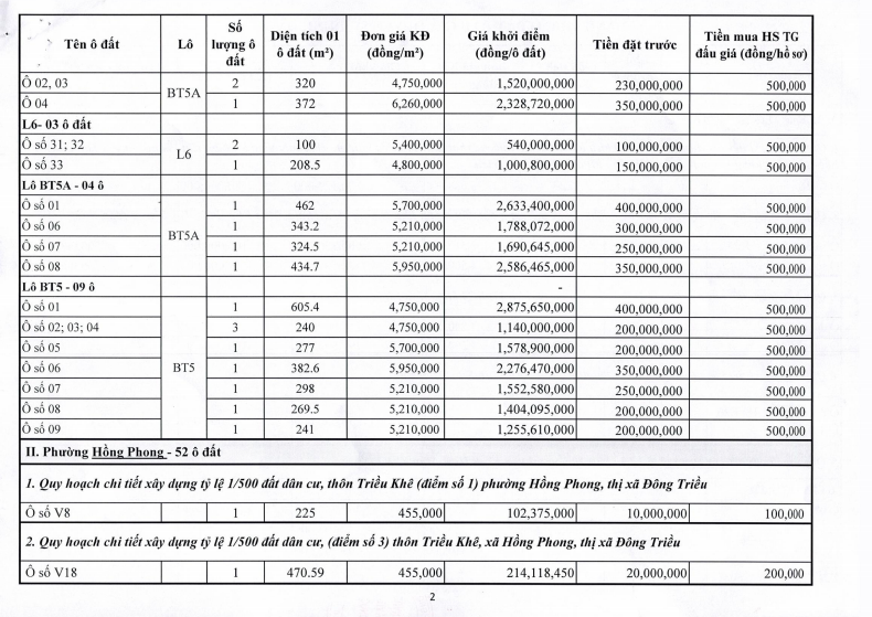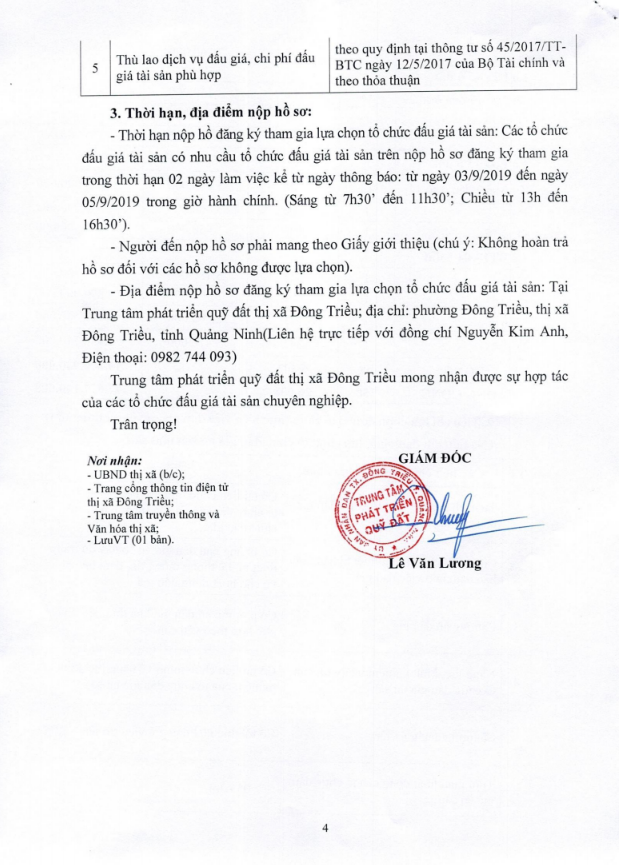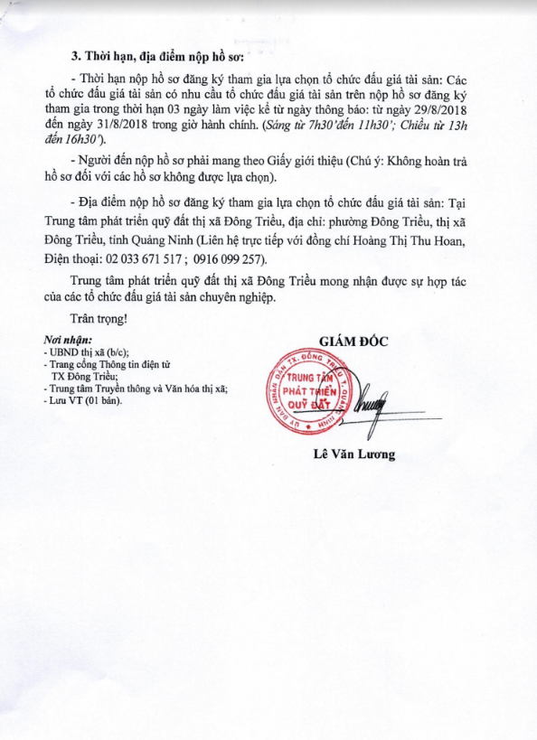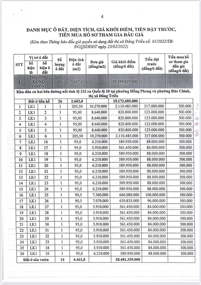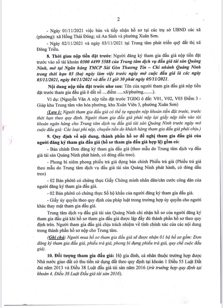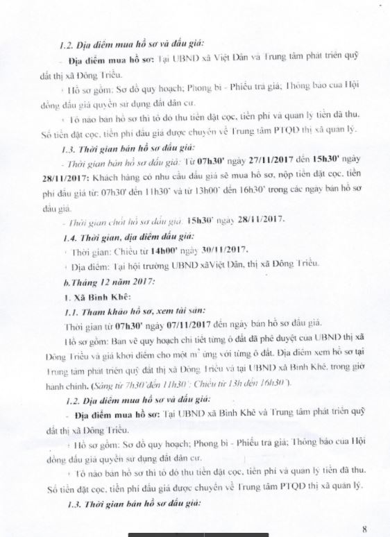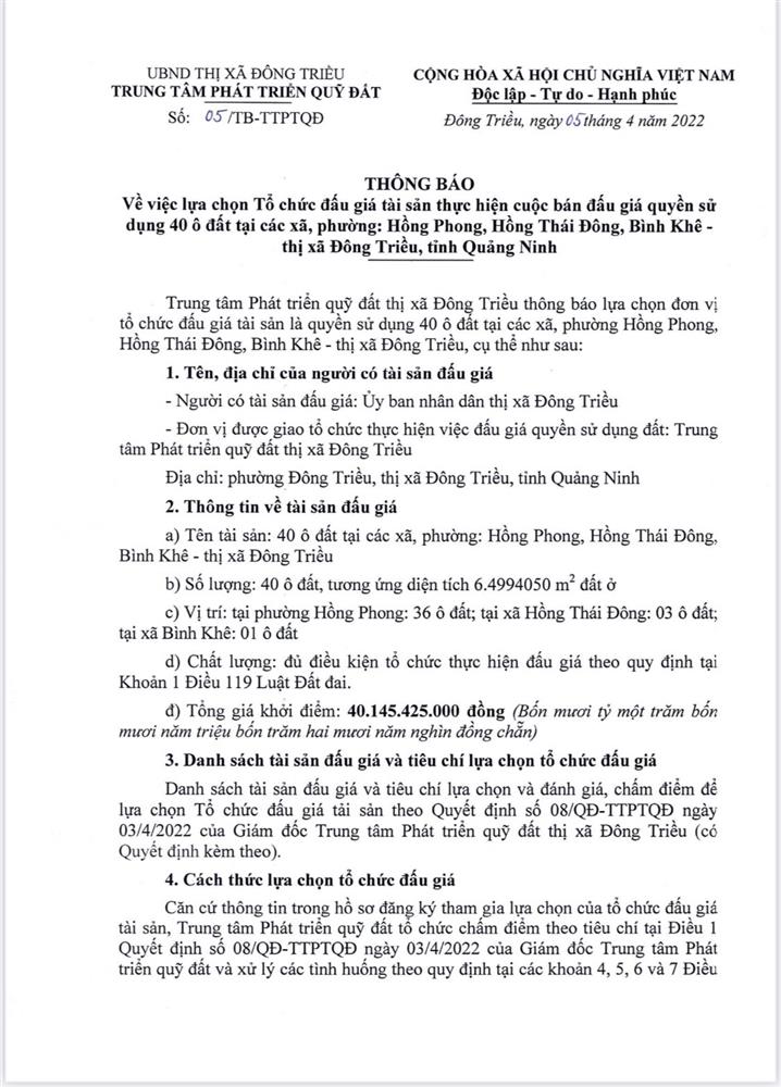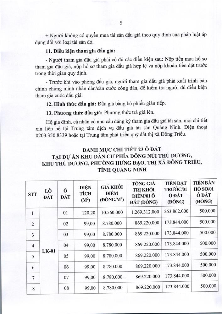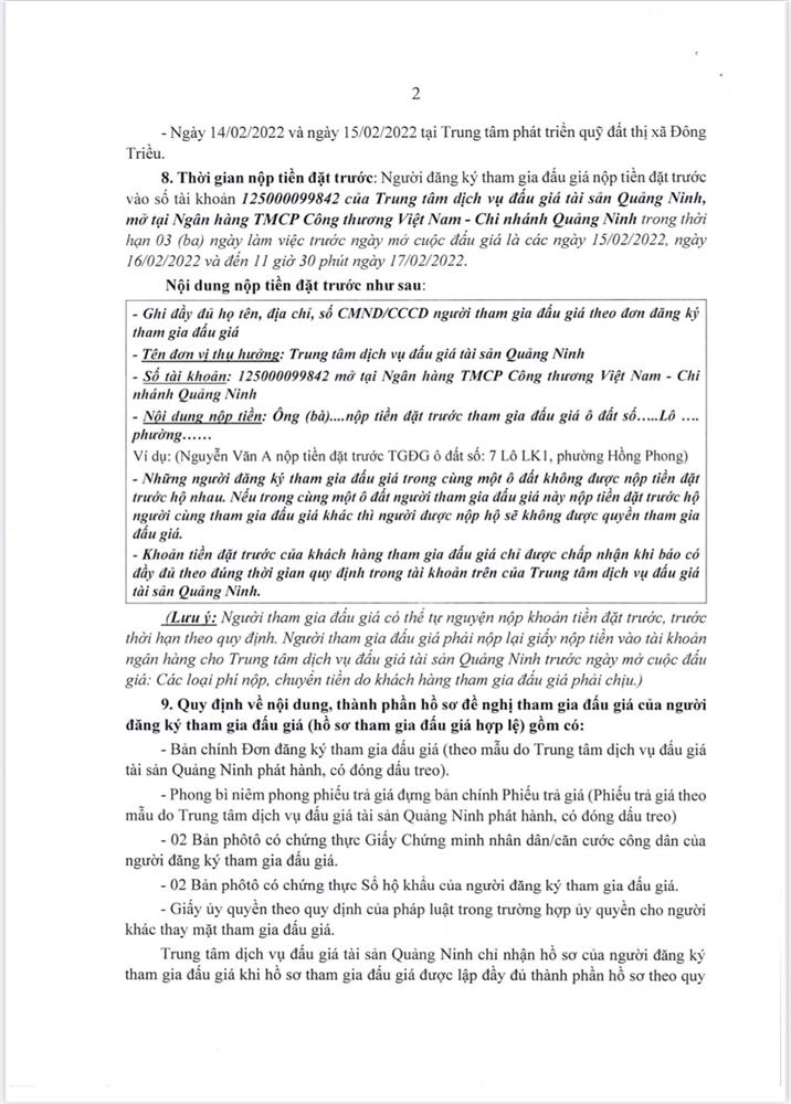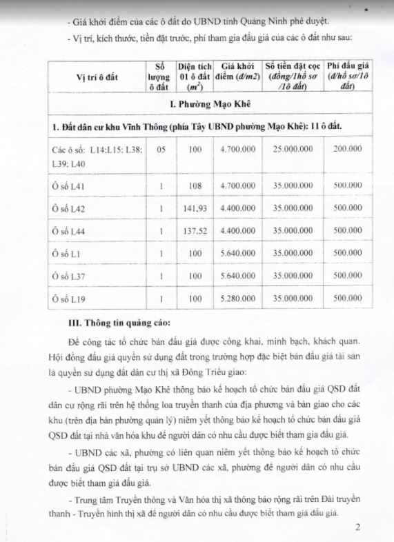 - Địa điểm mua hồ sơ: Tại UBND phường Mạo Khê và Trung tâm phát triển quỹ đất thị xã Đông Triều.