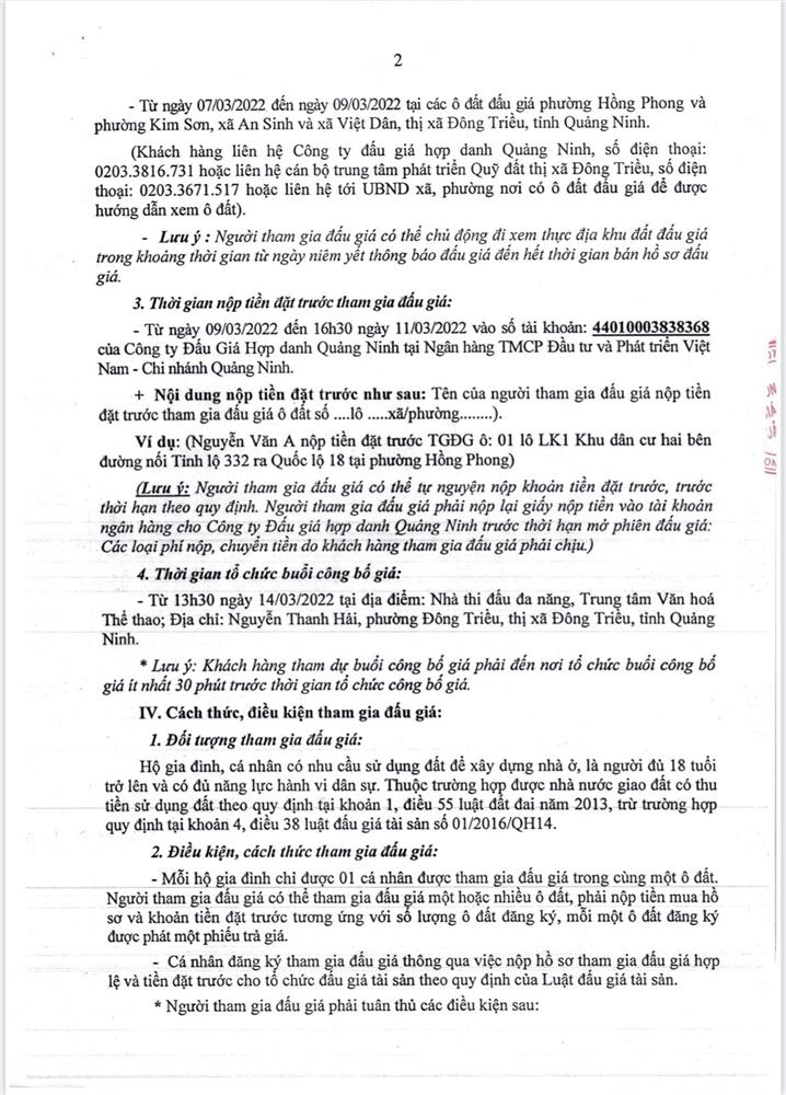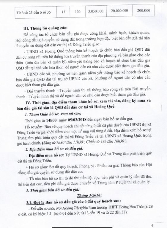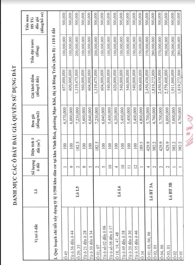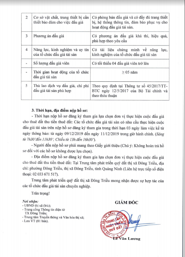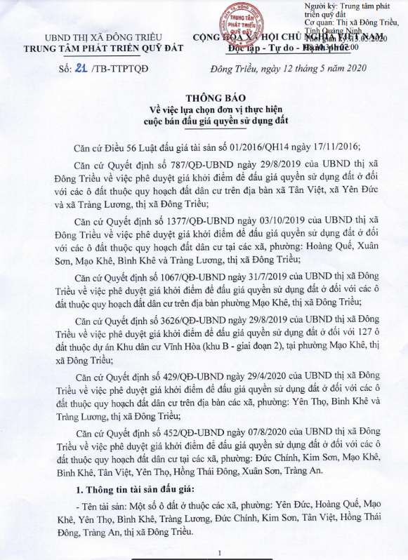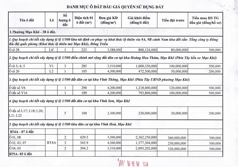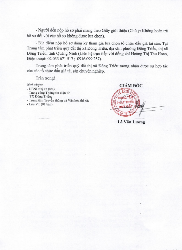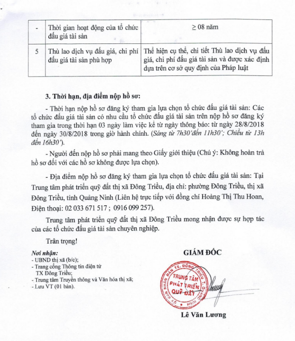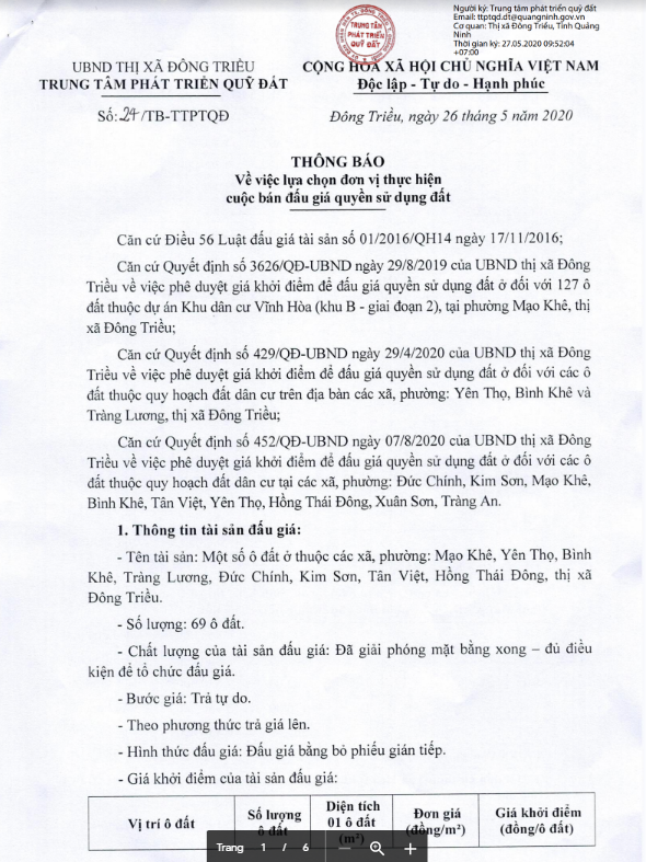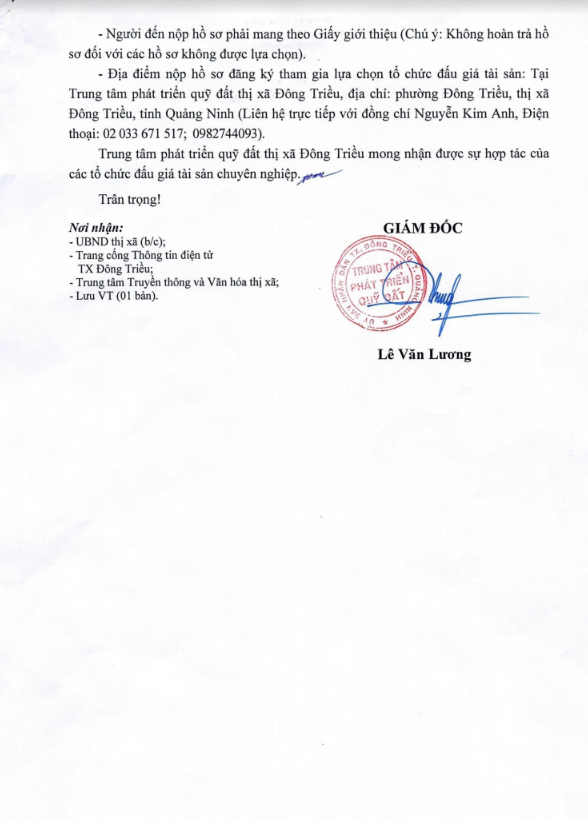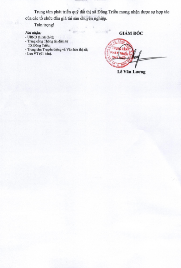 - Địa điểm mua hồ sơ: Tại UBND phường Mạo Khê và Trung tâm phát triển quỹ đất thị xã Đông Triều.