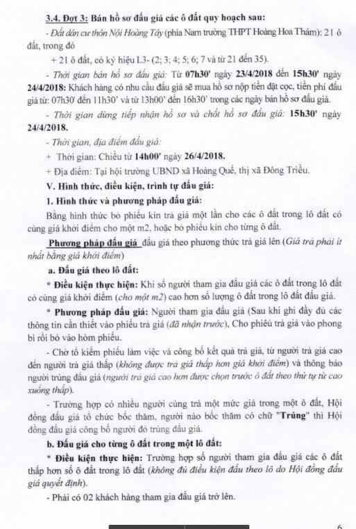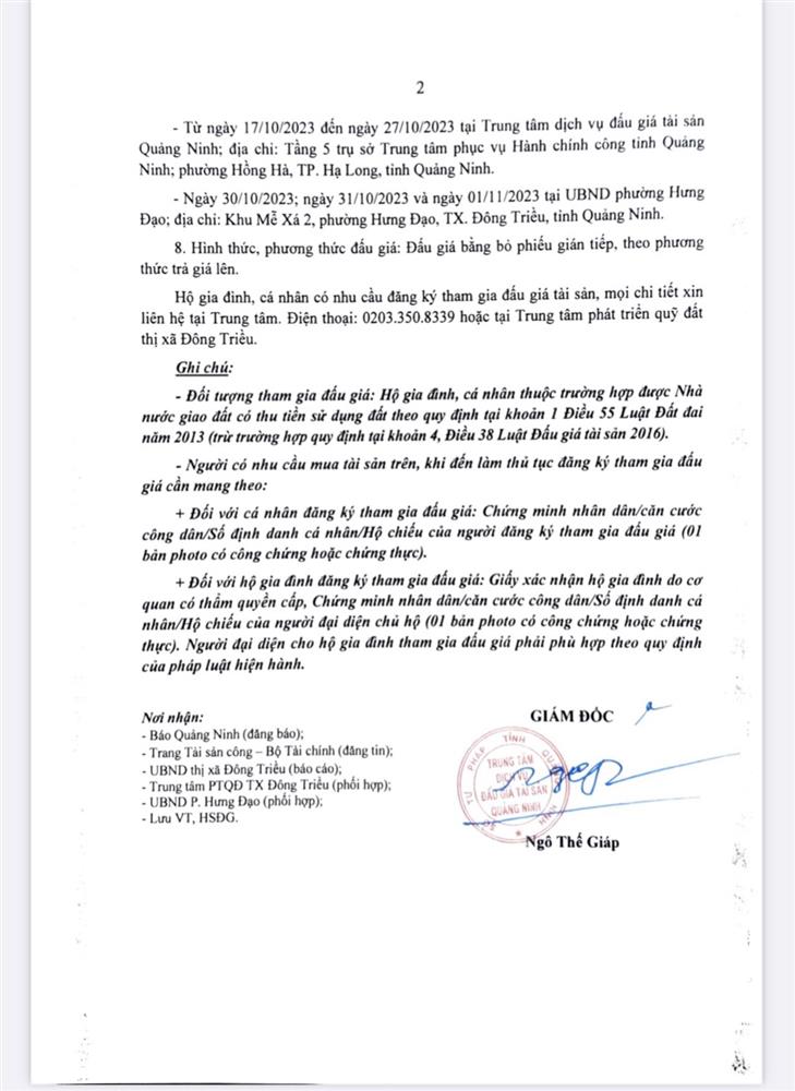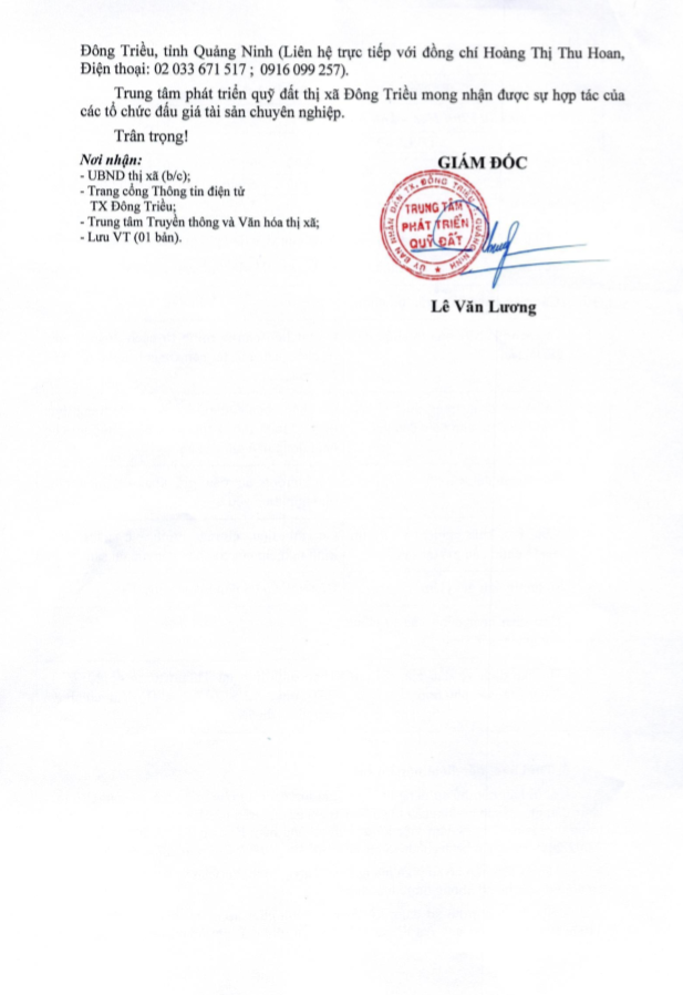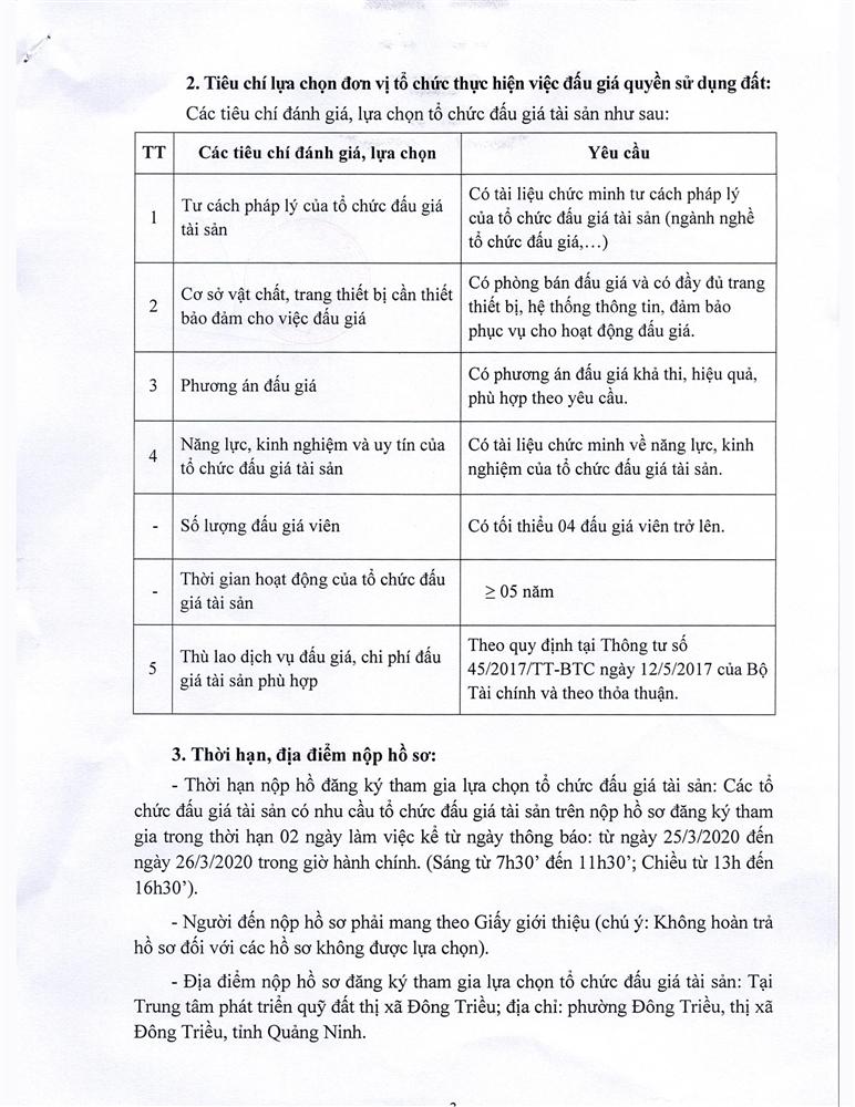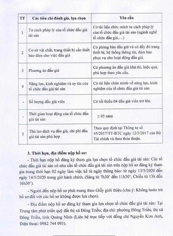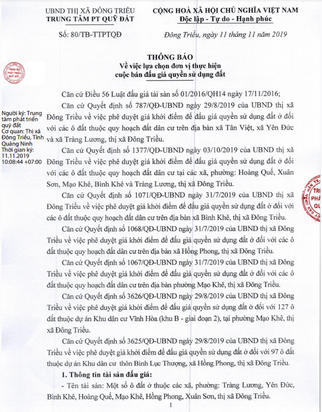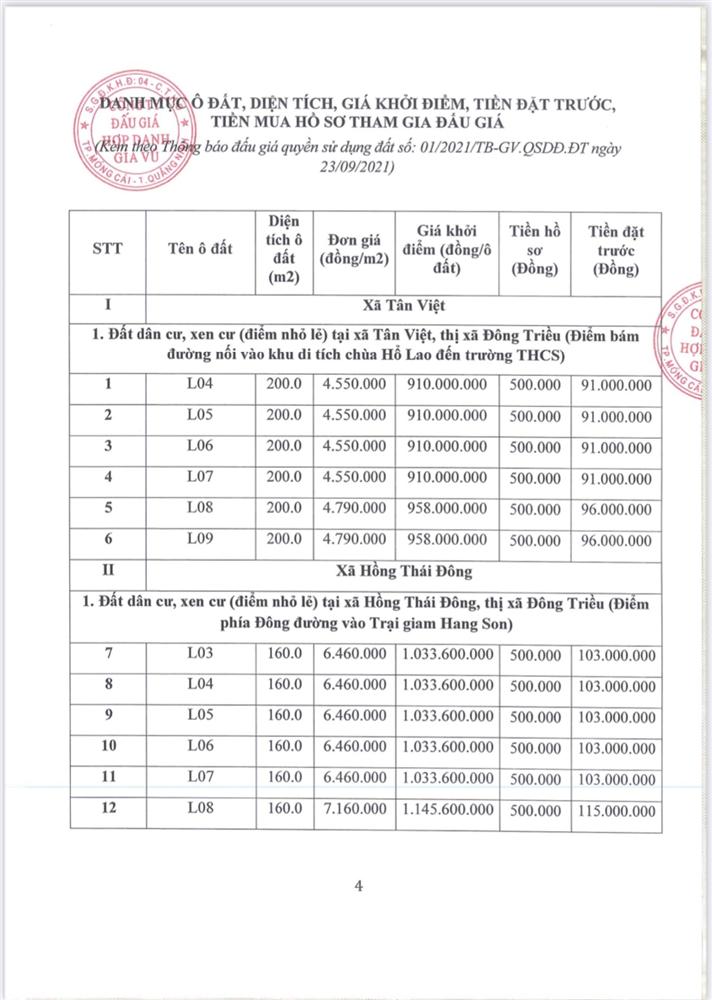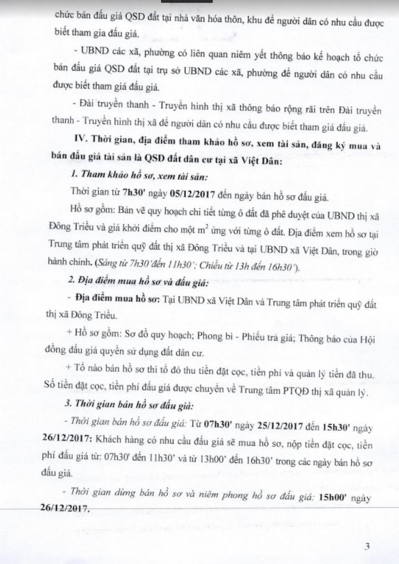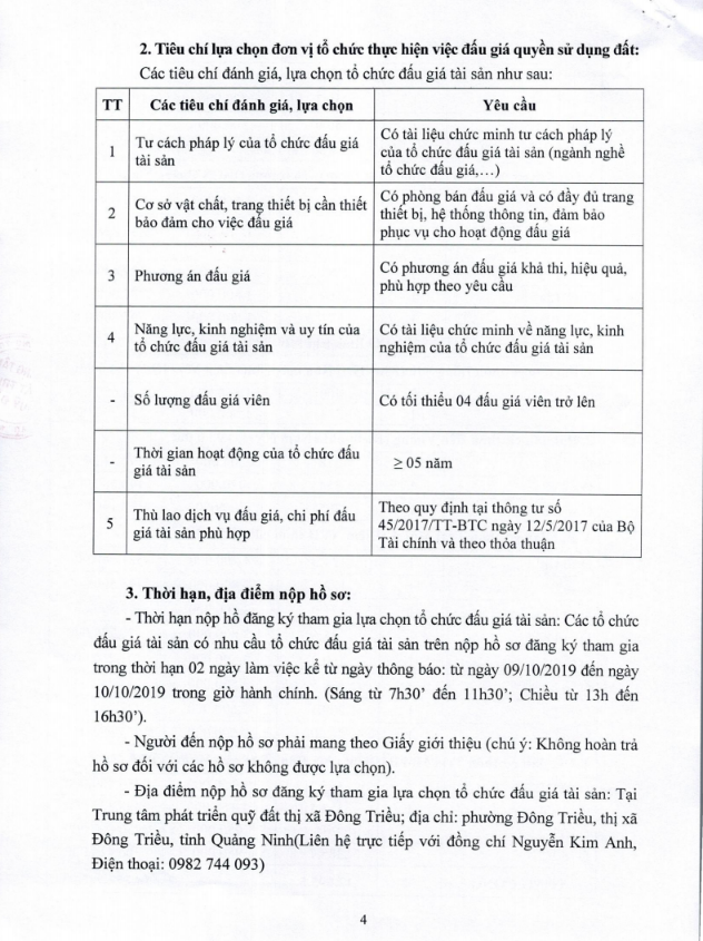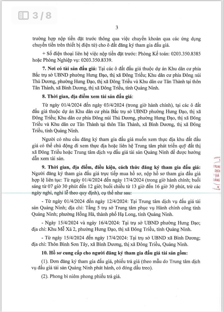 - Địa điểm mua hồ sơ: Tại UBND phường Mạo Khê và Trung tâm phát triển quỹ đất thị xã Đông Triều.