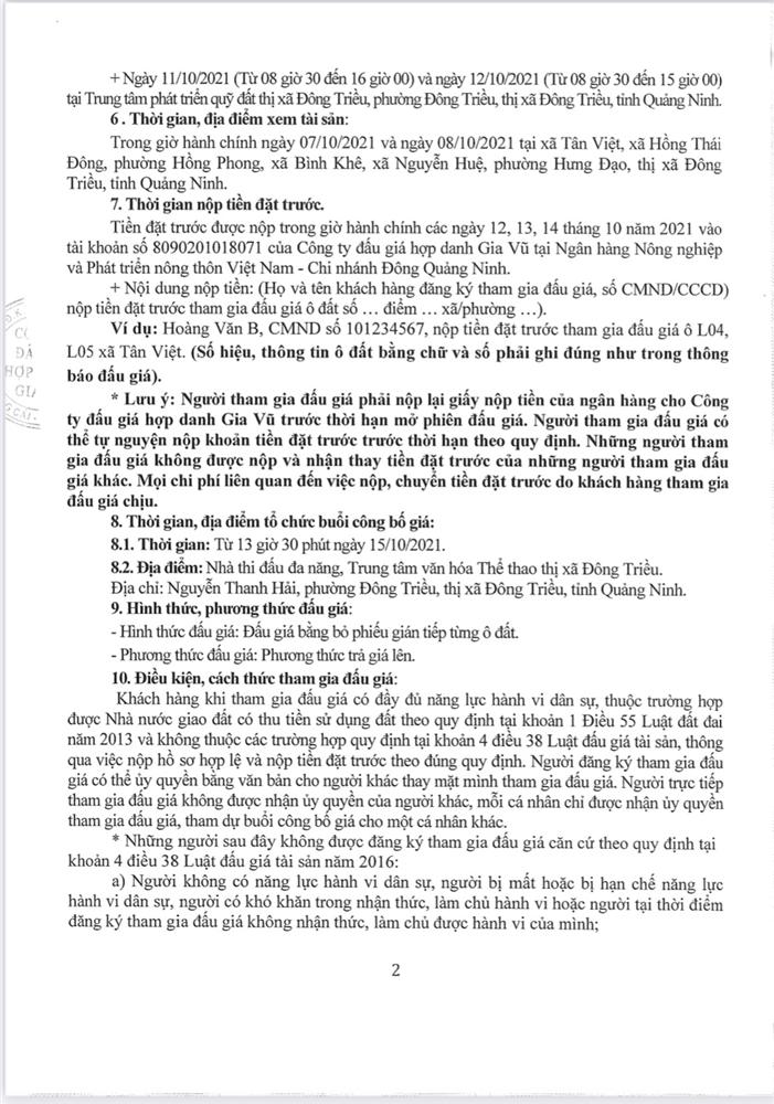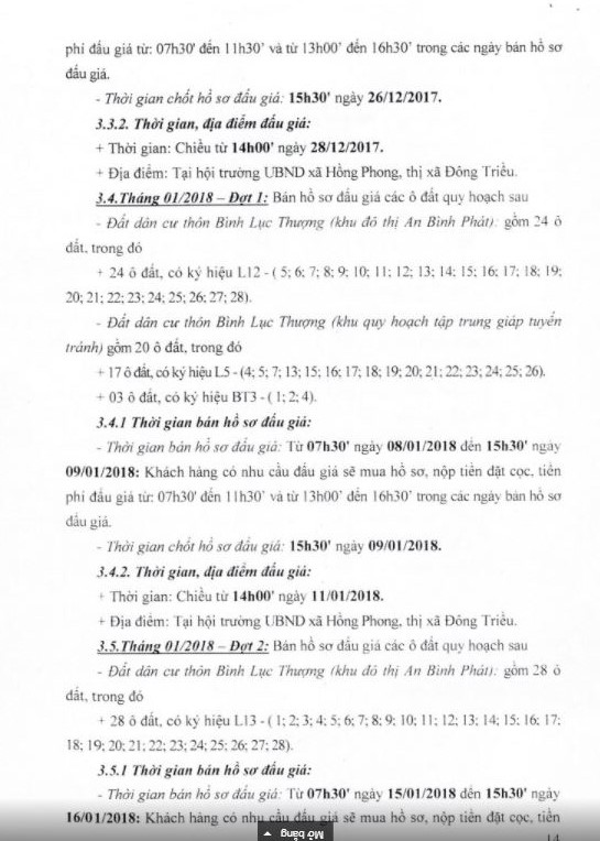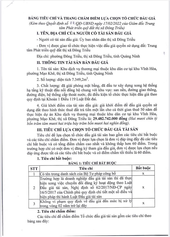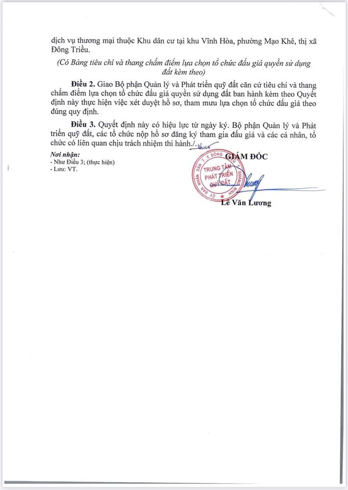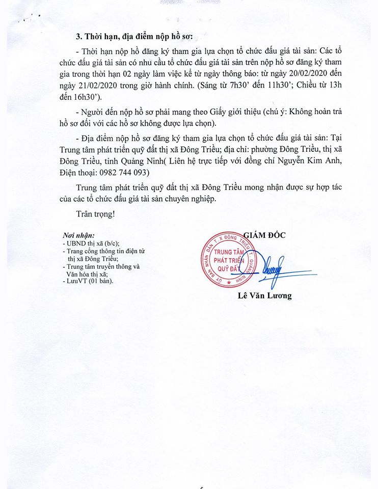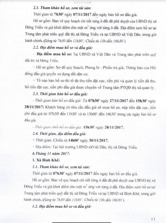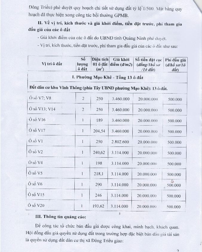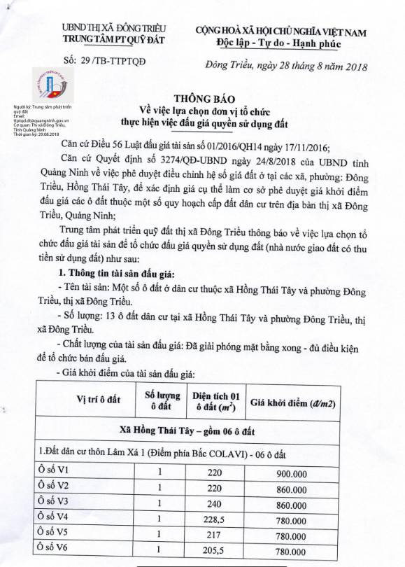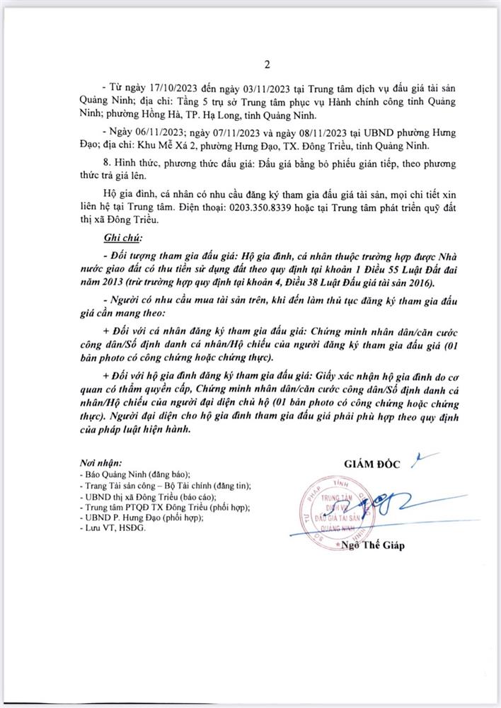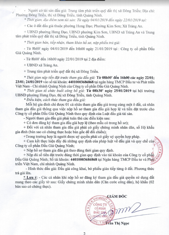 - Địa điểm mua hồ sơ: Tại UBND phường Mạo Khê và Trung tâm phát triển quỹ đất thị xã Đông Triều.