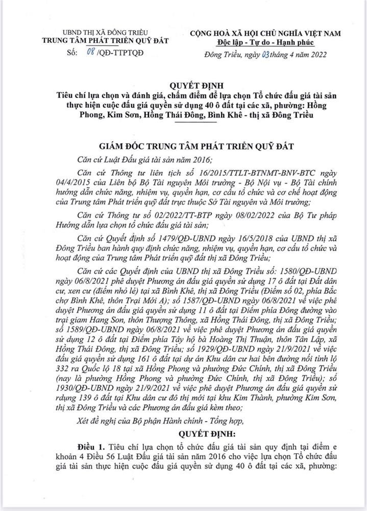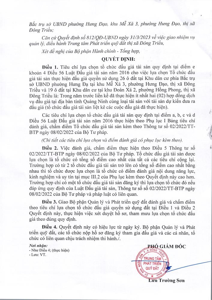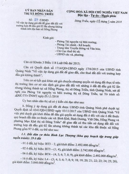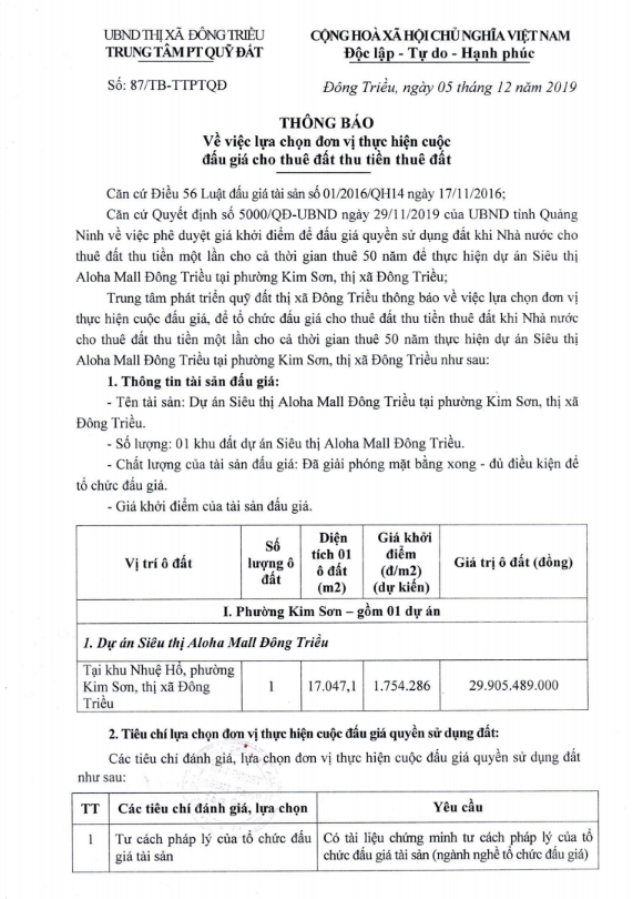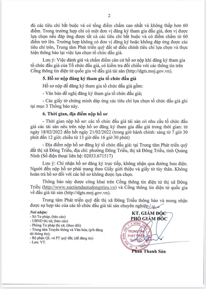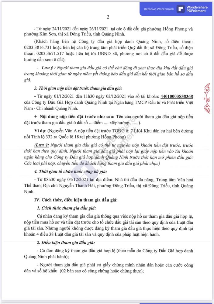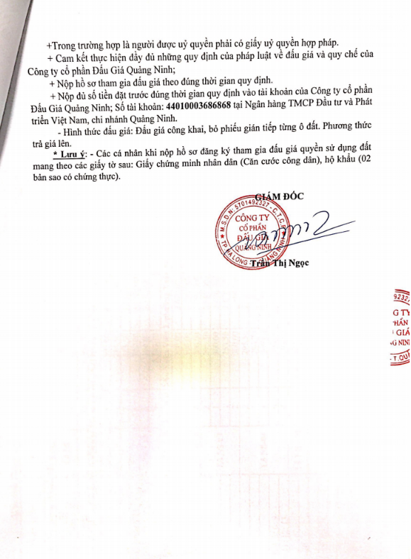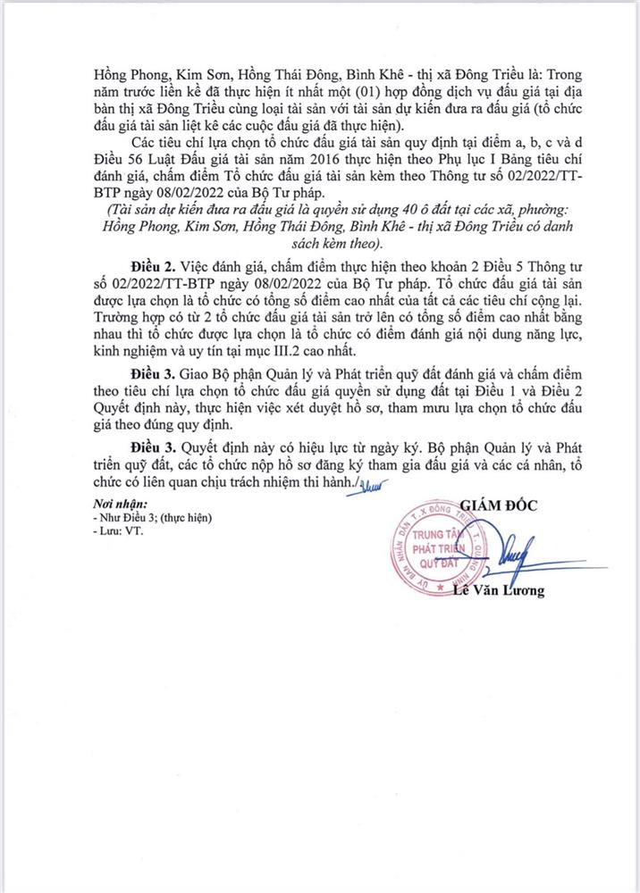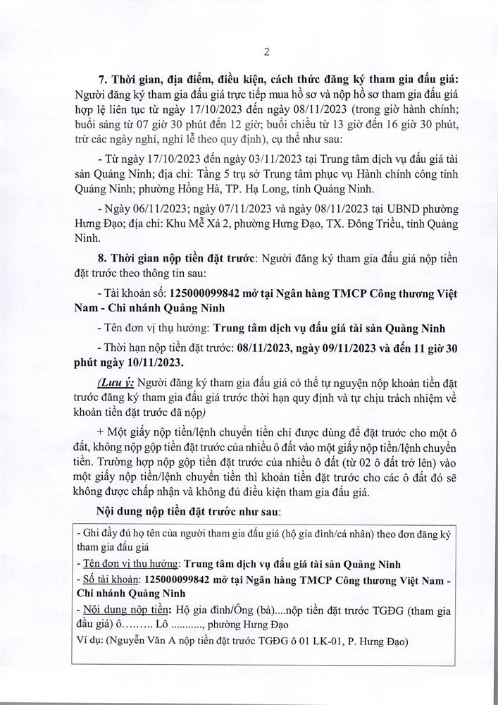 - Địa điểm mua hồ sơ: Tại UBND phường Mạo Khê và Trung tâm phát triển quỹ đất thị xã Đông Triều.