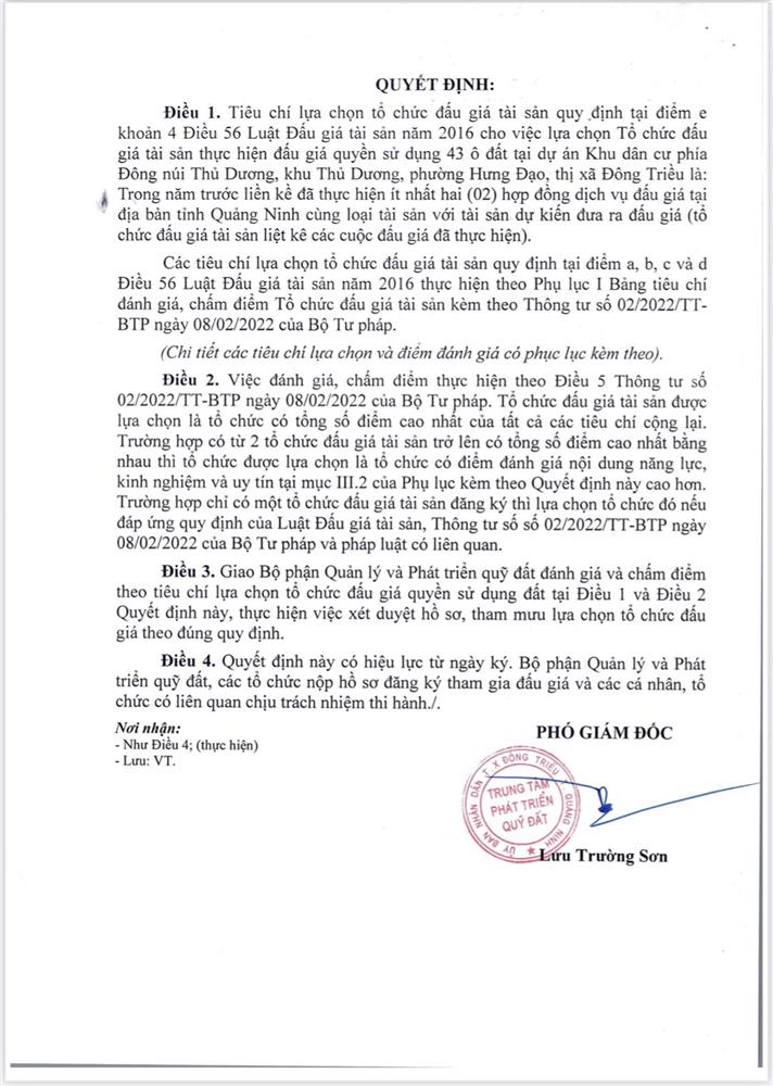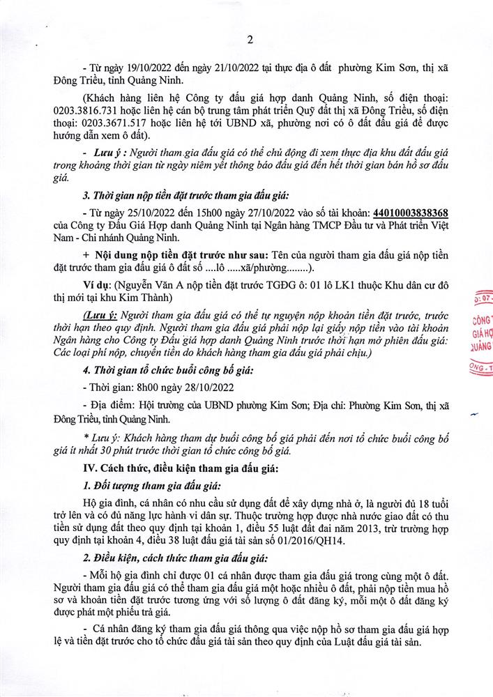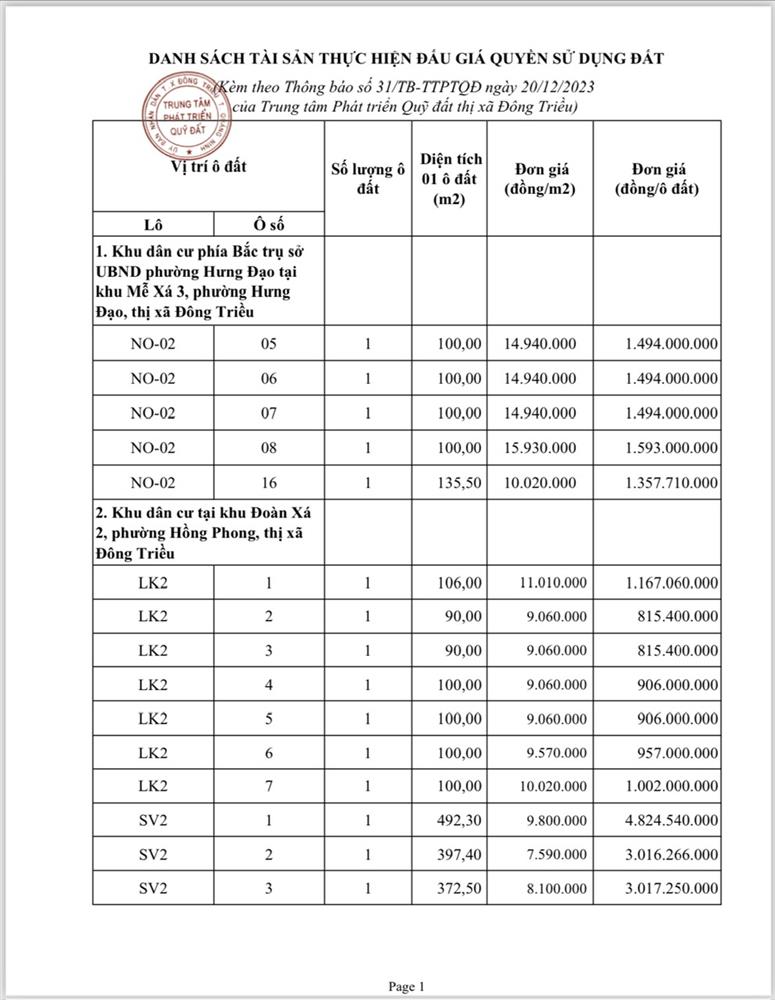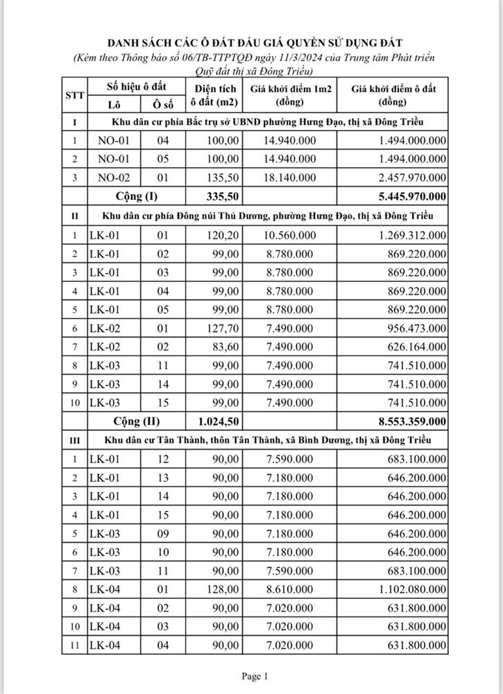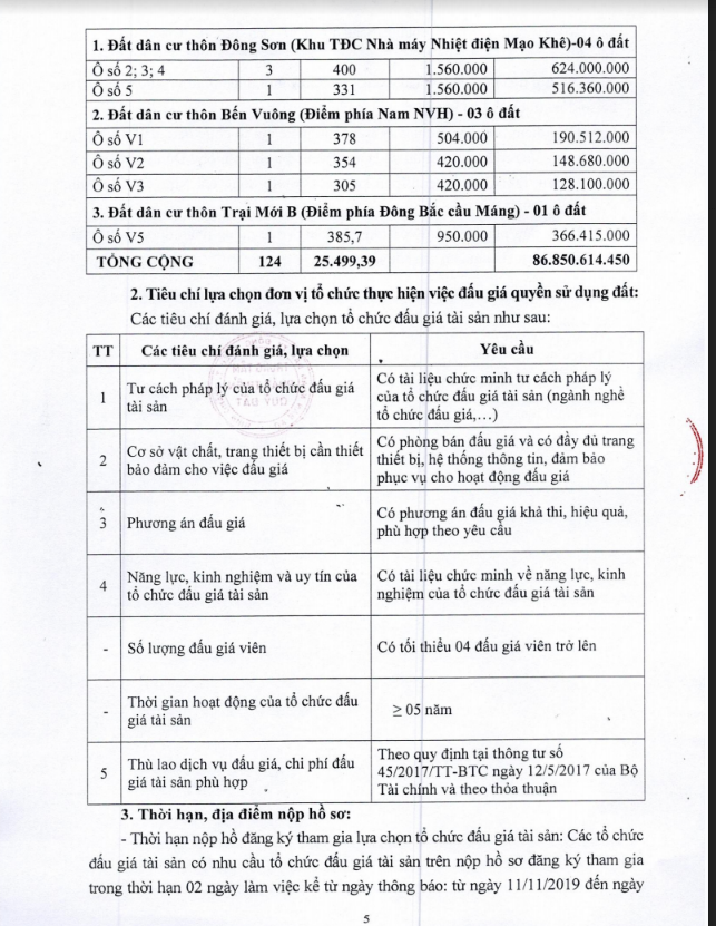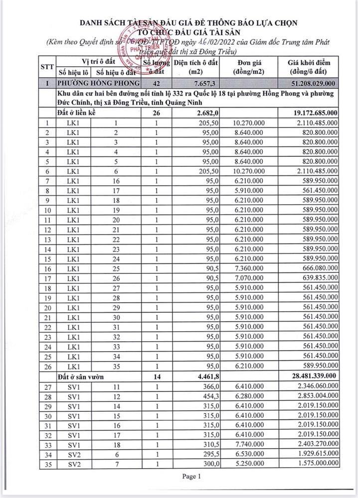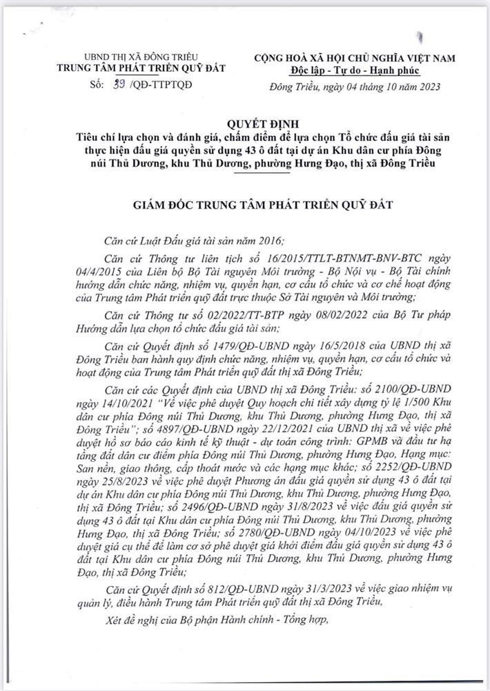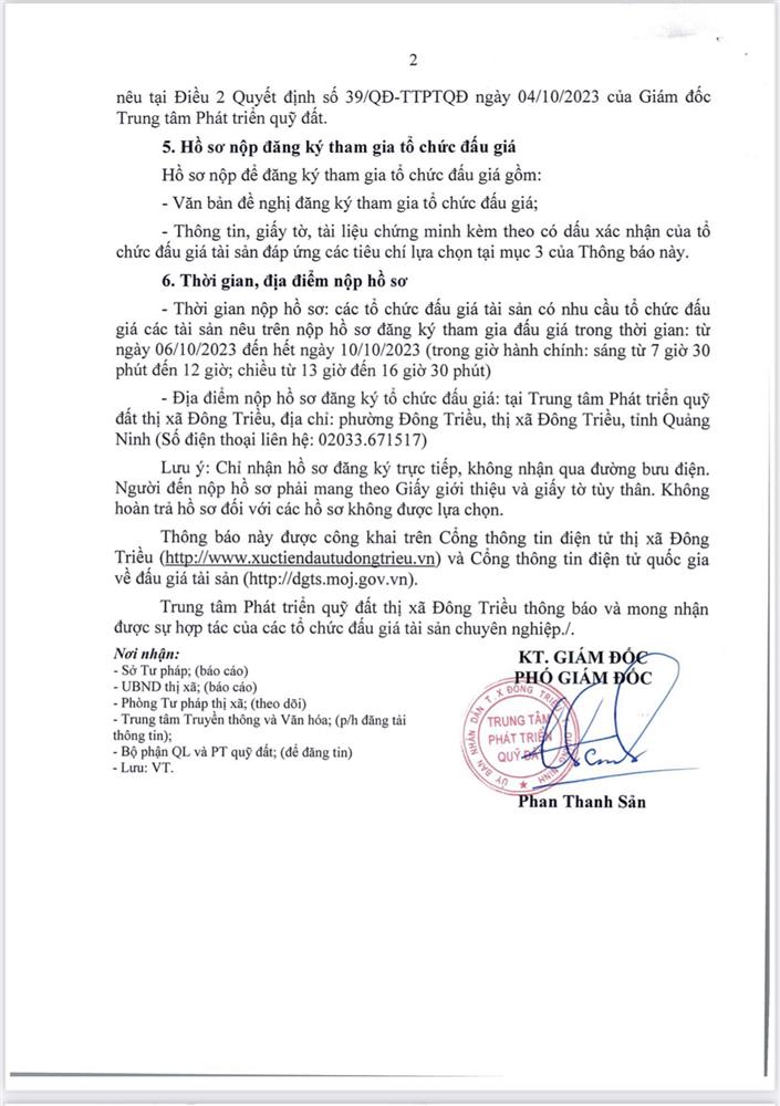 - Địa điểm mua hồ sơ: Tại UBND phường Mạo Khê và Trung tâm phát triển quỹ đất thị xã Đông Triều.