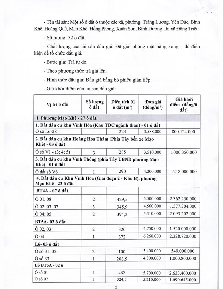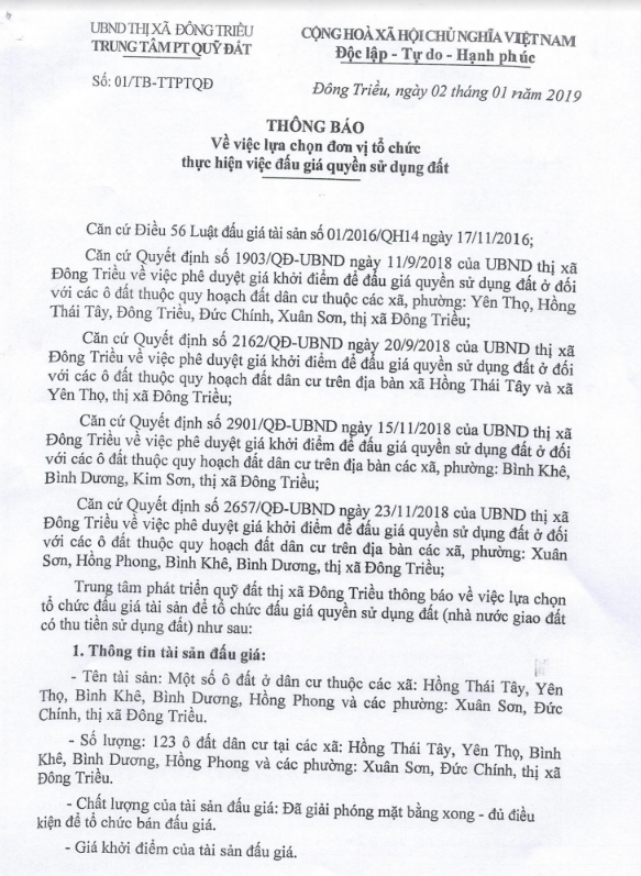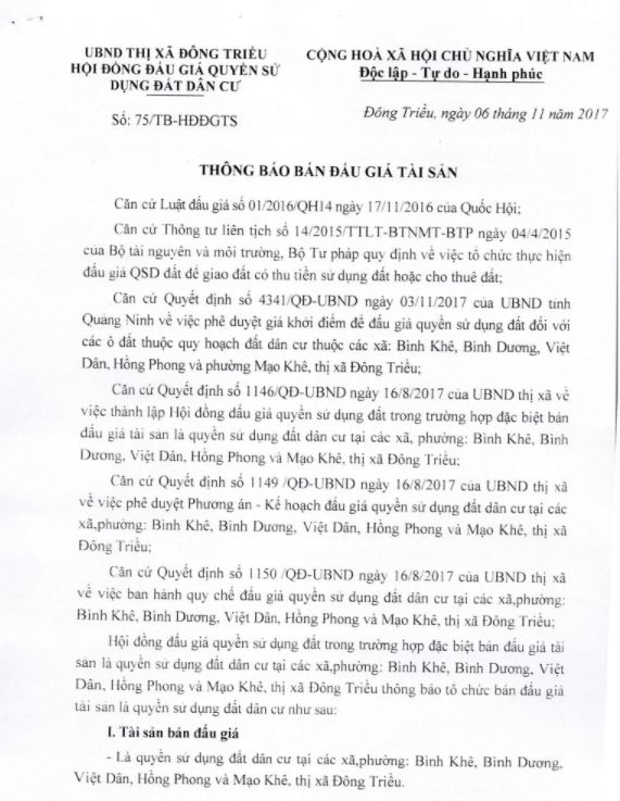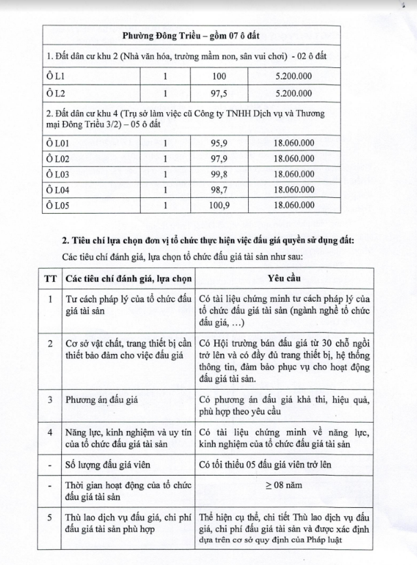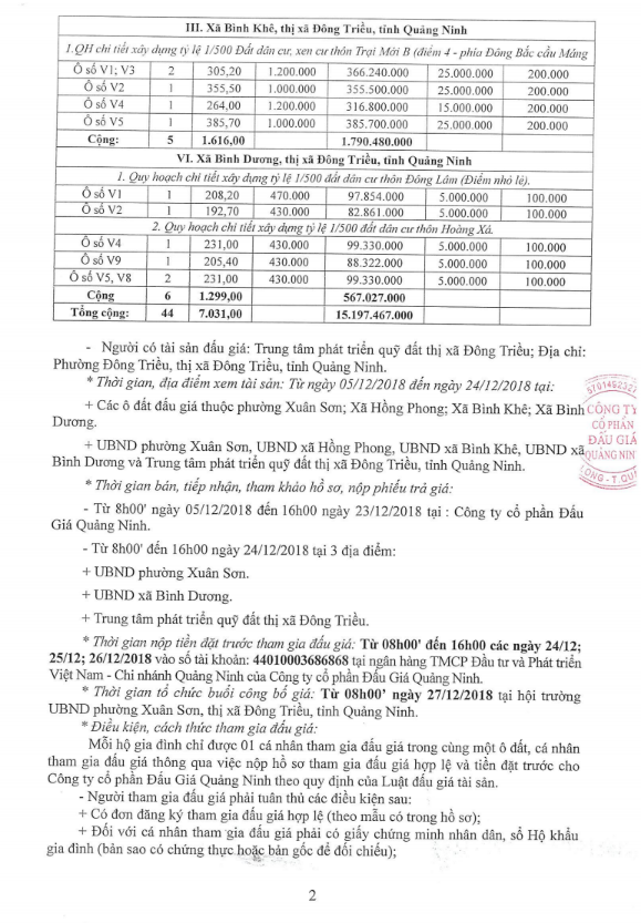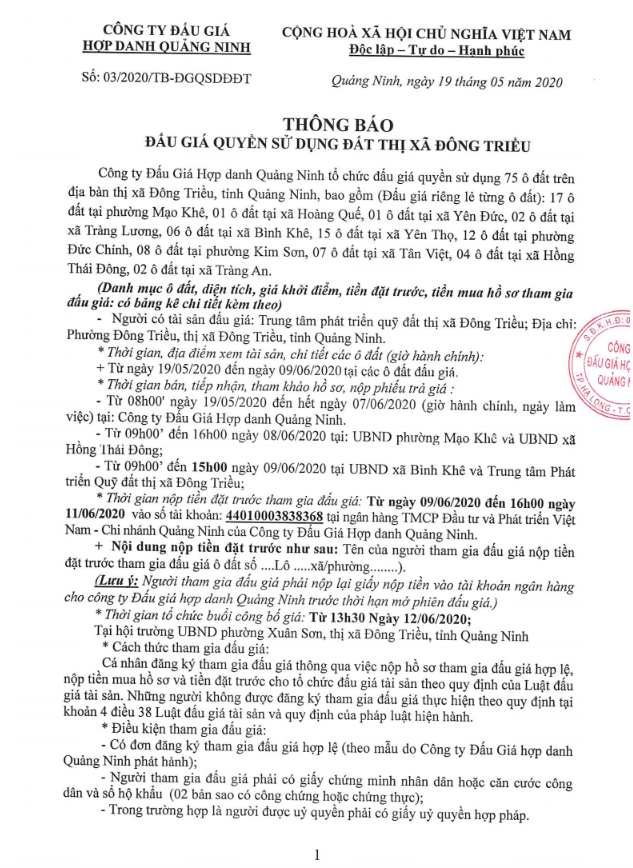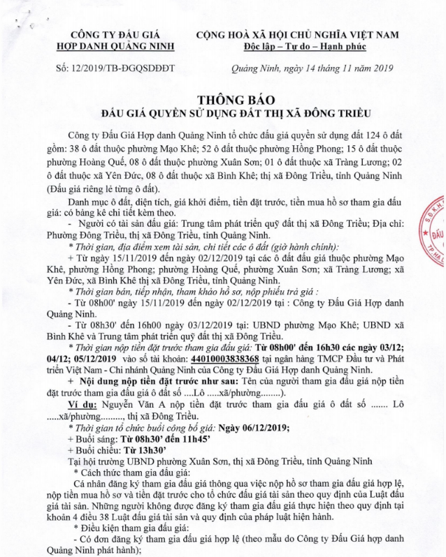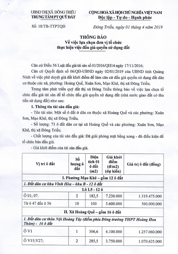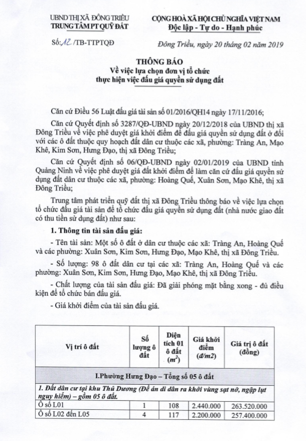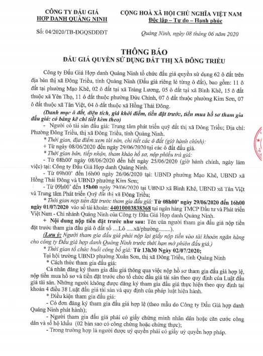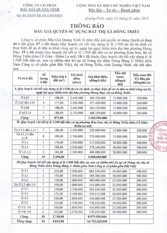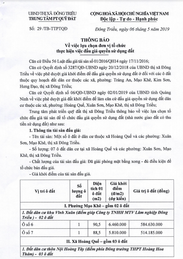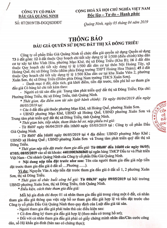 Tổ chức đấu giá Quyền sử dụng 47 ô đất trên địa bàn thị xã Đông Triều, tỉnh Quảng Ninh (Đấu giá riêng lẻ từng ô đất), bao gồm: 07 ô đất tại phường Mạo Khê, 07 ô đất tại xã Bình Khê, 02 ô đất thuộc phường Yên Thọ, 10 ô đất thuộc phường Đức Chính, 02 ô đất thuộc phường Kim Sơn, 02 ô đất thuộc phường Tràng An, 14 ô đất thuộc xã Việt Dân, 03 ô đất thuộc phường Đông Triều