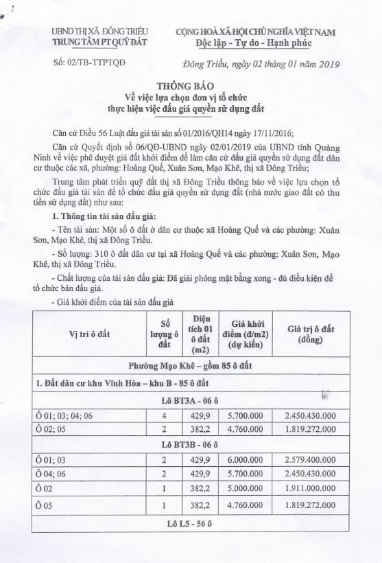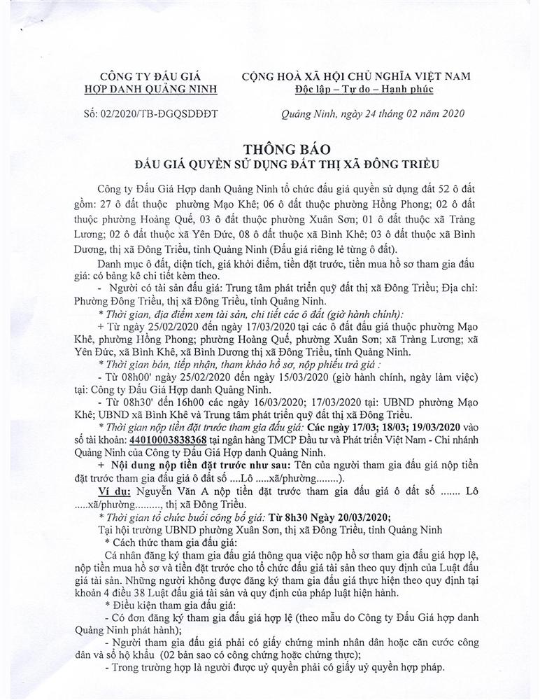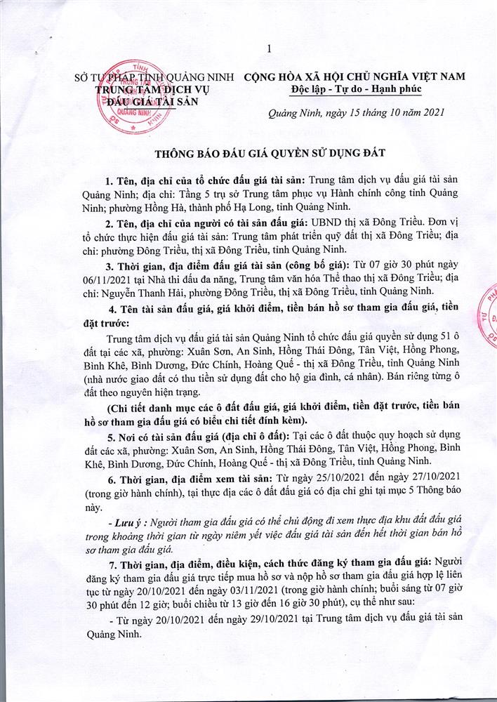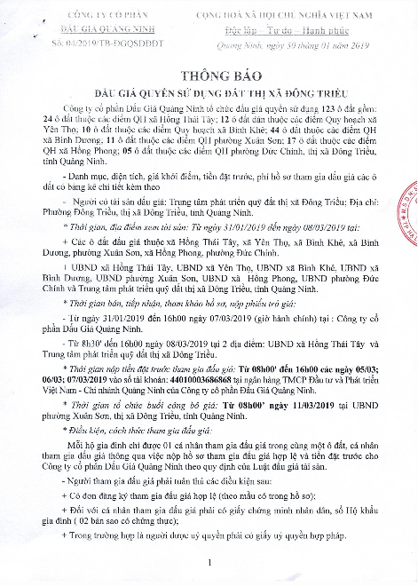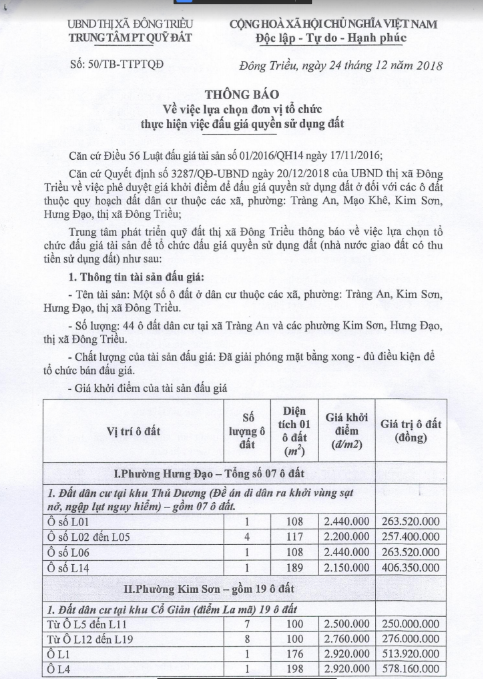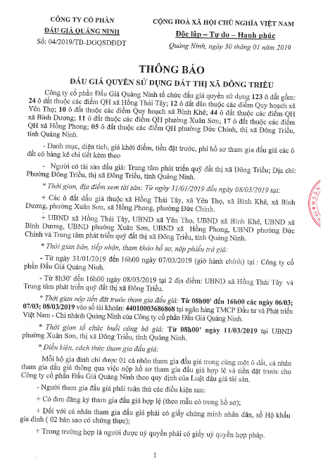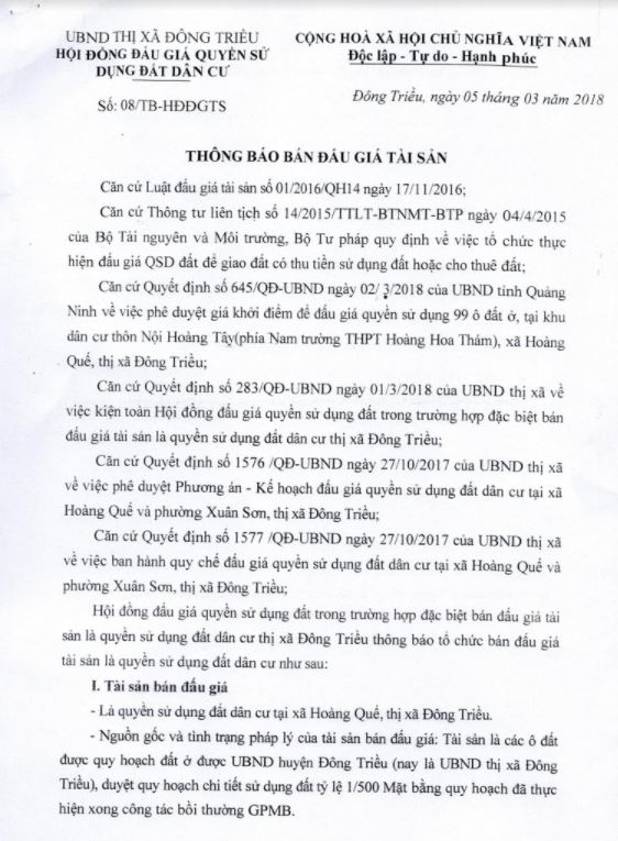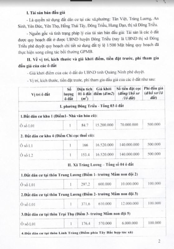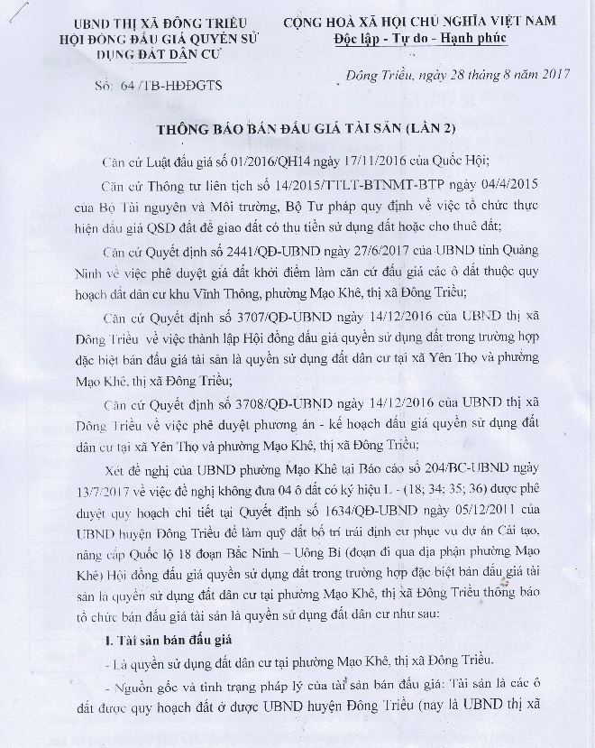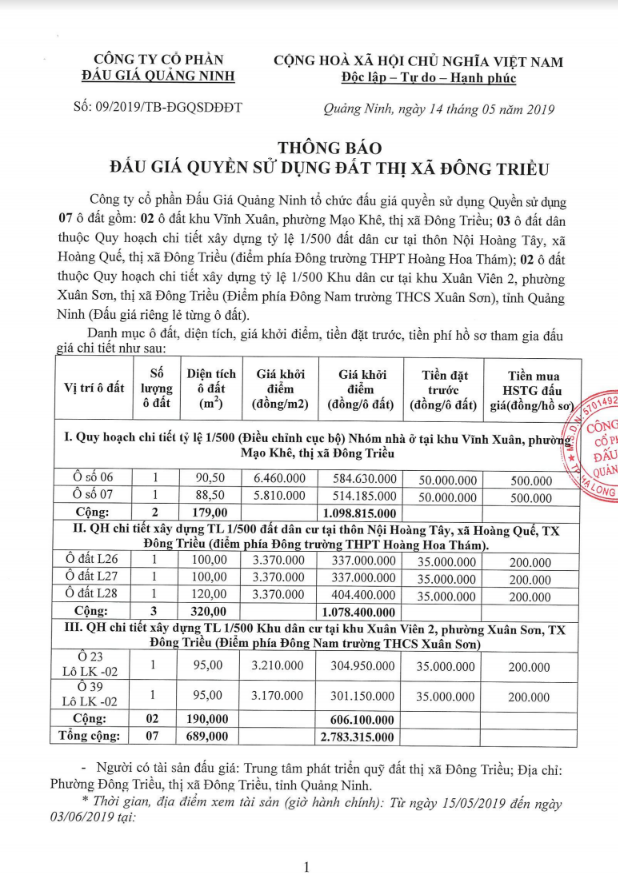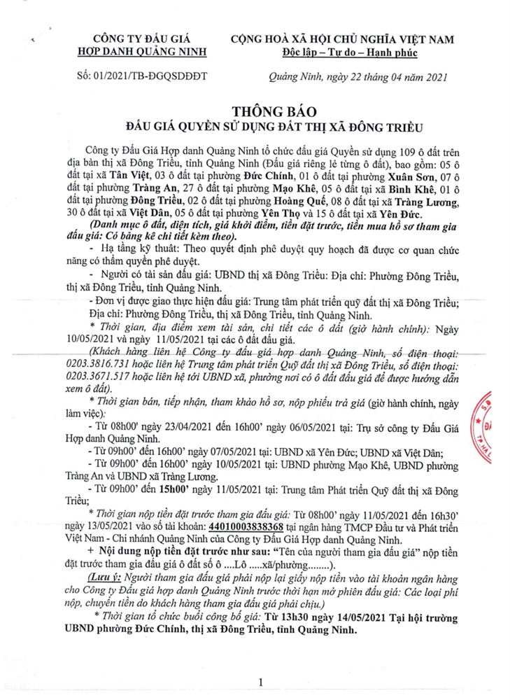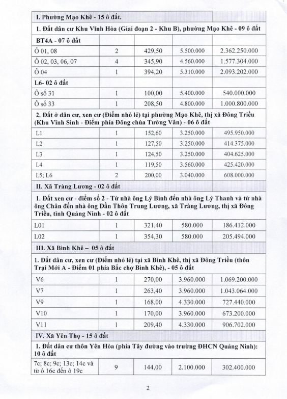 Tổ chức đấu giá Quyền sử dụng 47 ô đất trên địa bàn thị xã Đông Triều, tỉnh Quảng Ninh (Đấu giá riêng lẻ từng ô đất), bao gồm: 07 ô đất tại phường Mạo Khê, 07 ô đất tại xã Bình Khê, 02 ô đất thuộc phường Yên Thọ, 10 ô đất thuộc phường Đức Chính, 02 ô đất thuộc phường Kim Sơn, 02 ô đất thuộc phường Tràng An, 14 ô đất thuộc xã Việt Dân, 03 ô đất thuộc phường Đông Triều