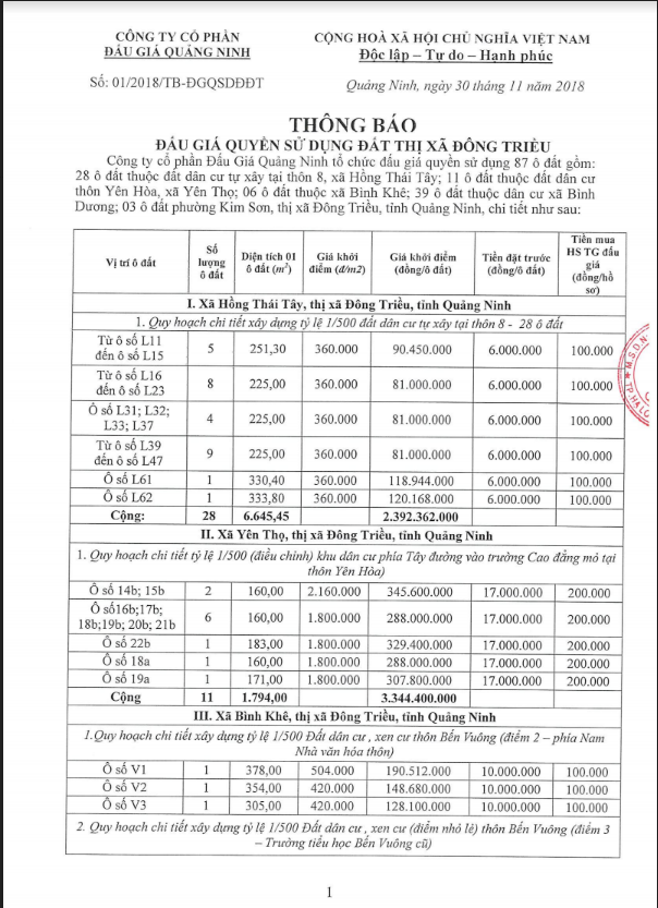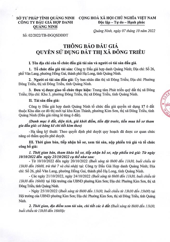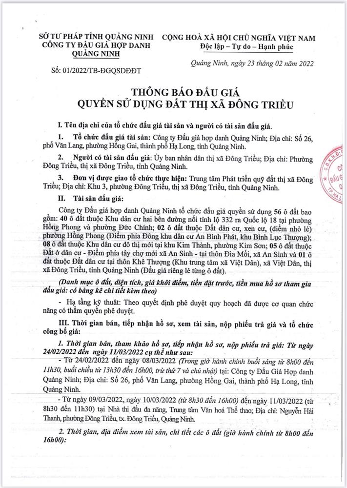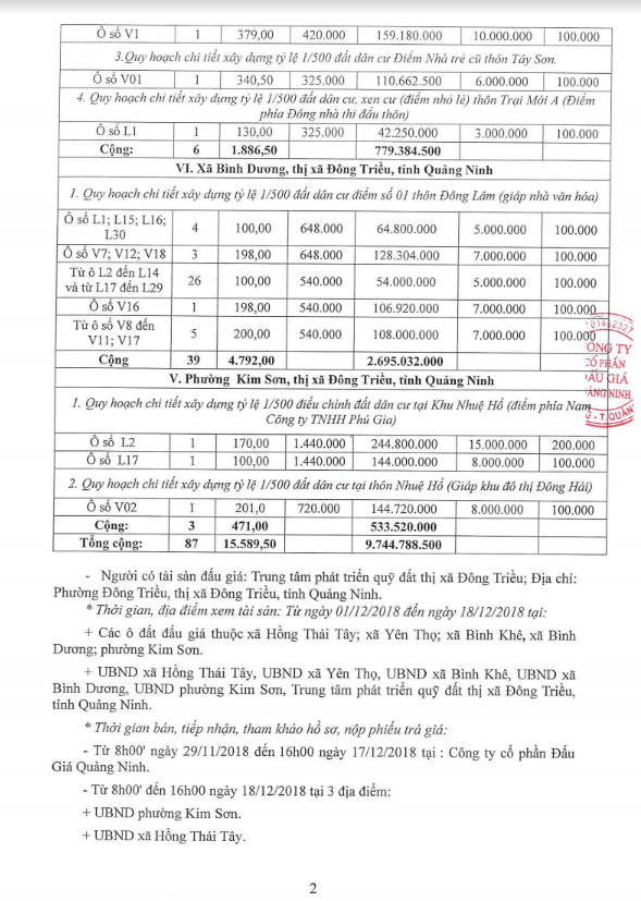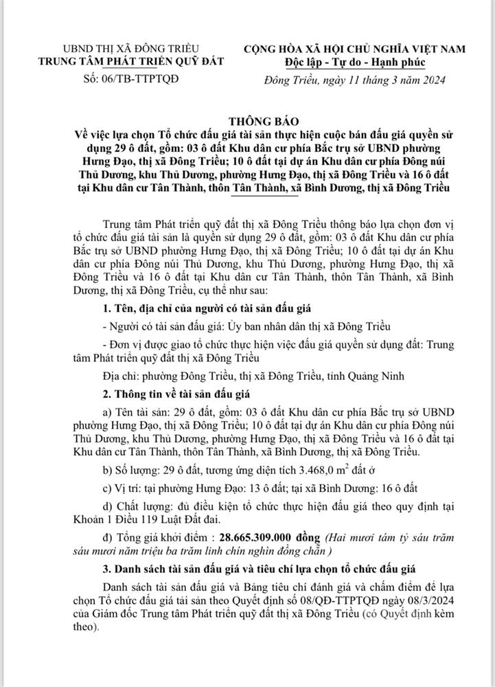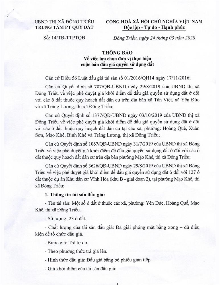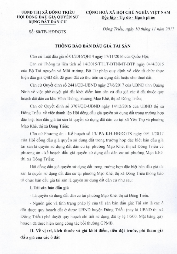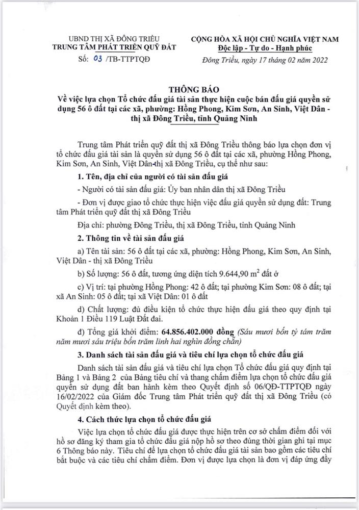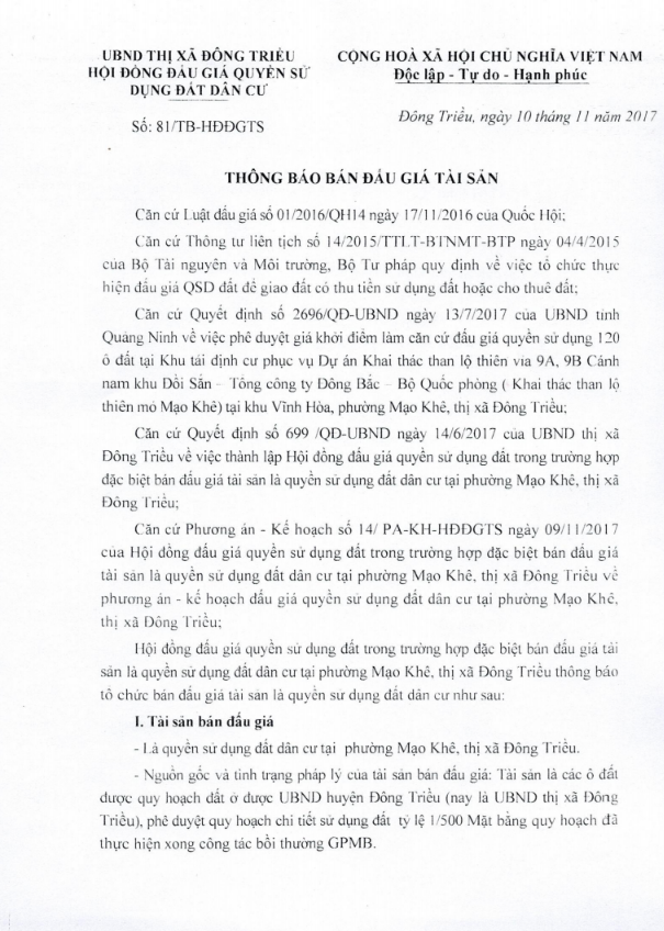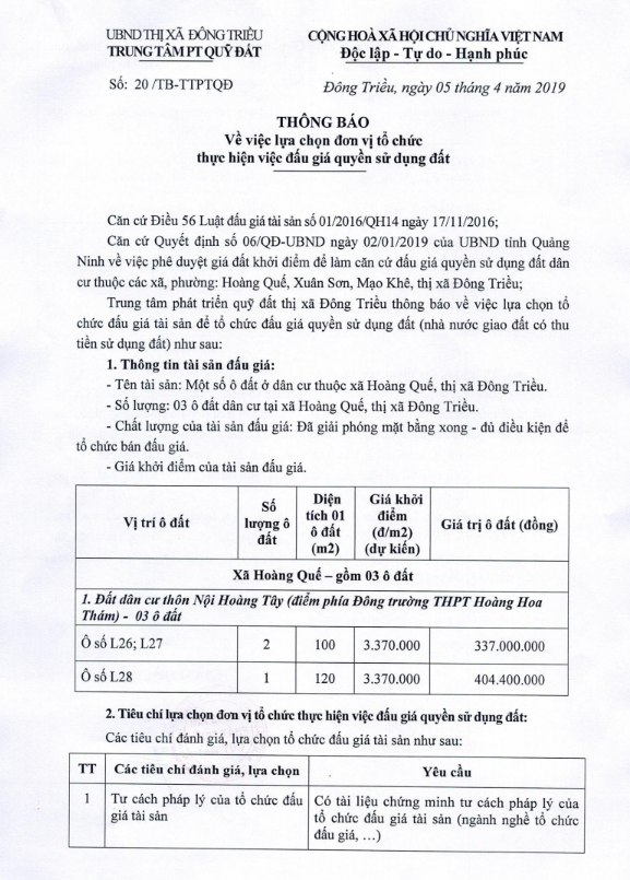 Tổ chức đấu giá Quyền sử dụng 47 ô đất trên địa bàn thị xã Đông Triều, tỉnh Quảng Ninh (Đấu giá riêng lẻ từng ô đất), bao gồm: 07 ô đất tại phường Mạo Khê, 07 ô đất tại xã Bình Khê, 02 ô đất thuộc phường Yên Thọ, 10 ô đất thuộc phường Đức Chính, 02 ô đất thuộc phường Kim Sơn, 02 ô đất thuộc phường Tràng An, 14 ô đất thuộc xã Việt Dân, 03 ô đất thuộc phường Đông Triều