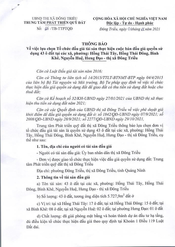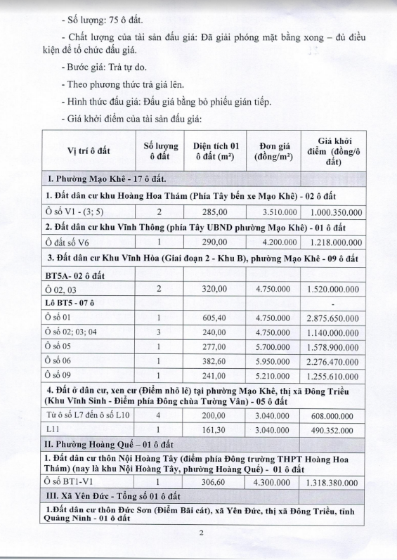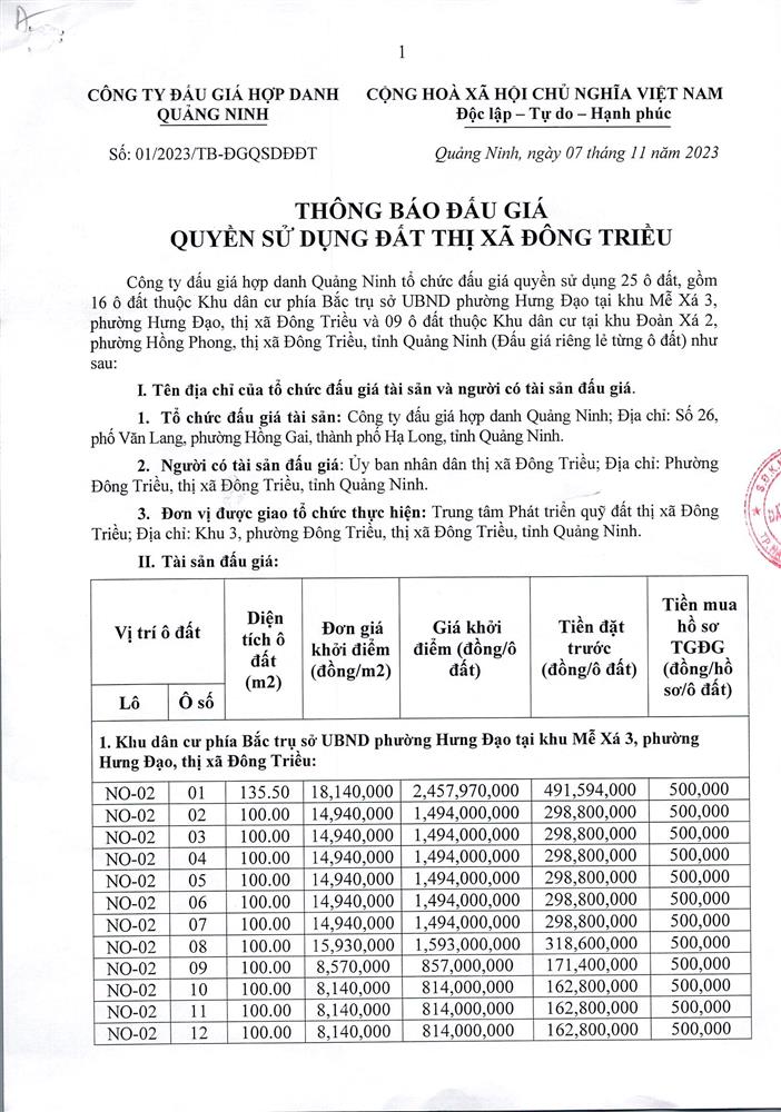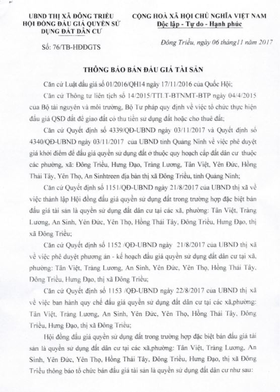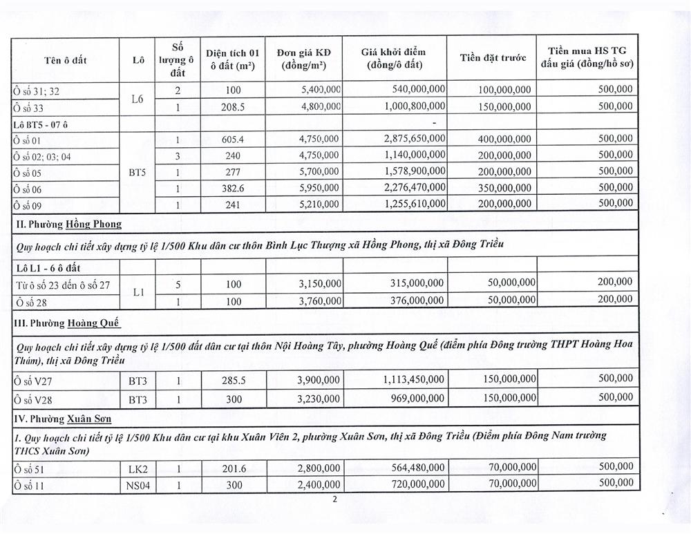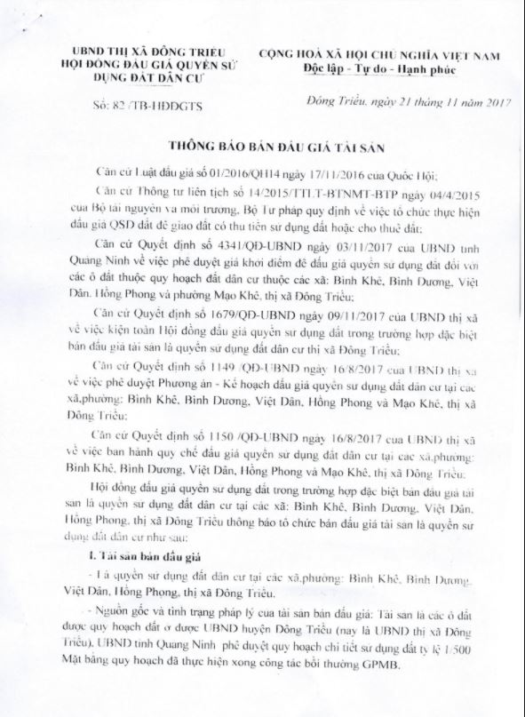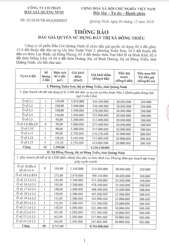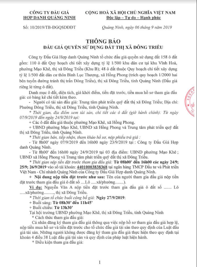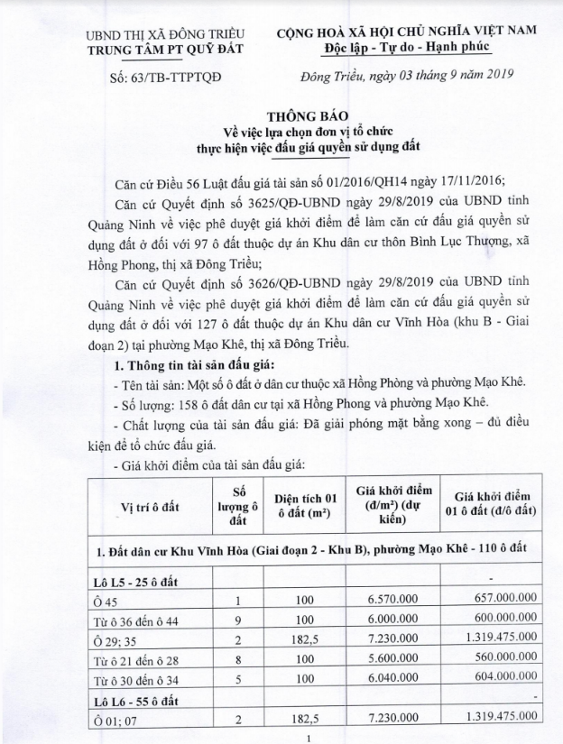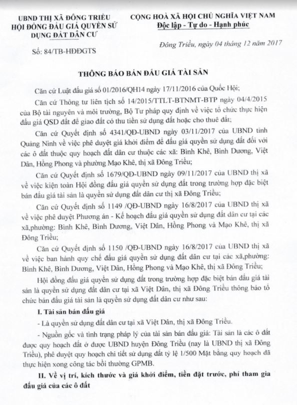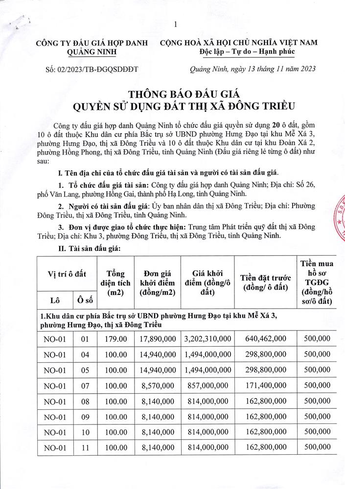 Tổ chức đấu giá Quyền sử dụng 47 ô đất trên địa bàn thị xã Đông Triều, tỉnh Quảng Ninh (Đấu giá riêng lẻ từng ô đất), bao gồm: 07 ô đất tại phường Mạo Khê, 07 ô đất tại xã Bình Khê, 02 ô đất thuộc phường Yên Thọ, 10 ô đất thuộc phường Đức Chính, 02 ô đất thuộc phường Kim Sơn, 02 ô đất thuộc phường Tràng An, 14 ô đất thuộc xã Việt Dân, 03 ô đất thuộc phường Đông Triều