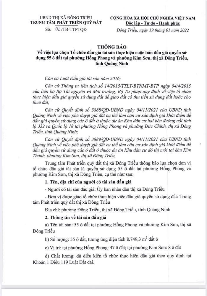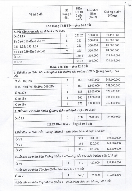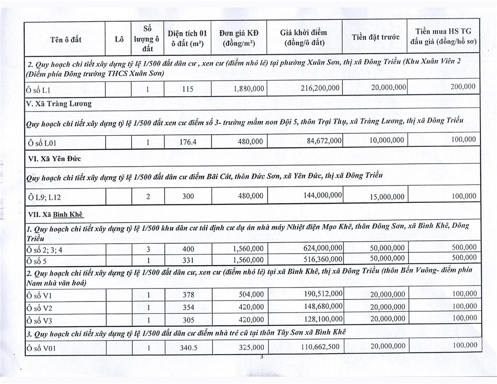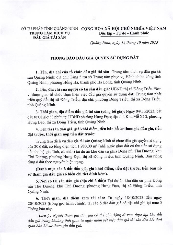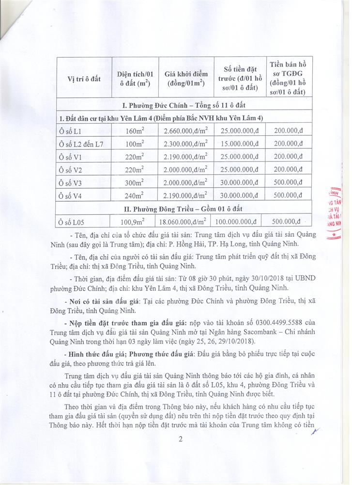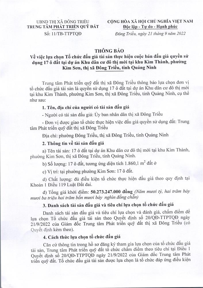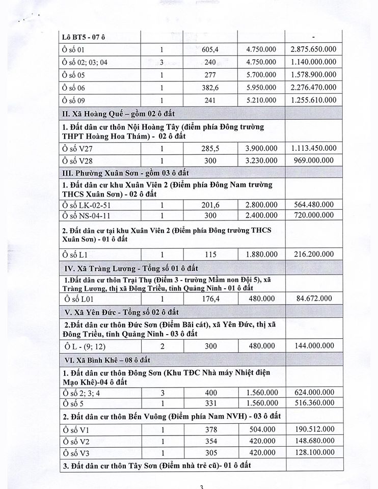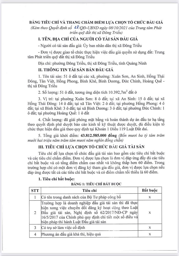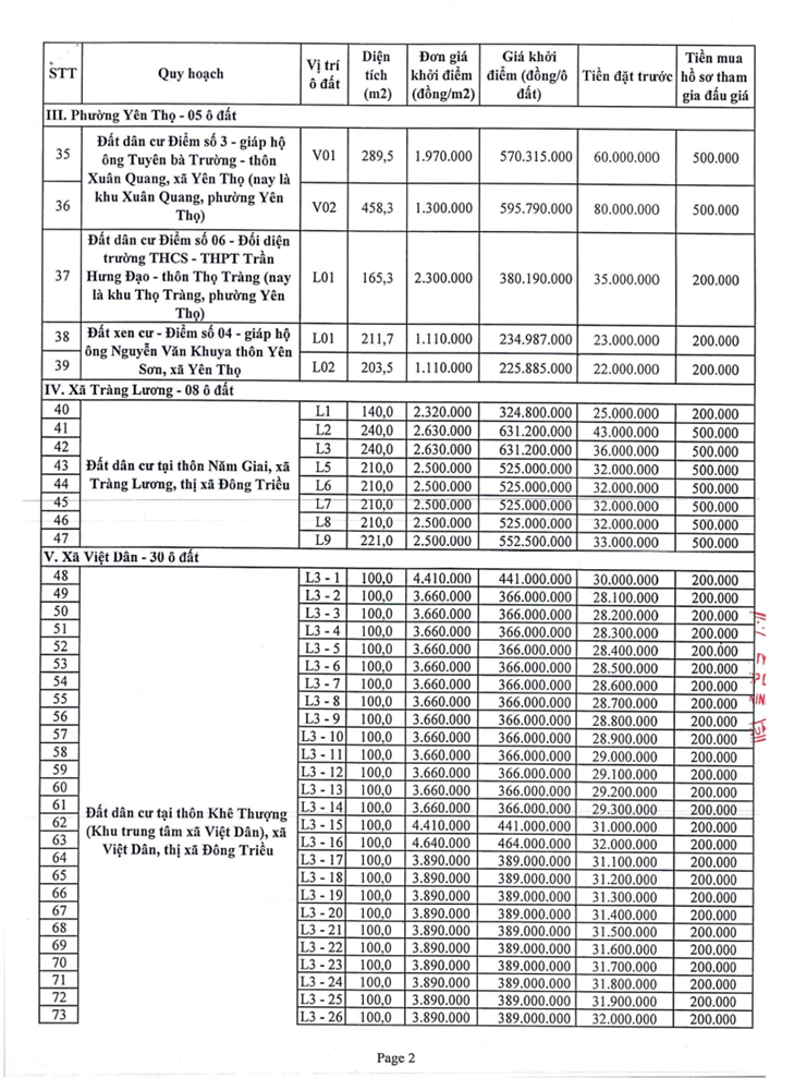 Tổ chức đấu giá Quyền sử dụng 47 ô đất trên địa bàn thị xã Đông Triều, tỉnh Quảng Ninh (Đấu giá riêng lẻ từng ô đất), bao gồm: 07 ô đất tại phường Mạo Khê, 07 ô đất tại xã Bình Khê, 02 ô đất thuộc phường Yên Thọ, 10 ô đất thuộc phường Đức Chính, 02 ô đất thuộc phường Kim Sơn, 02 ô đất thuộc phường Tràng An, 14 ô đất thuộc xã Việt Dân, 03 ô đất thuộc phường Đông Triều
