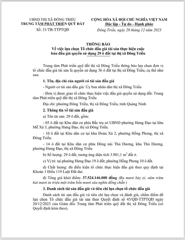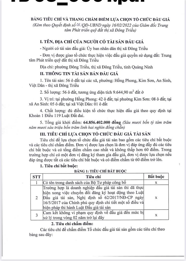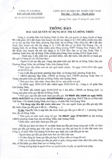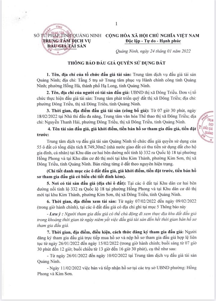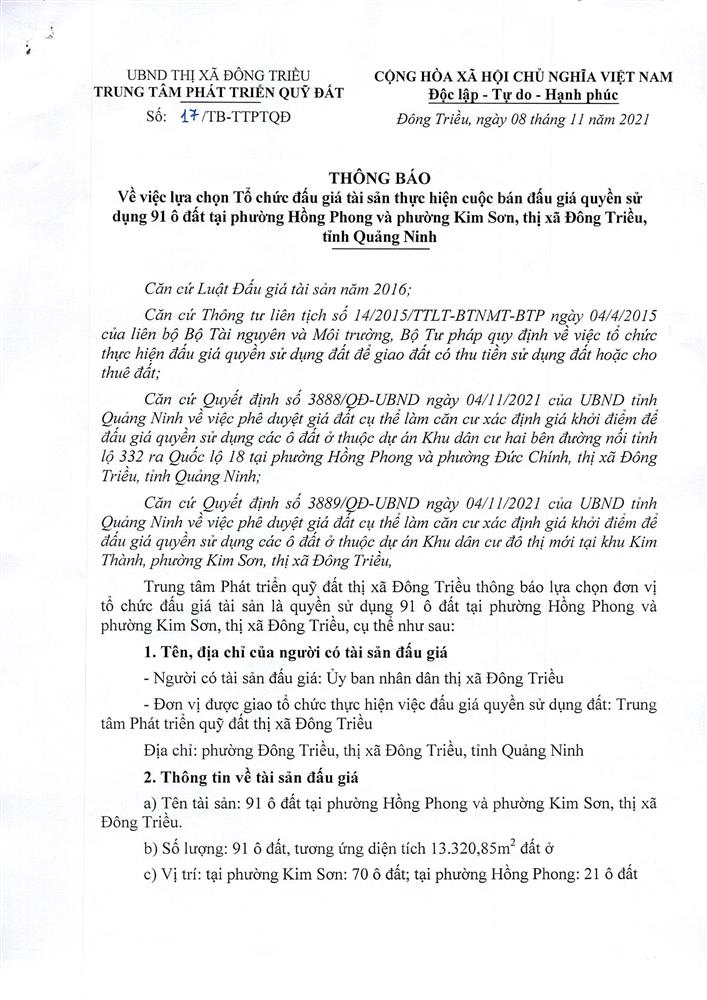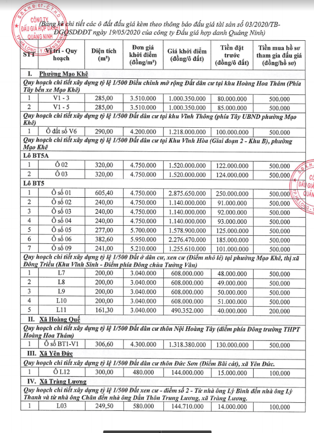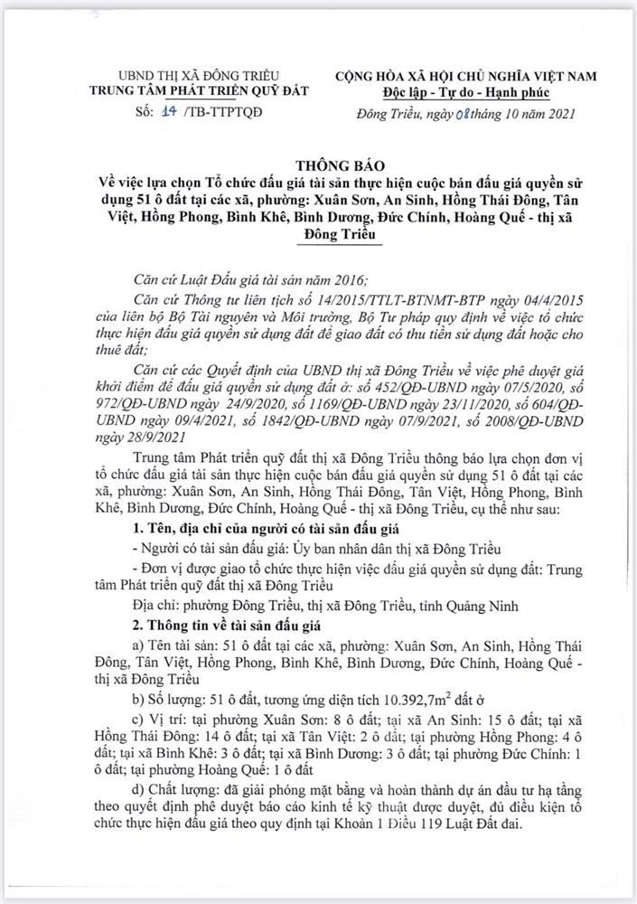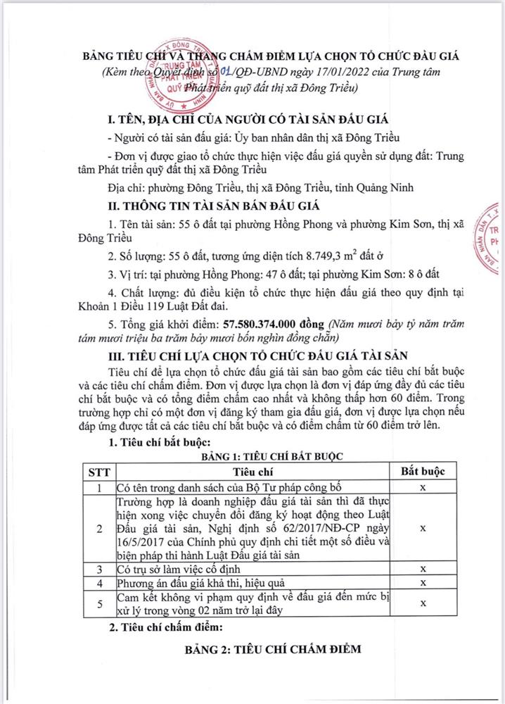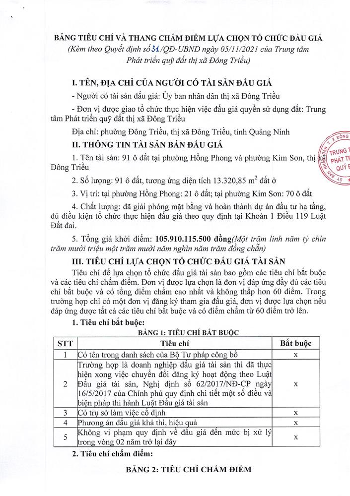 Tổ chức đấu giá Quyền sử dụng 47 ô đất trên địa bàn thị xã Đông Triều, tỉnh Quảng Ninh (Đấu giá riêng lẻ từng ô đất), bao gồm: 07 ô đất tại phường Mạo Khê, 07 ô đất tại xã Bình Khê, 02 ô đất thuộc phường Yên Thọ, 10 ô đất thuộc phường Đức Chính, 02 ô đất thuộc phường Kim Sơn, 02 ô đất thuộc phường Tràng An, 14 ô đất thuộc xã Việt Dân, 03 ô đất thuộc phường Đông Triều