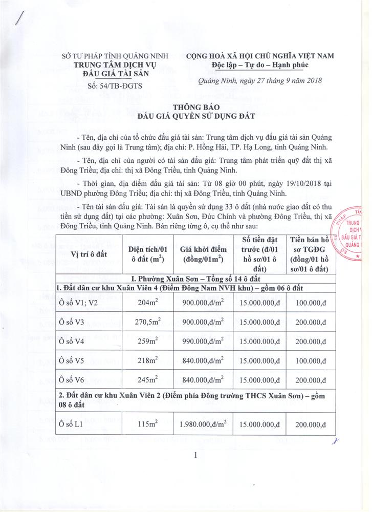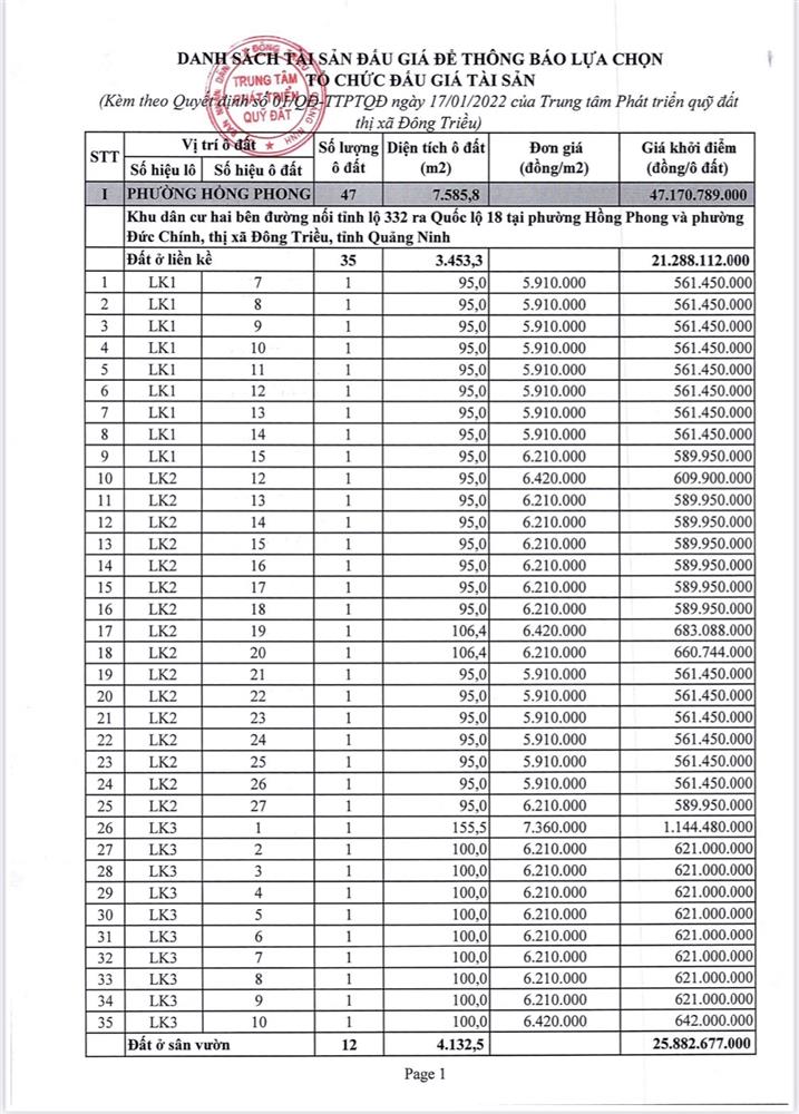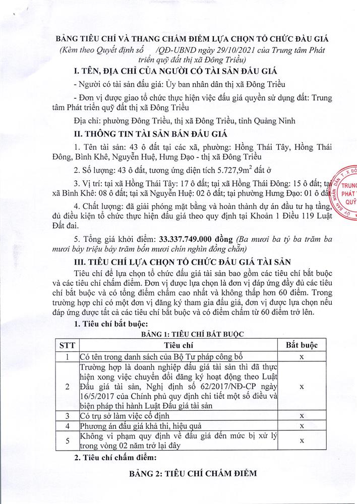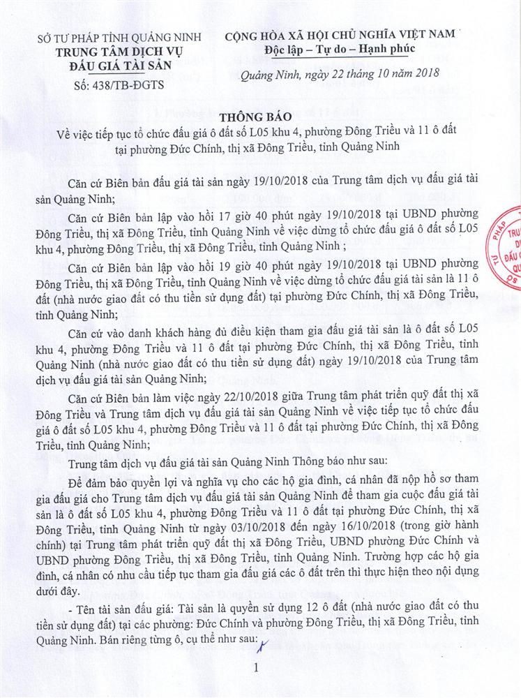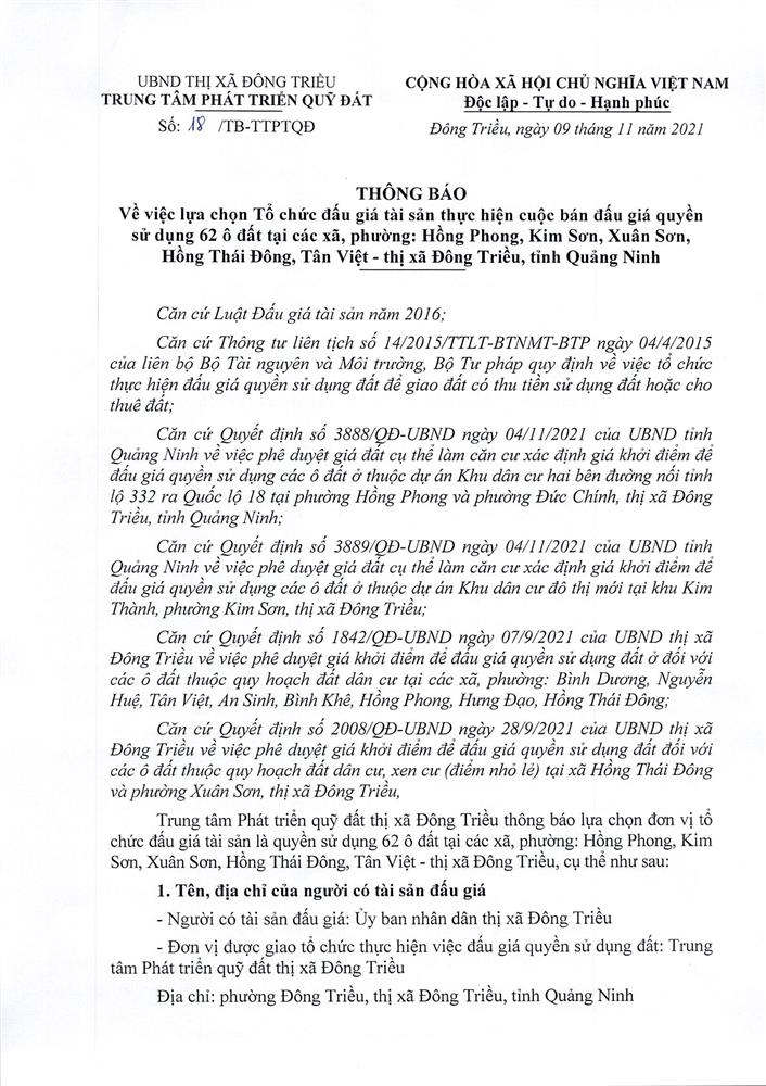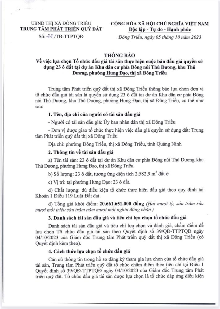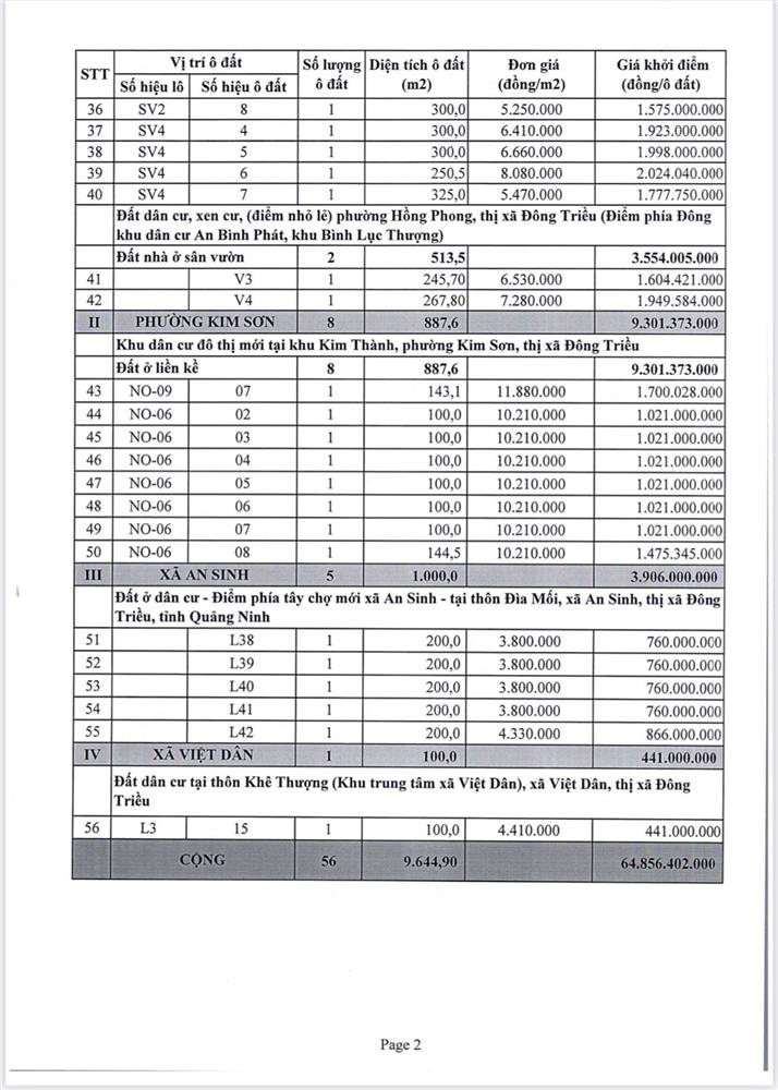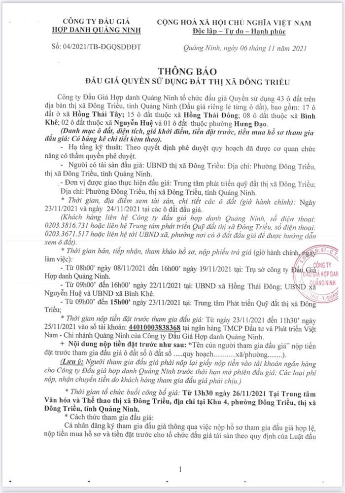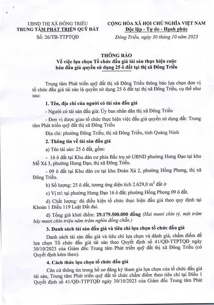 Tổ chức đấu giá Quyền sử dụng 47 ô đất trên địa bàn thị xã Đông Triều, tỉnh Quảng Ninh (Đấu giá riêng lẻ từng ô đất), bao gồm: 07 ô đất tại phường Mạo Khê, 07 ô đất tại xã Bình Khê, 02 ô đất thuộc phường Yên Thọ, 10 ô đất thuộc phường Đức Chính, 02 ô đất thuộc phường Kim Sơn, 02 ô đất thuộc phường Tràng An, 14 ô đất thuộc xã Việt Dân, 03 ô đất thuộc phường Đông Triều