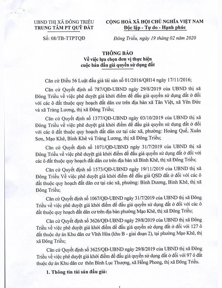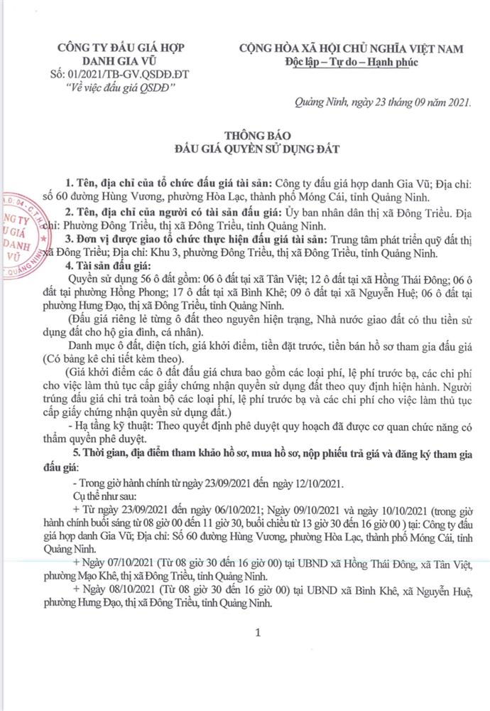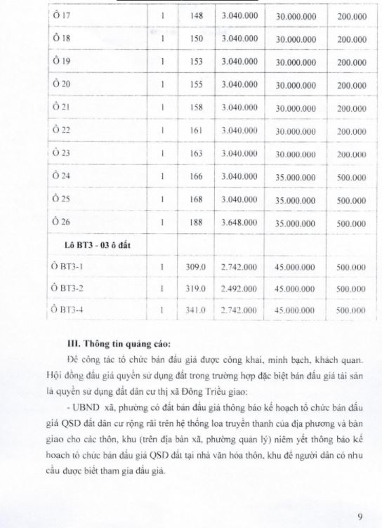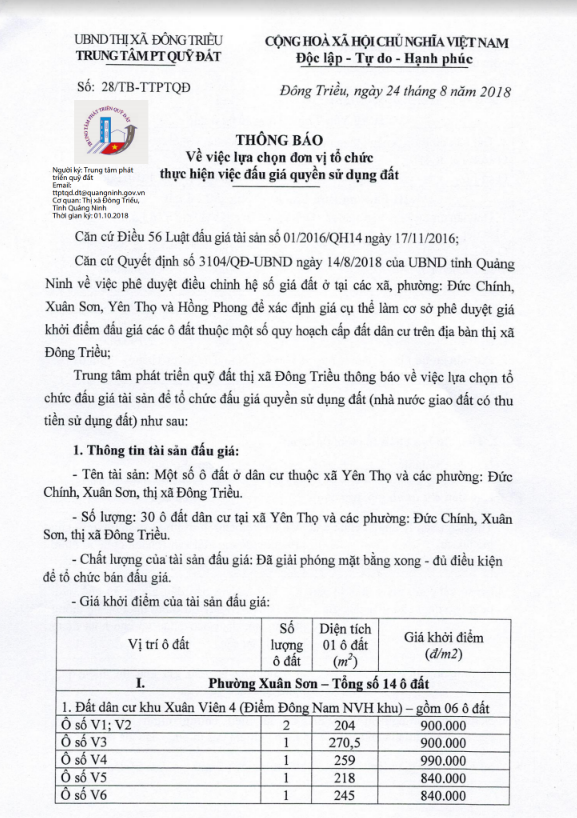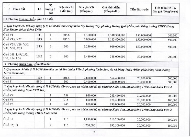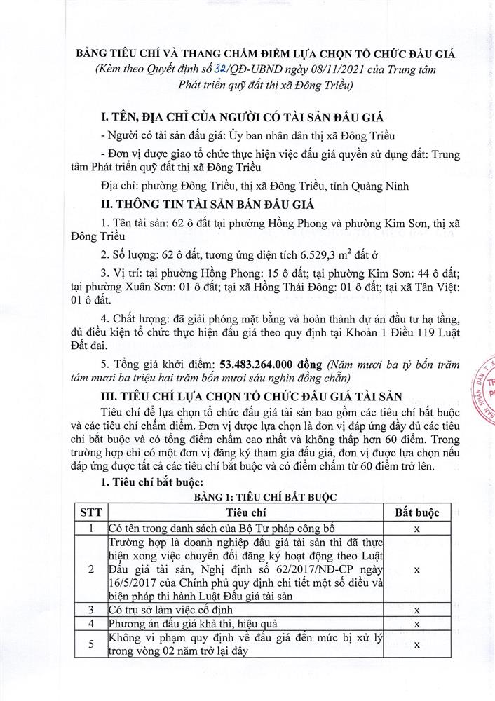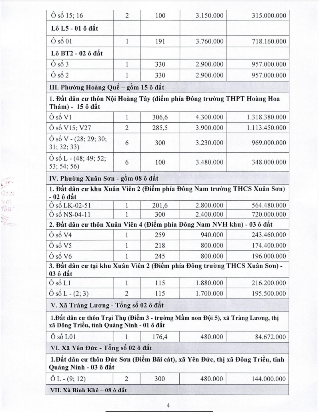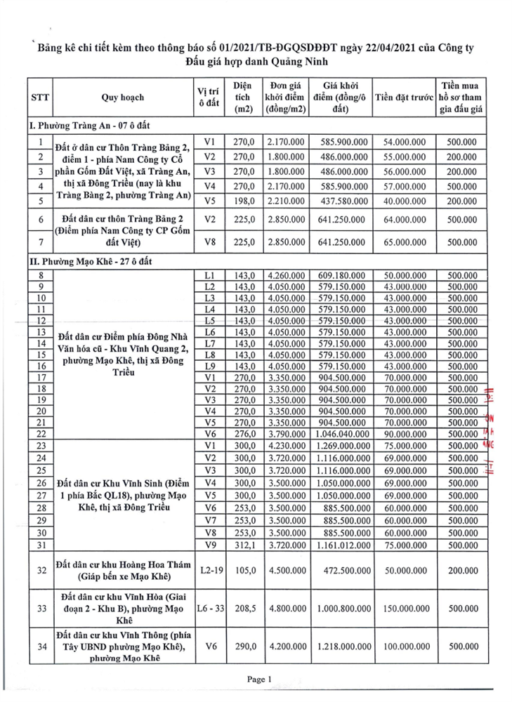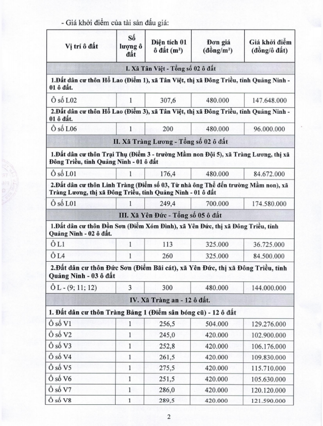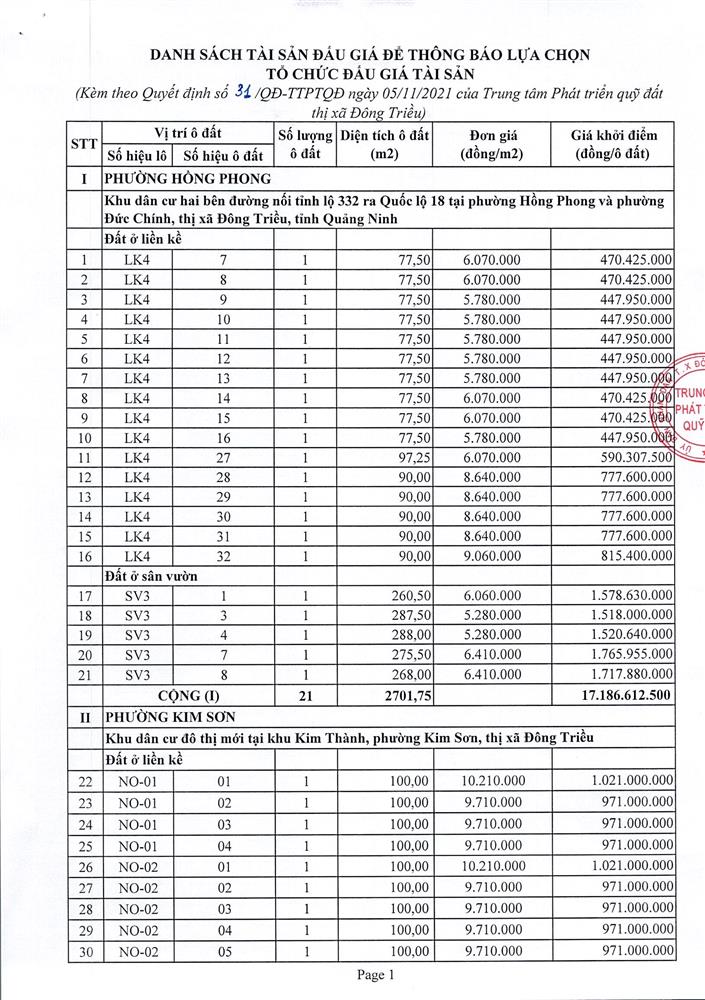 Tổ chức đấu giá Quyền sử dụng 47 ô đất trên địa bàn thị xã Đông Triều, tỉnh Quảng Ninh (Đấu giá riêng lẻ từng ô đất), bao gồm: 07 ô đất tại phường Mạo Khê, 07 ô đất tại xã Bình Khê, 02 ô đất thuộc phường Yên Thọ, 10 ô đất thuộc phường Đức Chính, 02 ô đất thuộc phường Kim Sơn, 02 ô đất thuộc phường Tràng An, 14 ô đất thuộc xã Việt Dân, 03 ô đất thuộc phường Đông Triều