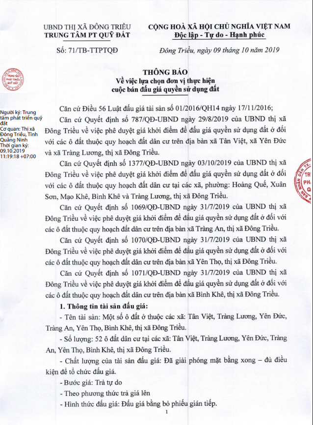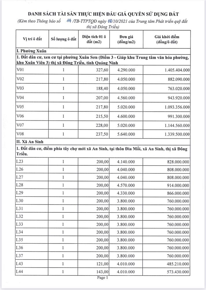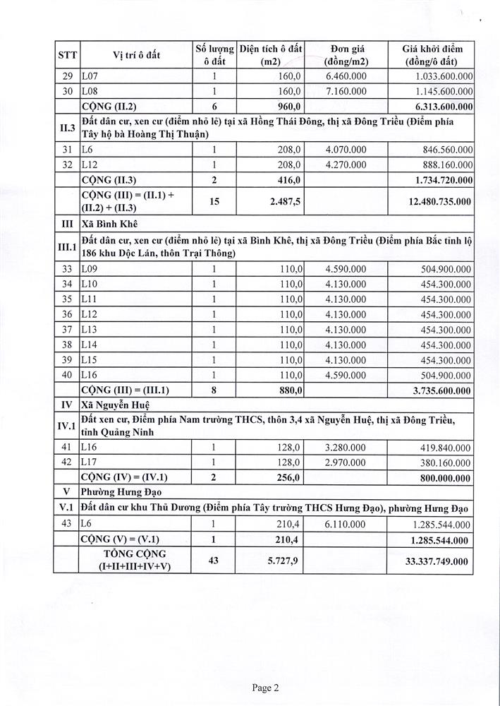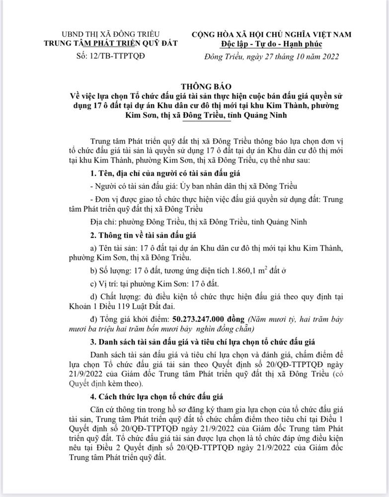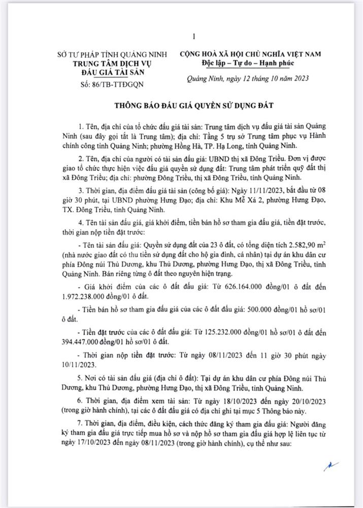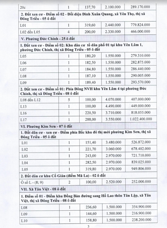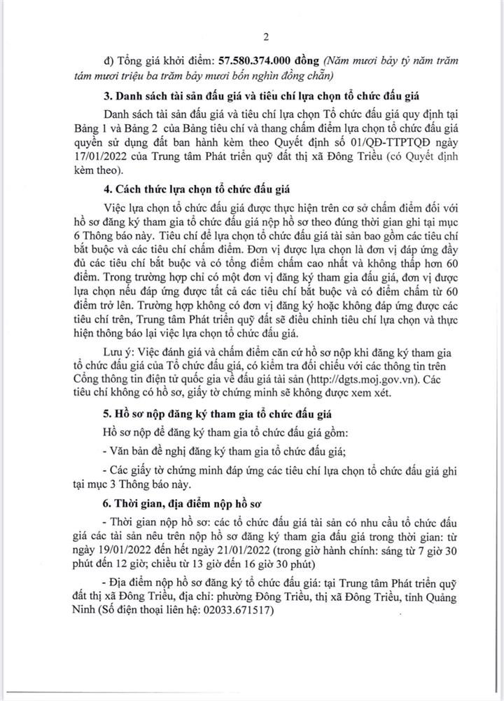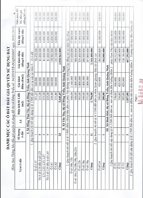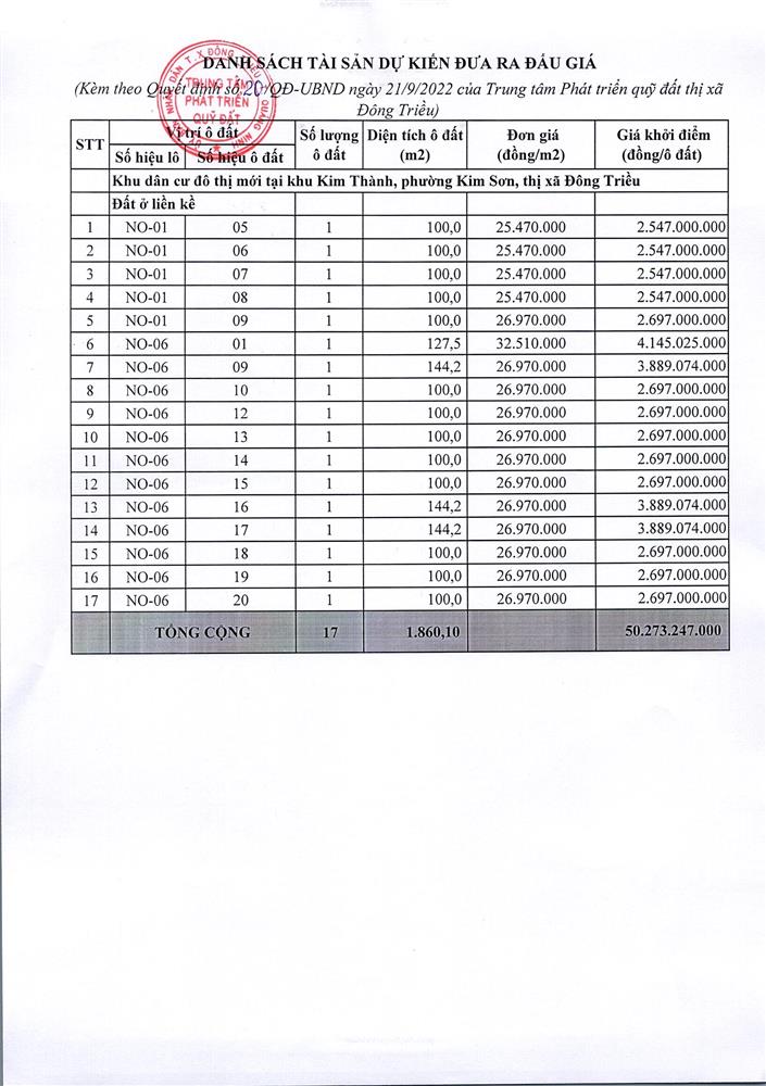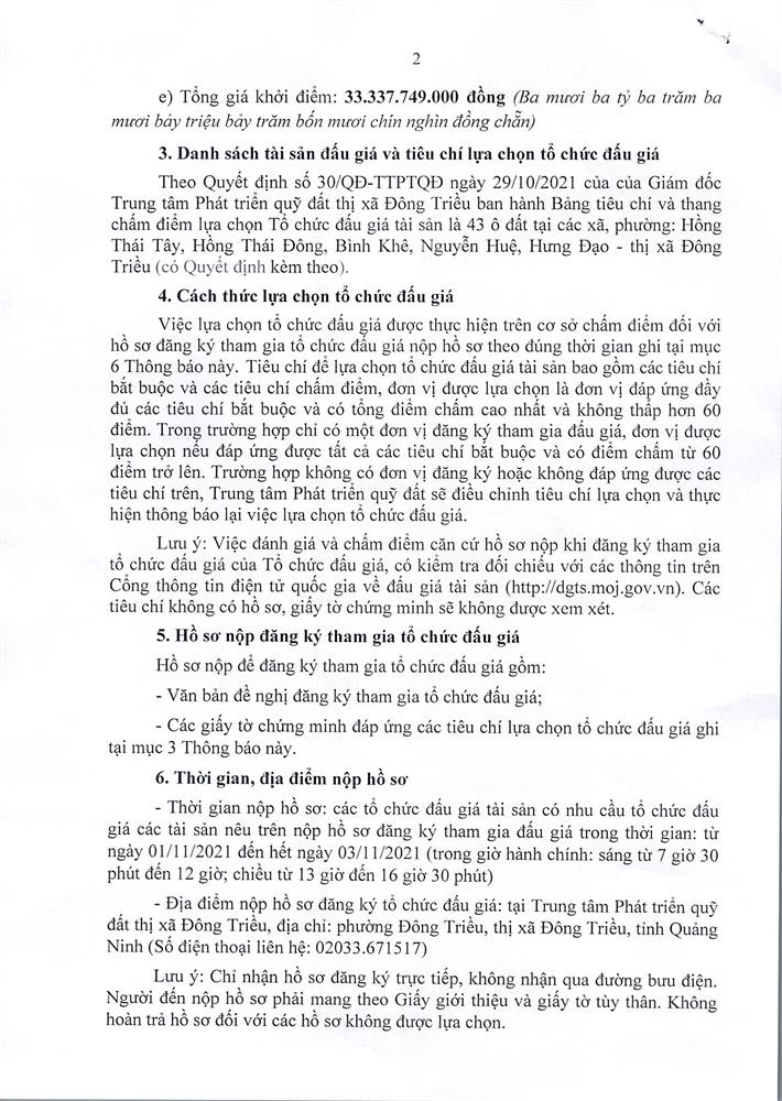 Tổ chức đấu giá Quyền sử dụng 47 ô đất trên địa bàn thị xã Đông Triều, tỉnh Quảng Ninh (Đấu giá riêng lẻ từng ô đất), bao gồm: 07 ô đất tại phường Mạo Khê, 07 ô đất tại xã Bình Khê, 02 ô đất thuộc phường Yên Thọ, 10 ô đất thuộc phường Đức Chính, 02 ô đất thuộc phường Kim Sơn, 02 ô đất thuộc phường Tràng An, 14 ô đất thuộc xã Việt Dân, 03 ô đất thuộc phường Đông Triều