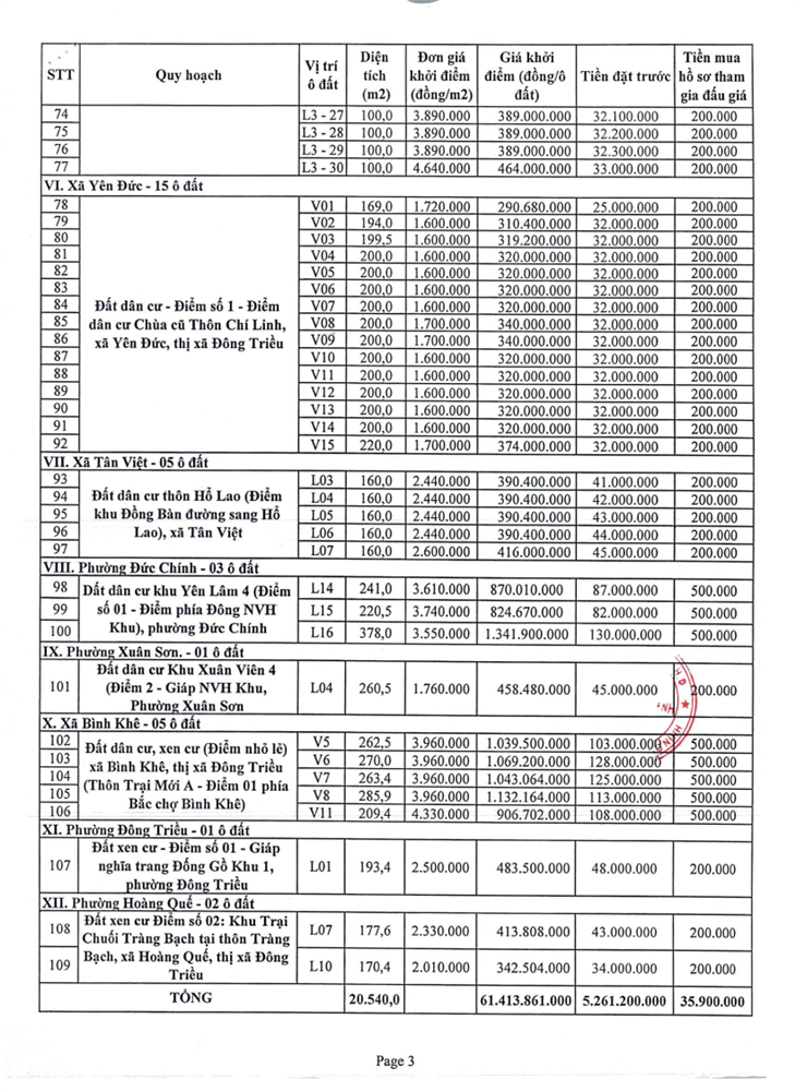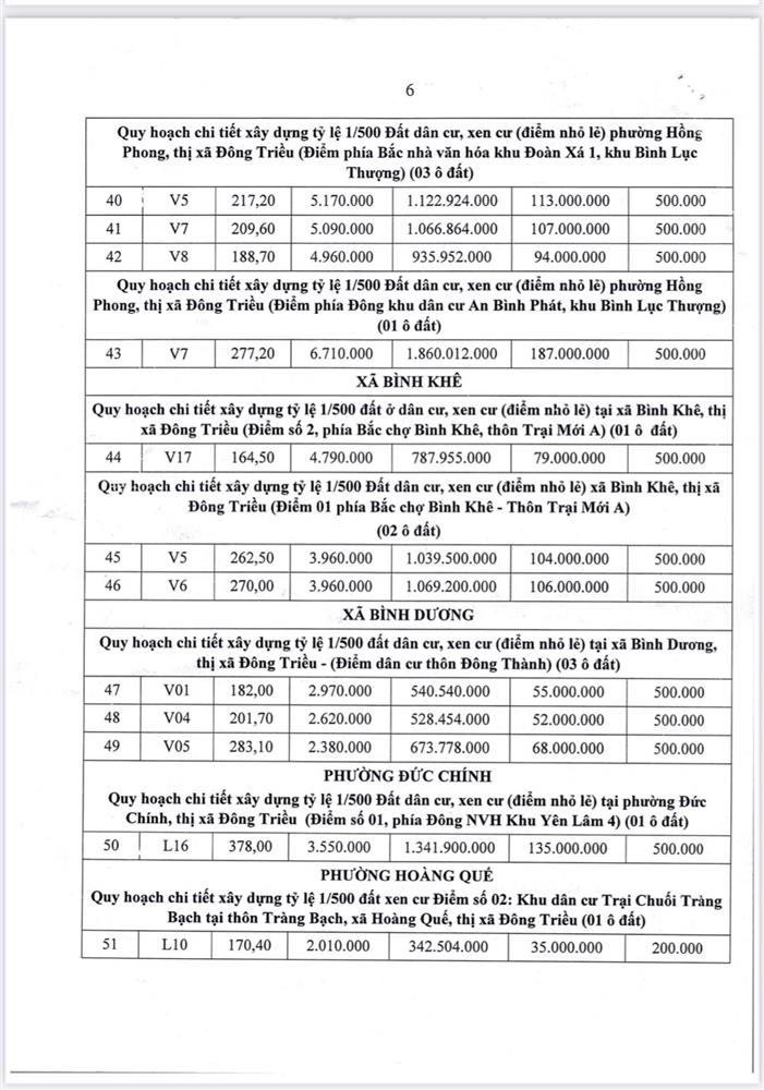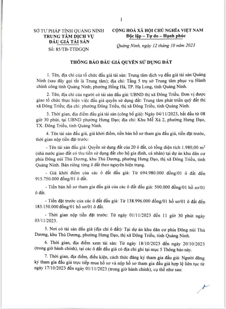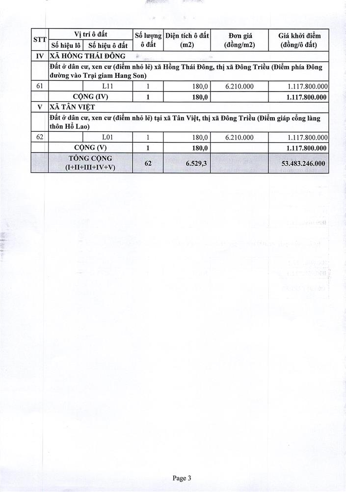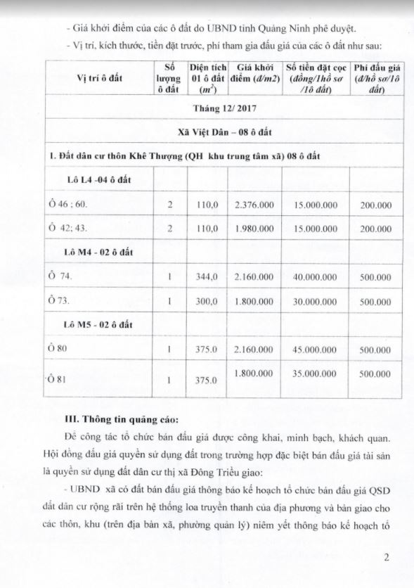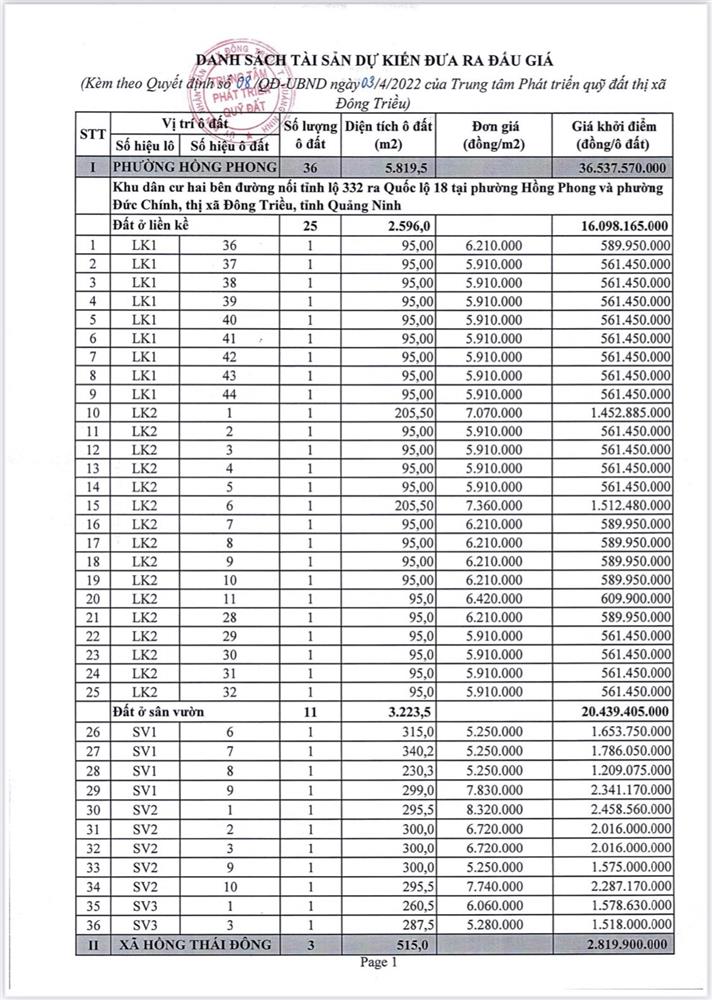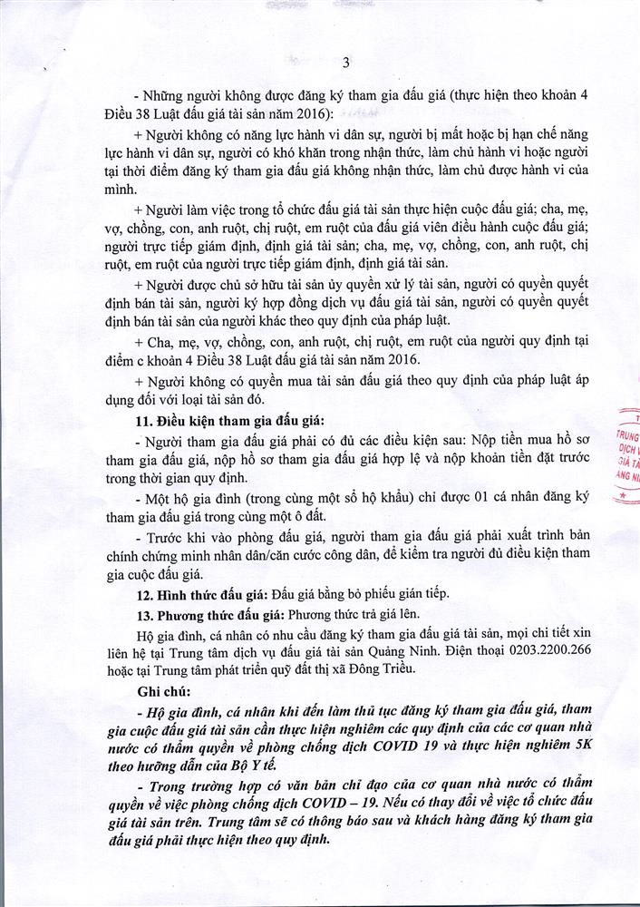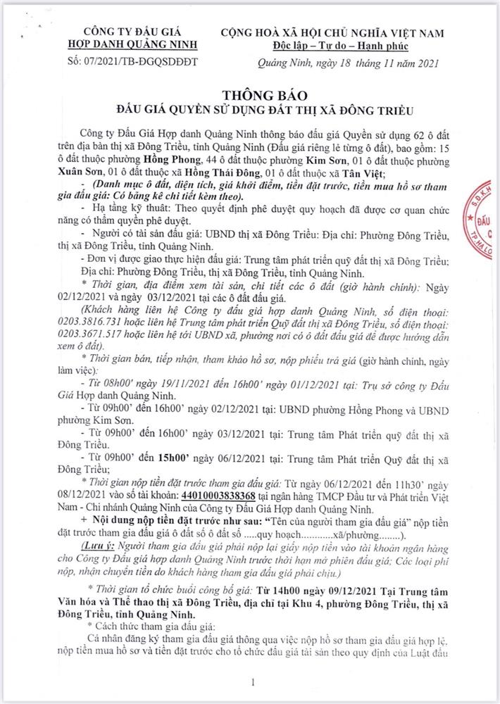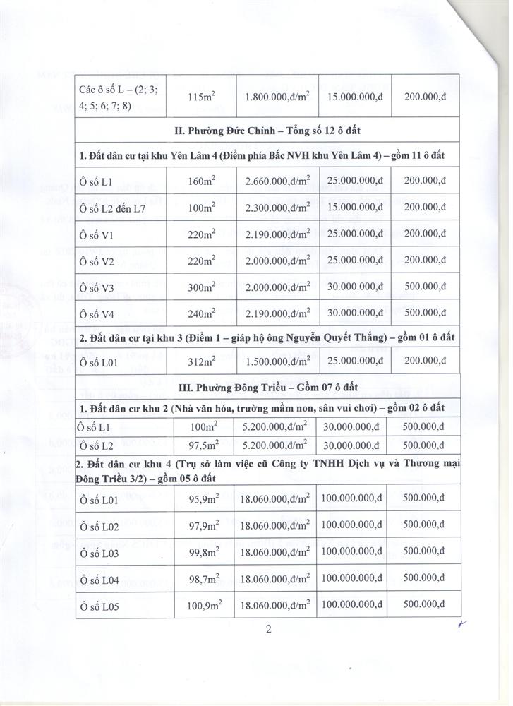 Tổ chức đấu giá Quyền sử dụng 47 ô đất trên địa bàn thị xã Đông Triều, tỉnh Quảng Ninh (Đấu giá riêng lẻ từng ô đất), bao gồm: 07 ô đất tại phường Mạo Khê, 07 ô đất tại xã Bình Khê, 02 ô đất thuộc phường Yên Thọ, 10 ô đất thuộc phường Đức Chính, 02 ô đất thuộc phường Kim Sơn, 02 ô đất thuộc phường Tràng An, 14 ô đất thuộc xã Việt Dân, 03 ô đất thuộc phường Đông Triều