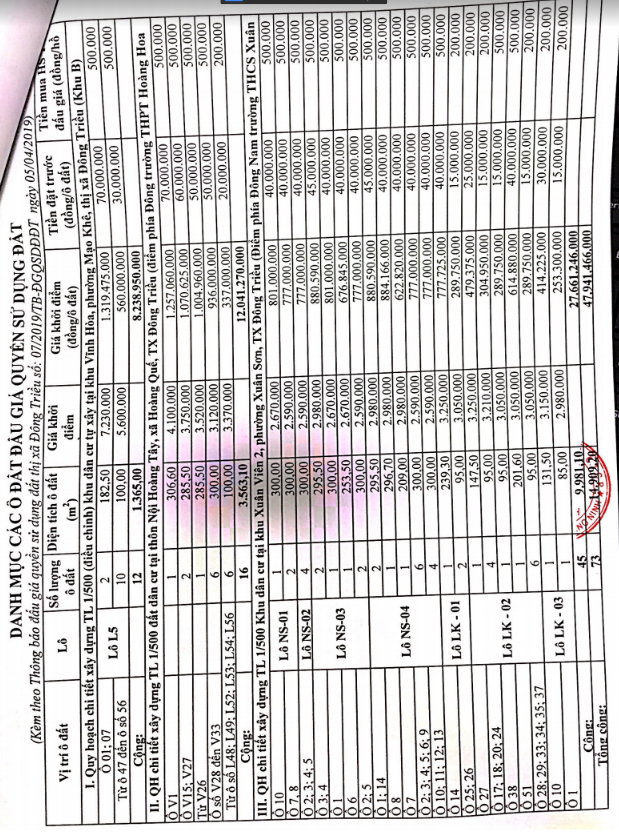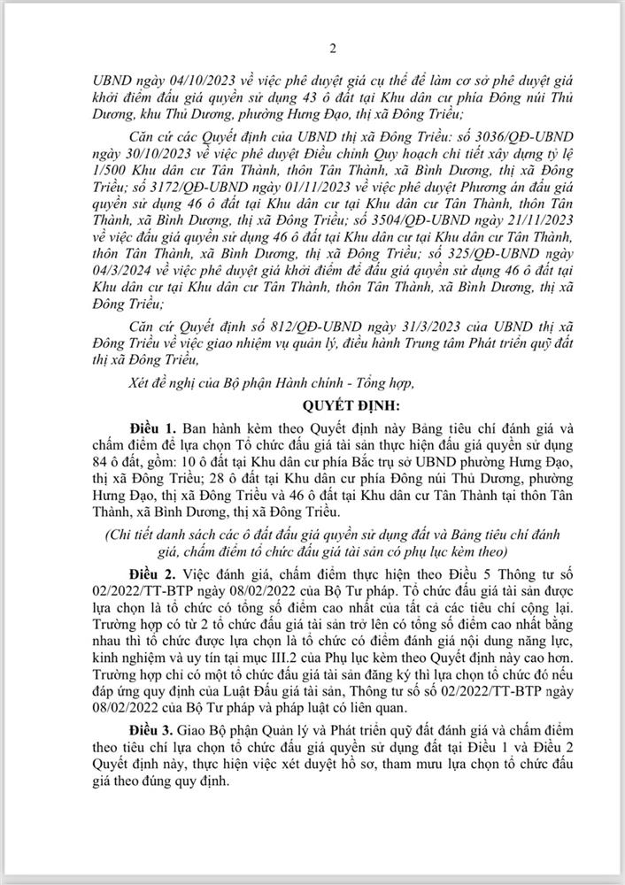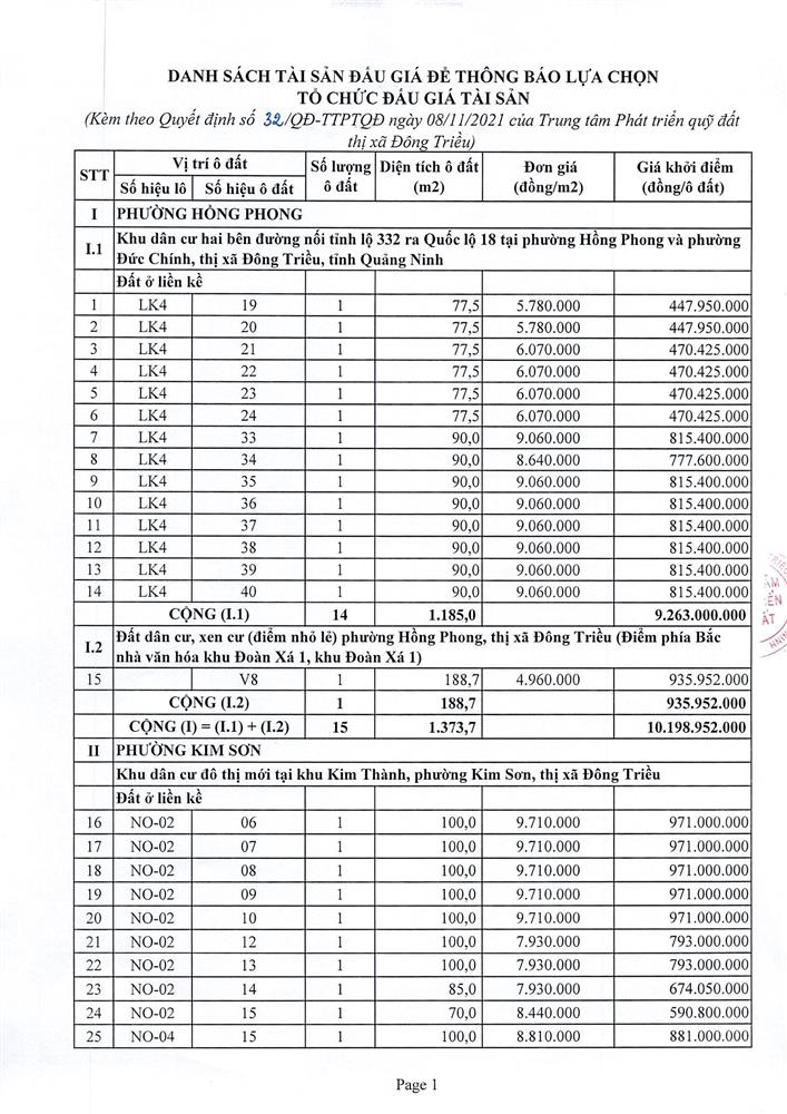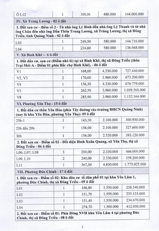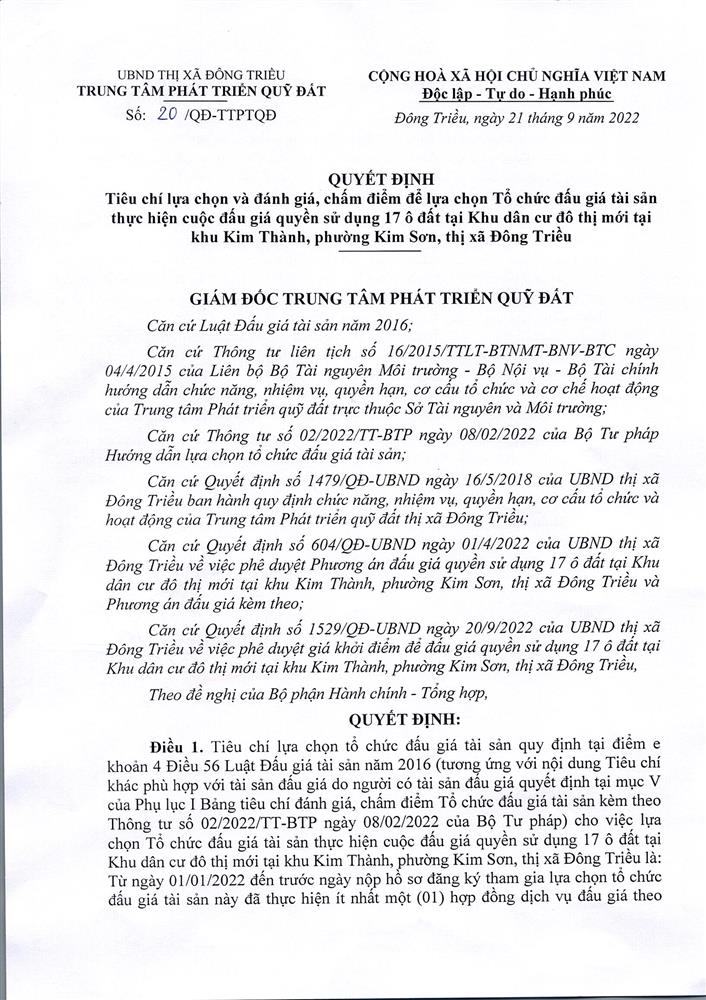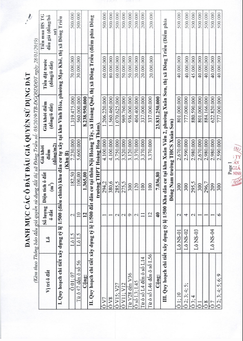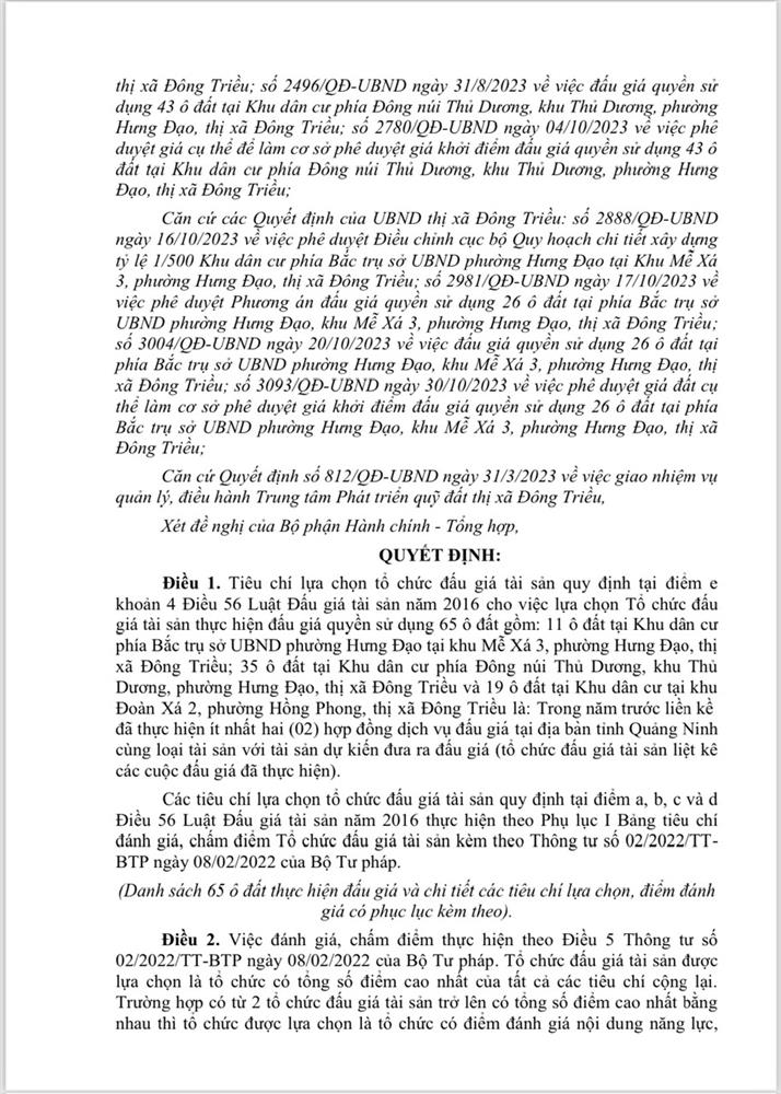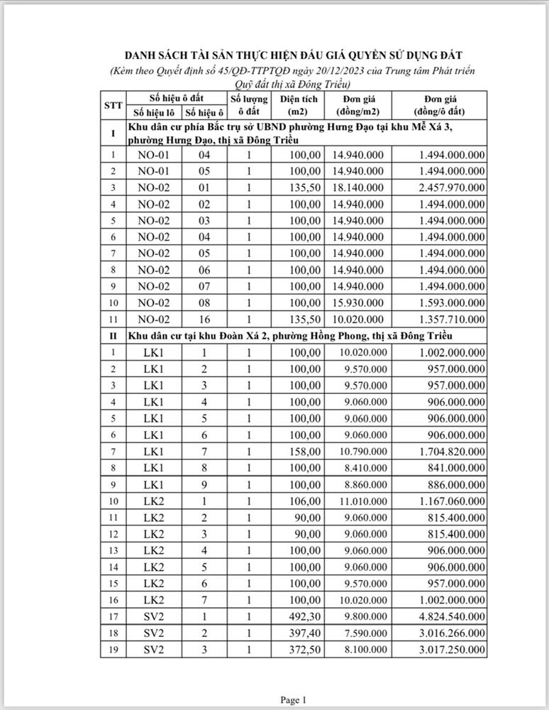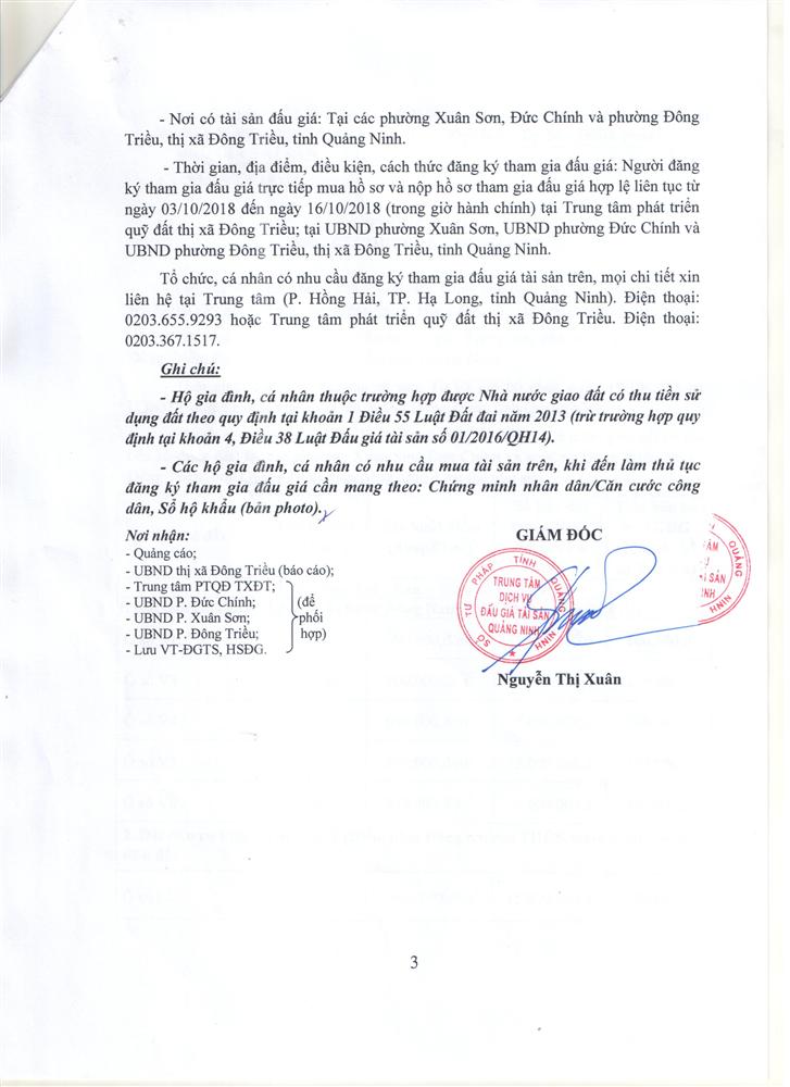 Tổ chức đấu giá Quyền sử dụng 47 ô đất trên địa bàn thị xã Đông Triều, tỉnh Quảng Ninh (Đấu giá riêng lẻ từng ô đất), bao gồm: 07 ô đất tại phường Mạo Khê, 07 ô đất tại xã Bình Khê, 02 ô đất thuộc phường Yên Thọ, 10 ô đất thuộc phường Đức Chính, 02 ô đất thuộc phường Kim Sơn, 02 ô đất thuộc phường Tràng An, 14 ô đất thuộc xã Việt Dân, 03 ô đất thuộc phường Đông Triều