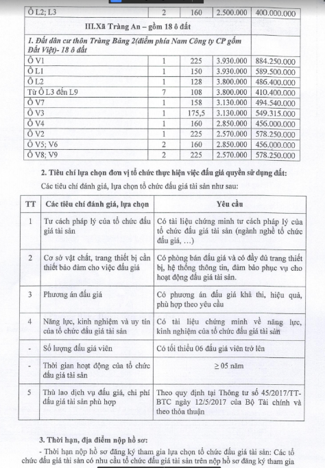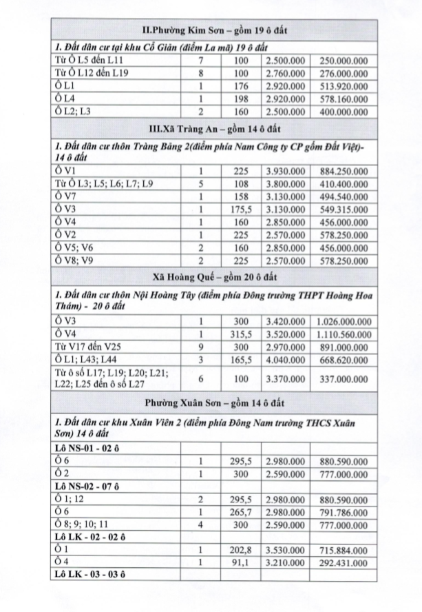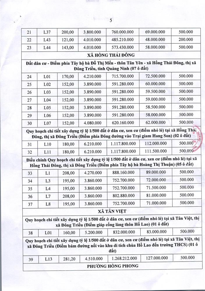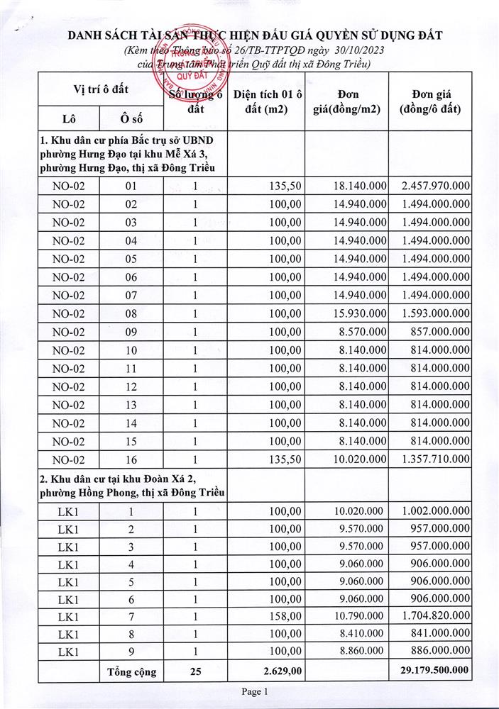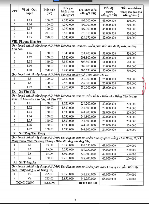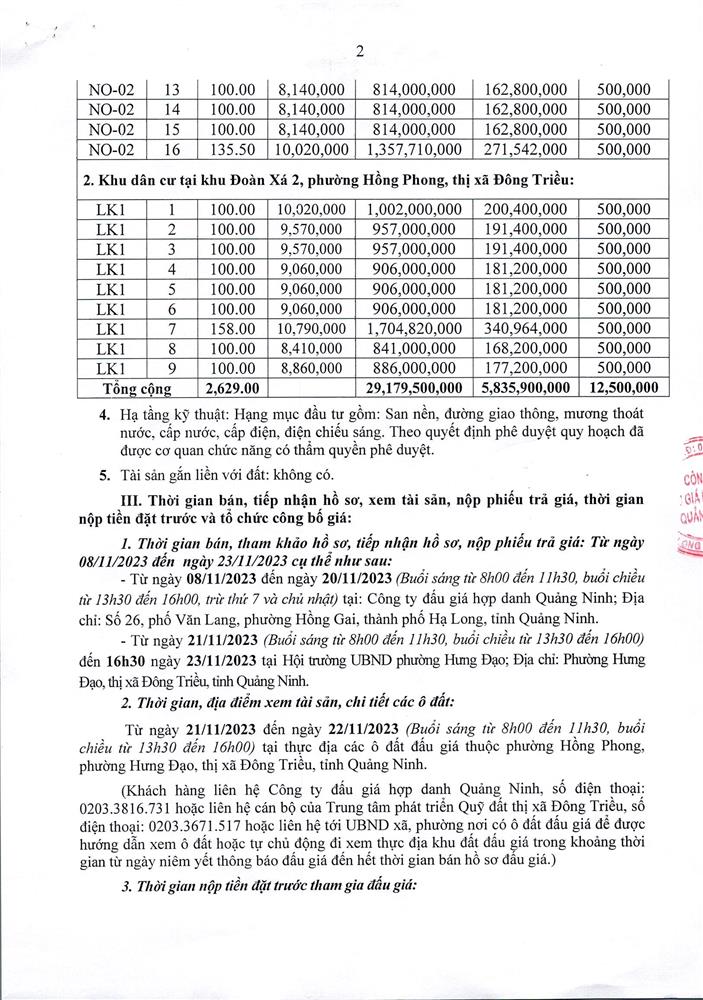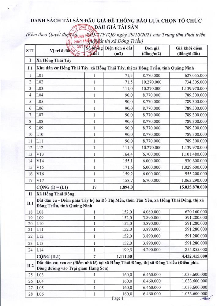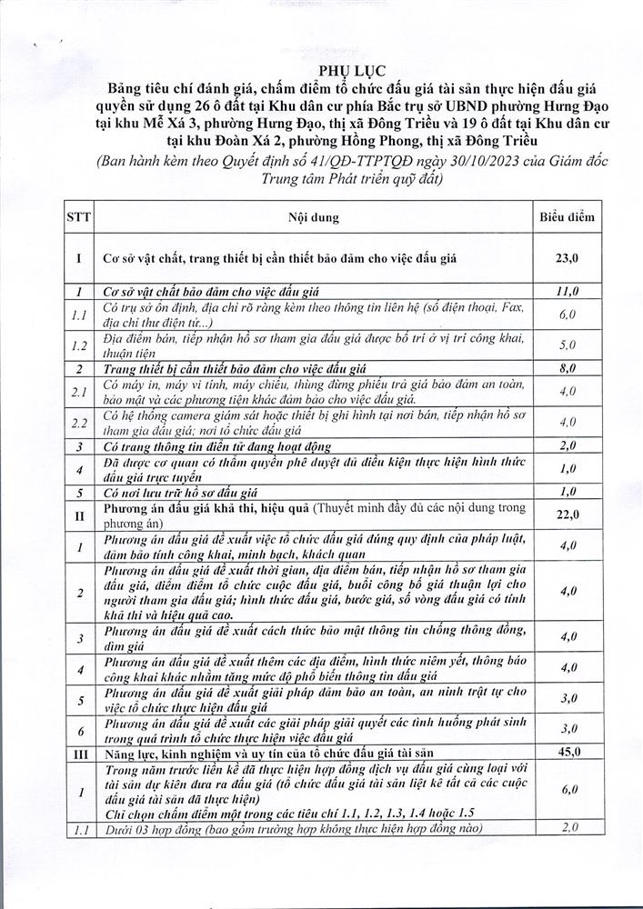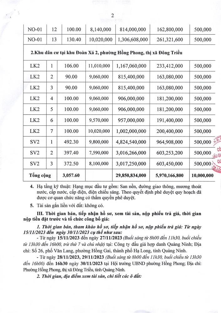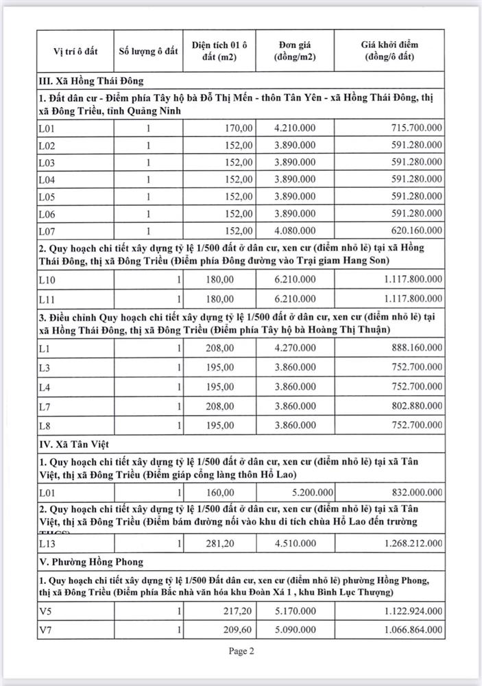 Tổ chức đấu giá Quyền sử dụng 47 ô đất trên địa bàn thị xã Đông Triều, tỉnh Quảng Ninh (Đấu giá riêng lẻ từng ô đất), bao gồm: 07 ô đất tại phường Mạo Khê, 07 ô đất tại xã Bình Khê, 02 ô đất thuộc phường Yên Thọ, 10 ô đất thuộc phường Đức Chính, 02 ô đất thuộc phường Kim Sơn, 02 ô đất thuộc phường Tràng An, 14 ô đất thuộc xã Việt Dân, 03 ô đất thuộc phường Đông Triều