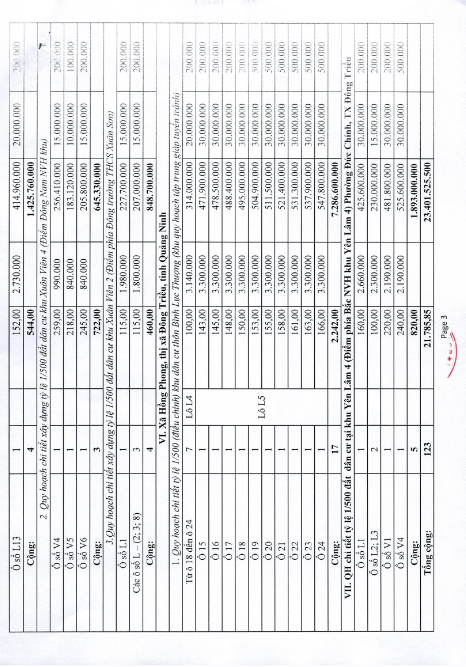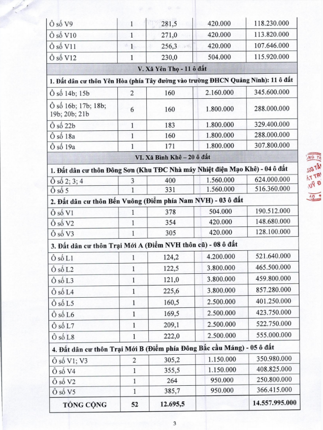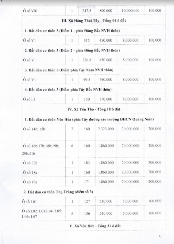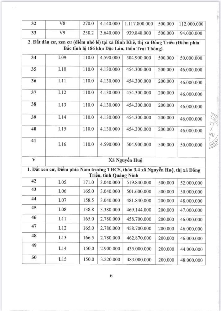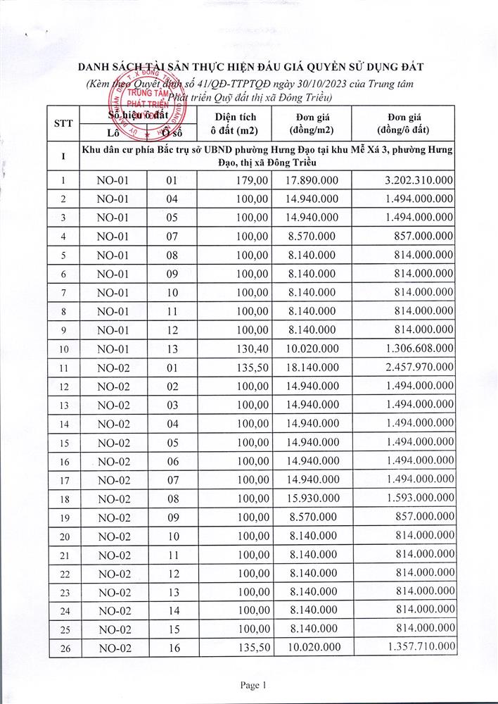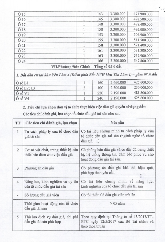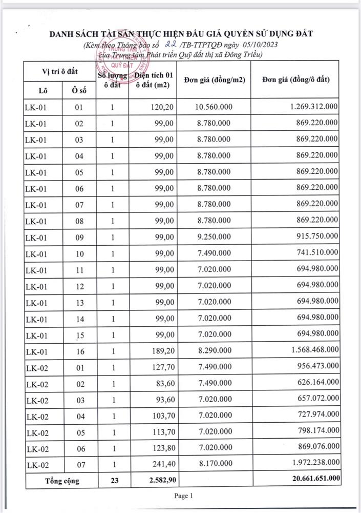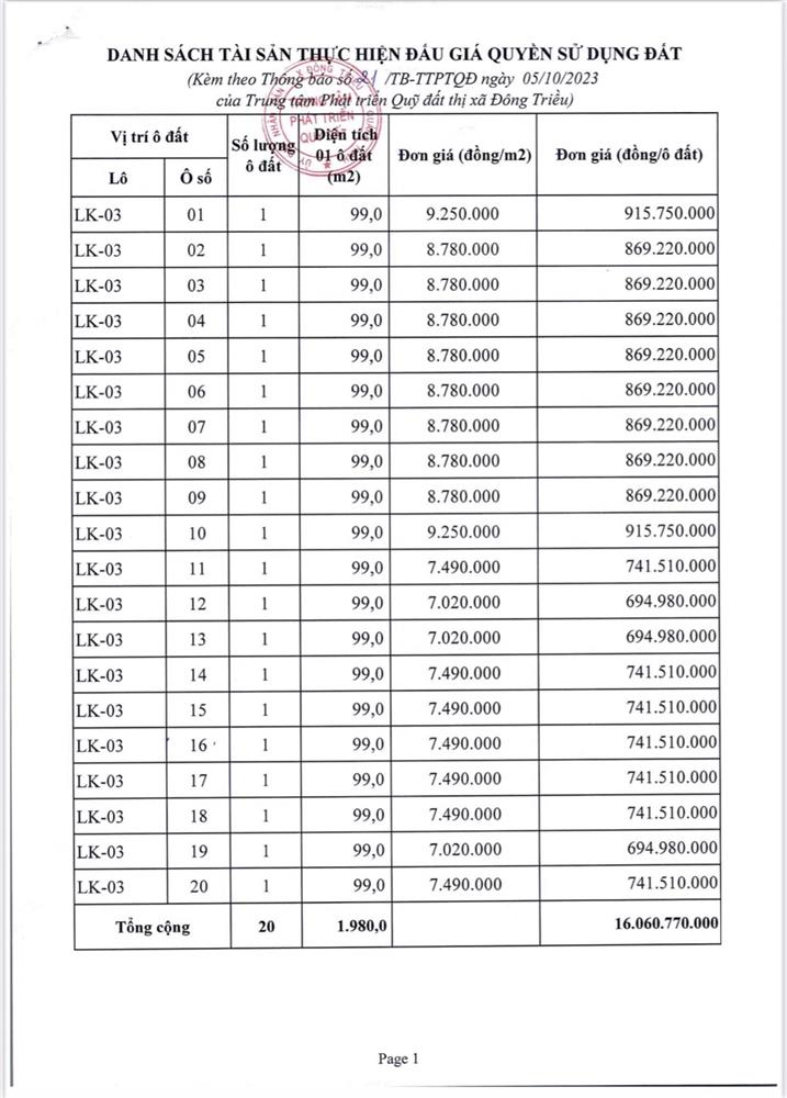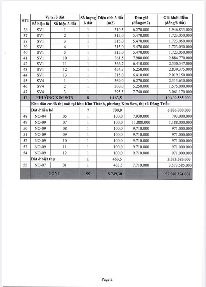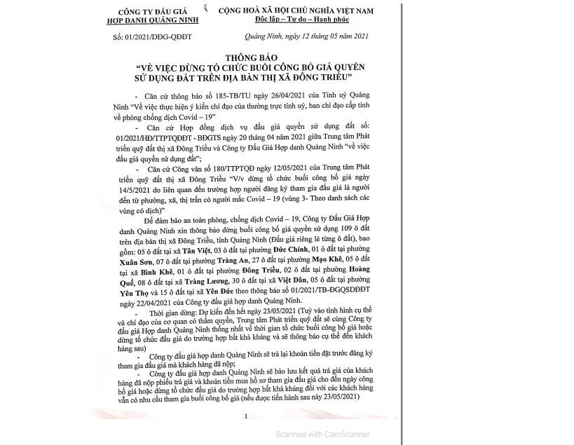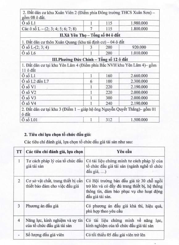 Tổ chức đấu giá Quyền sử dụng 47 ô đất trên địa bàn thị xã Đông Triều, tỉnh Quảng Ninh (Đấu giá riêng lẻ từng ô đất), bao gồm: 07 ô đất tại phường Mạo Khê, 07 ô đất tại xã Bình Khê, 02 ô đất thuộc phường Yên Thọ, 10 ô đất thuộc phường Đức Chính, 02 ô đất thuộc phường Kim Sơn, 02 ô đất thuộc phường Tràng An, 14 ô đất thuộc xã Việt Dân, 03 ô đất thuộc phường Đông Triều