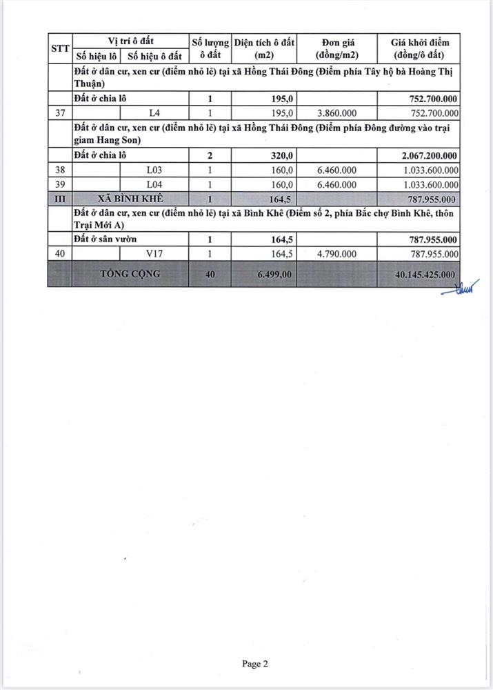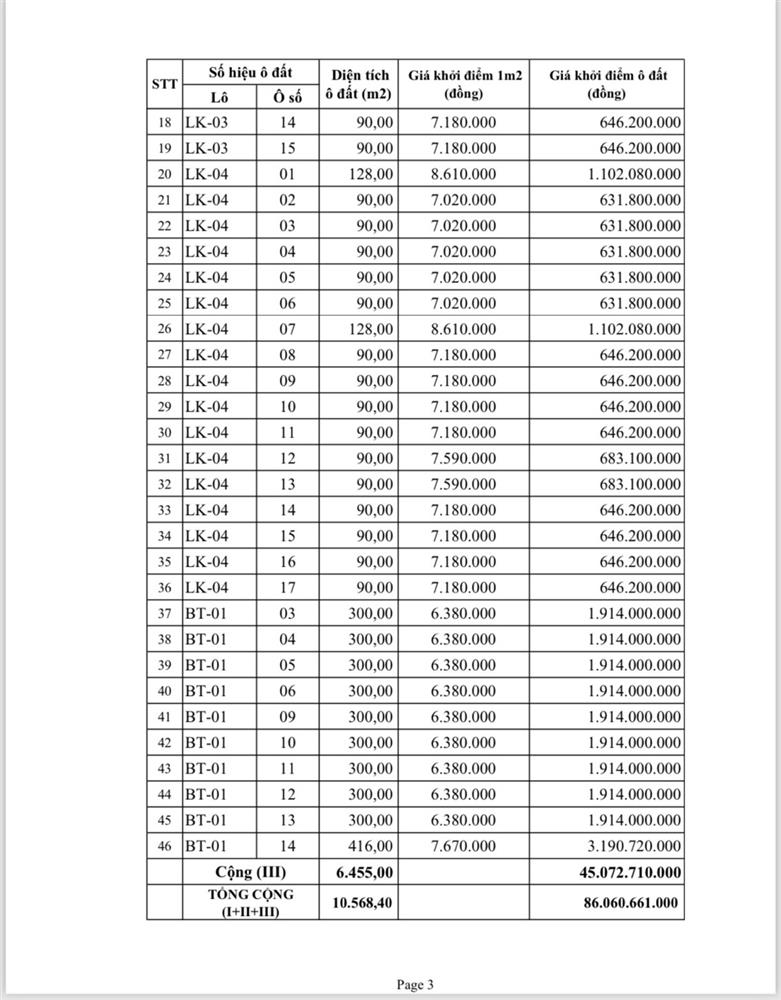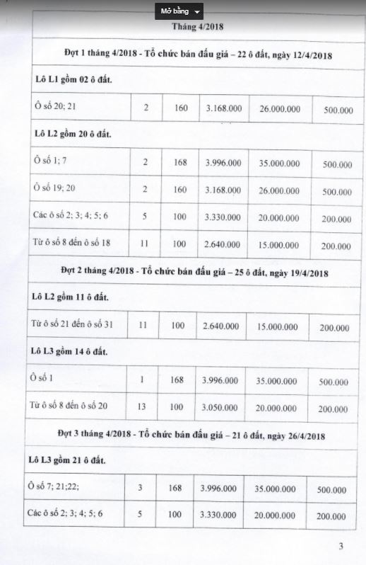 Về vị trí, kích thước và giá khởi điểm, tiền đặt trước, phí tham gia đấu giá của các ô đất