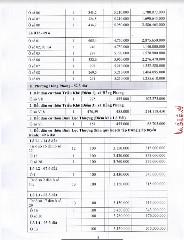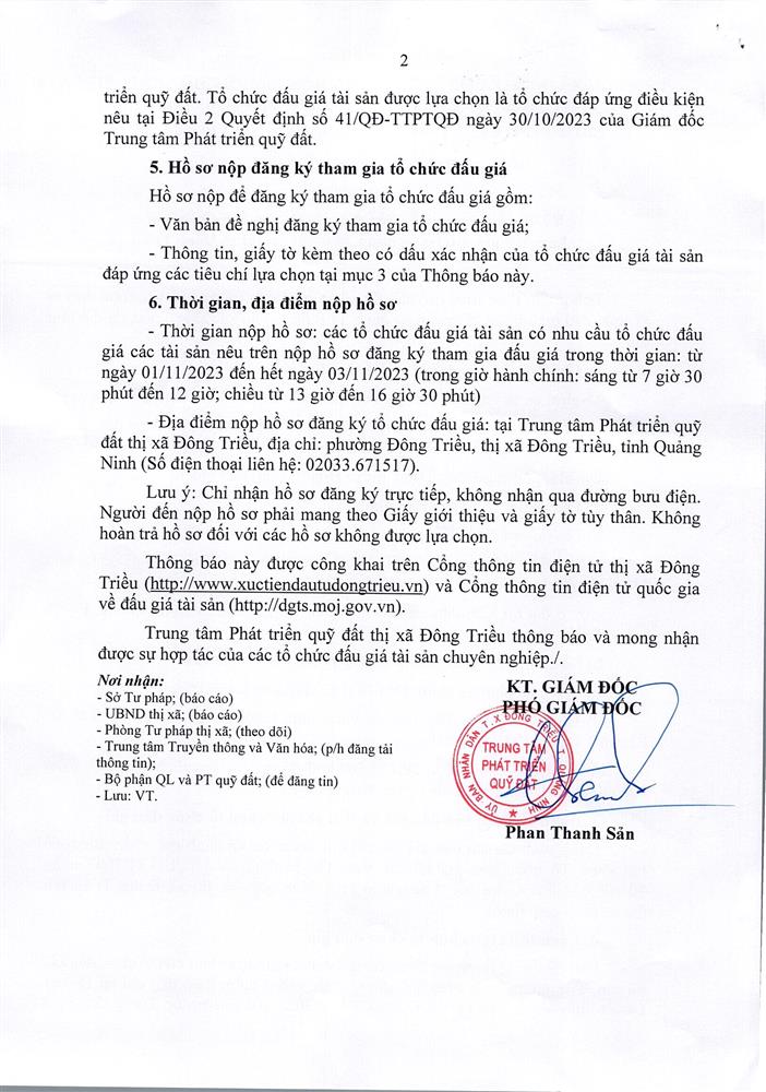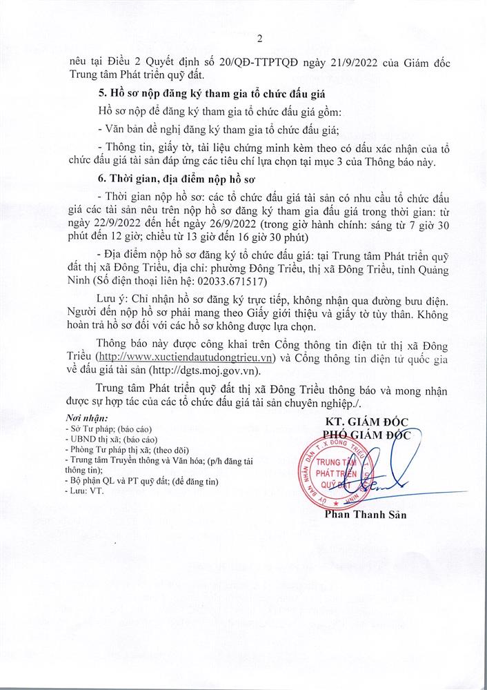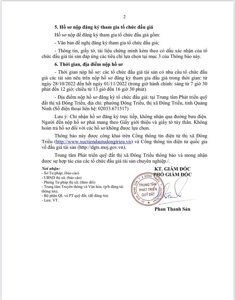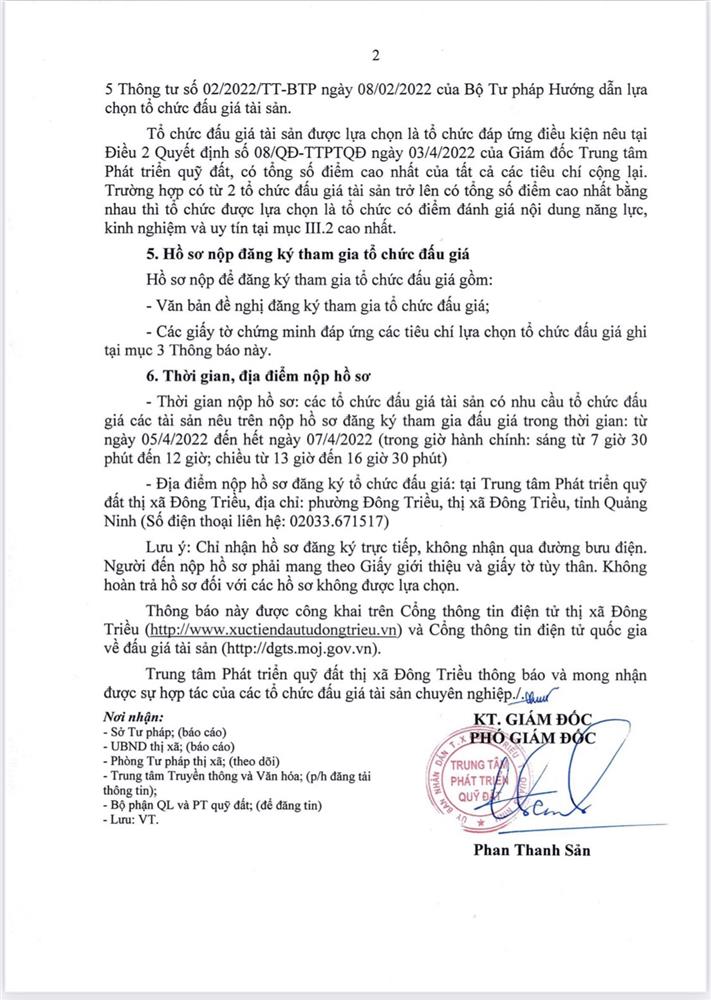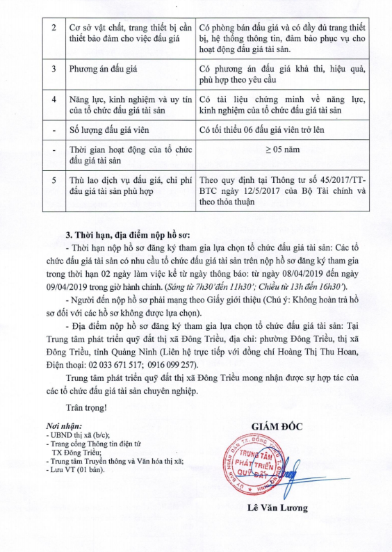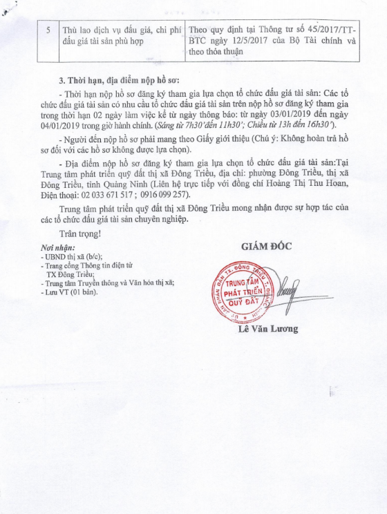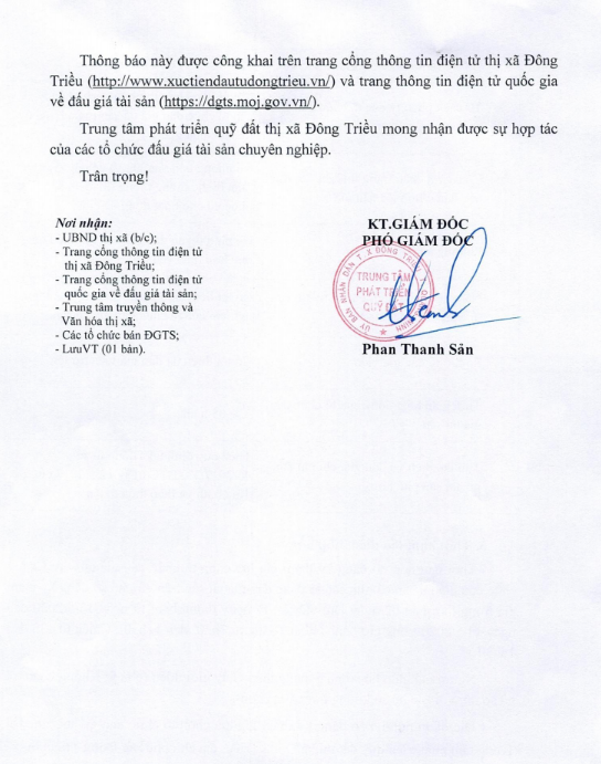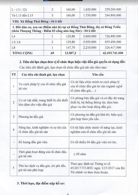 + Địa điểm mua hồ sơ: Tại UBND xã Hồng Thái Đông và Trung tâm phát triển quỹ đất thị xã Đông Triều.