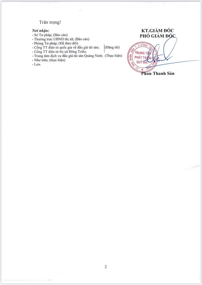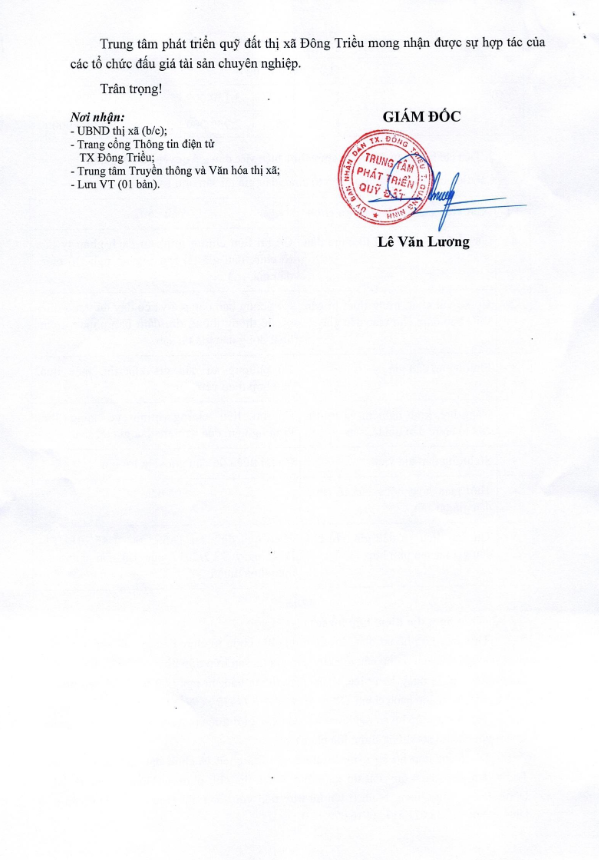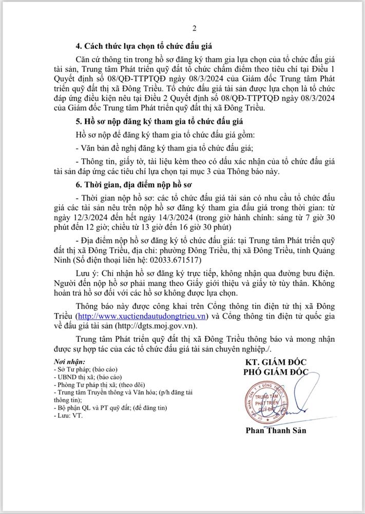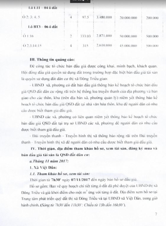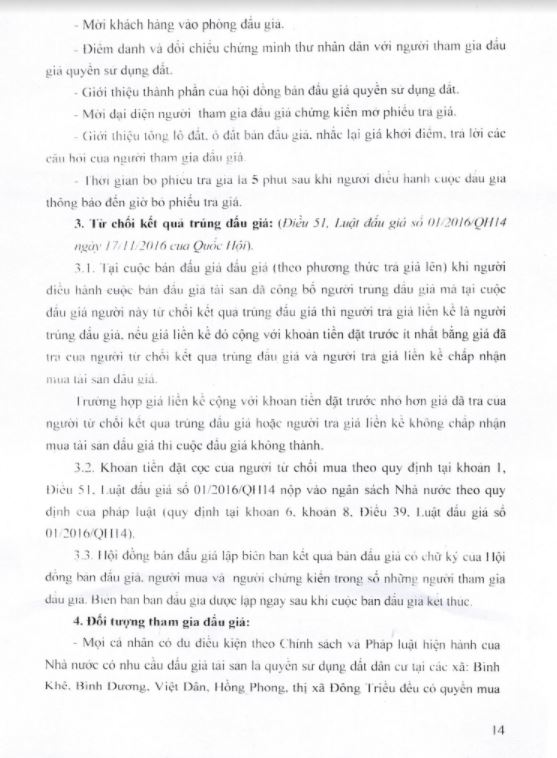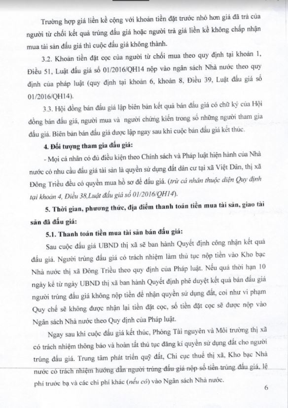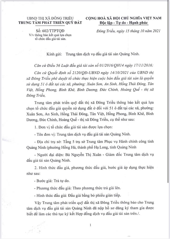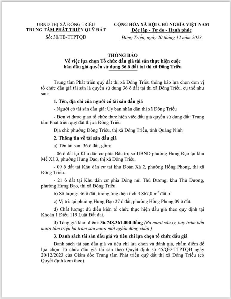 Để công tác tổ chức bán đấu giá được công khai, minh bạch, khách quan. Hội đồng đấu giá quyền sử dụng đất trong trường hợp đặc biệt bán đấu giá tài sản là quyền sử dụng đất dân cư thị xã Đông Triều giao UBND các xã, phường có đất bán đấu giá tổ chức bàn giao cho các thôn, khu (trên địa bàn xã, phường quản lý) thông báo kế hoạch tổ chức bán đấu giá QSD đất dân cư rộng rãi trên hệ thống loa truyền thanh của địa phương để nhân dân có nhu cầu sử dụng đất được biết tham gia đấu giá. Có Biên bản bàn giao, thông báo và niêm yết đến các thôn, khu và gửi Biên bản về UBND thị xã Đông Triều qua Trung tâm phát triển quỹ đất - cơ quan thường trực của Hội đồng đấu giá tài sản là QSD đất thị xã Đông Triều.