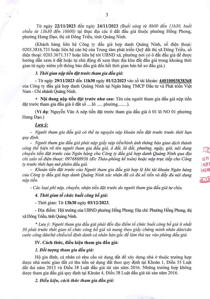 IV. Thời gian, địa điểm tham khảo hồ sơ, xem tài sản, đăng ký mua và bán đấu giá tài sản là QSD đất dân cư tại phường Mạo Khê: